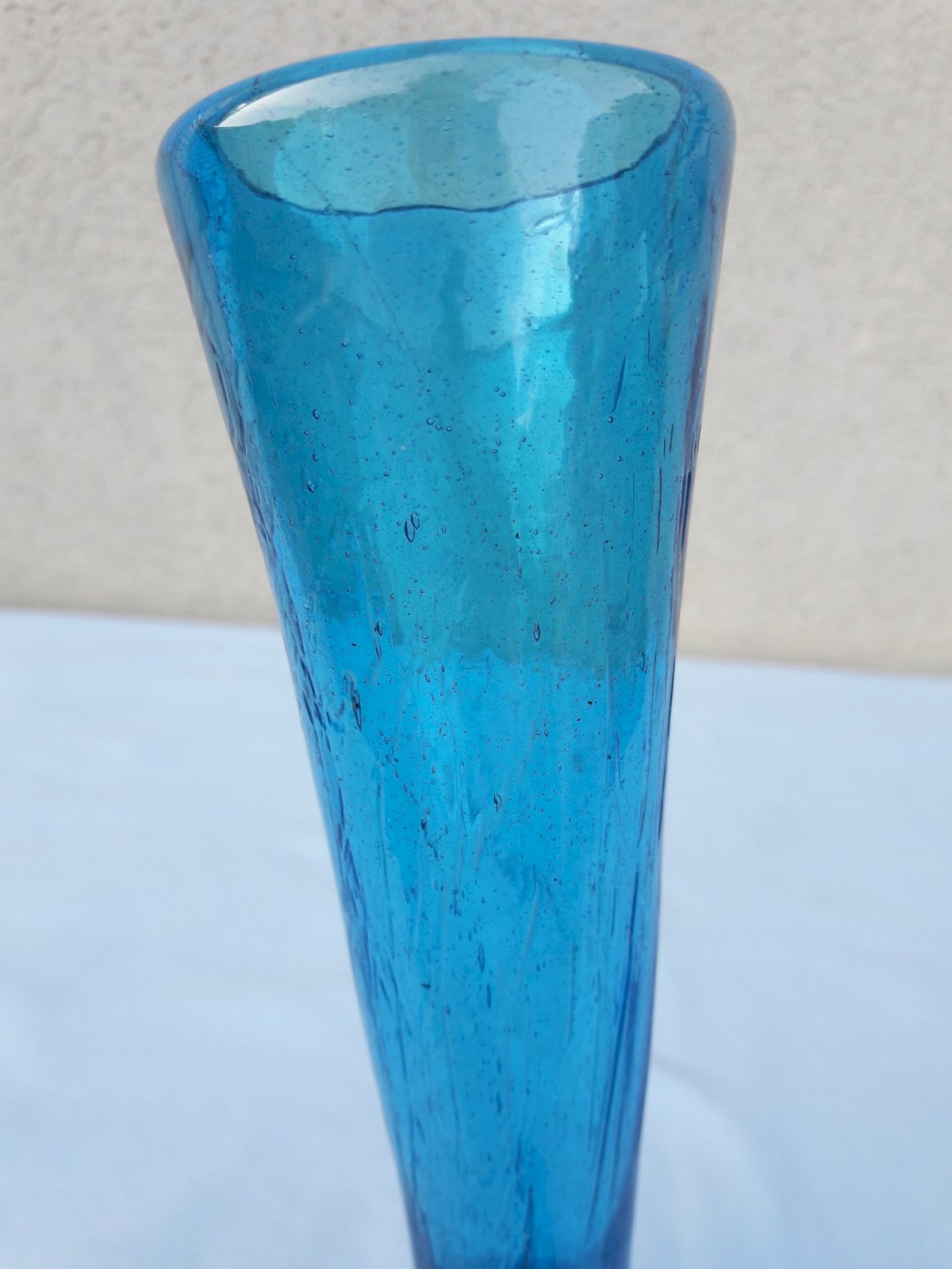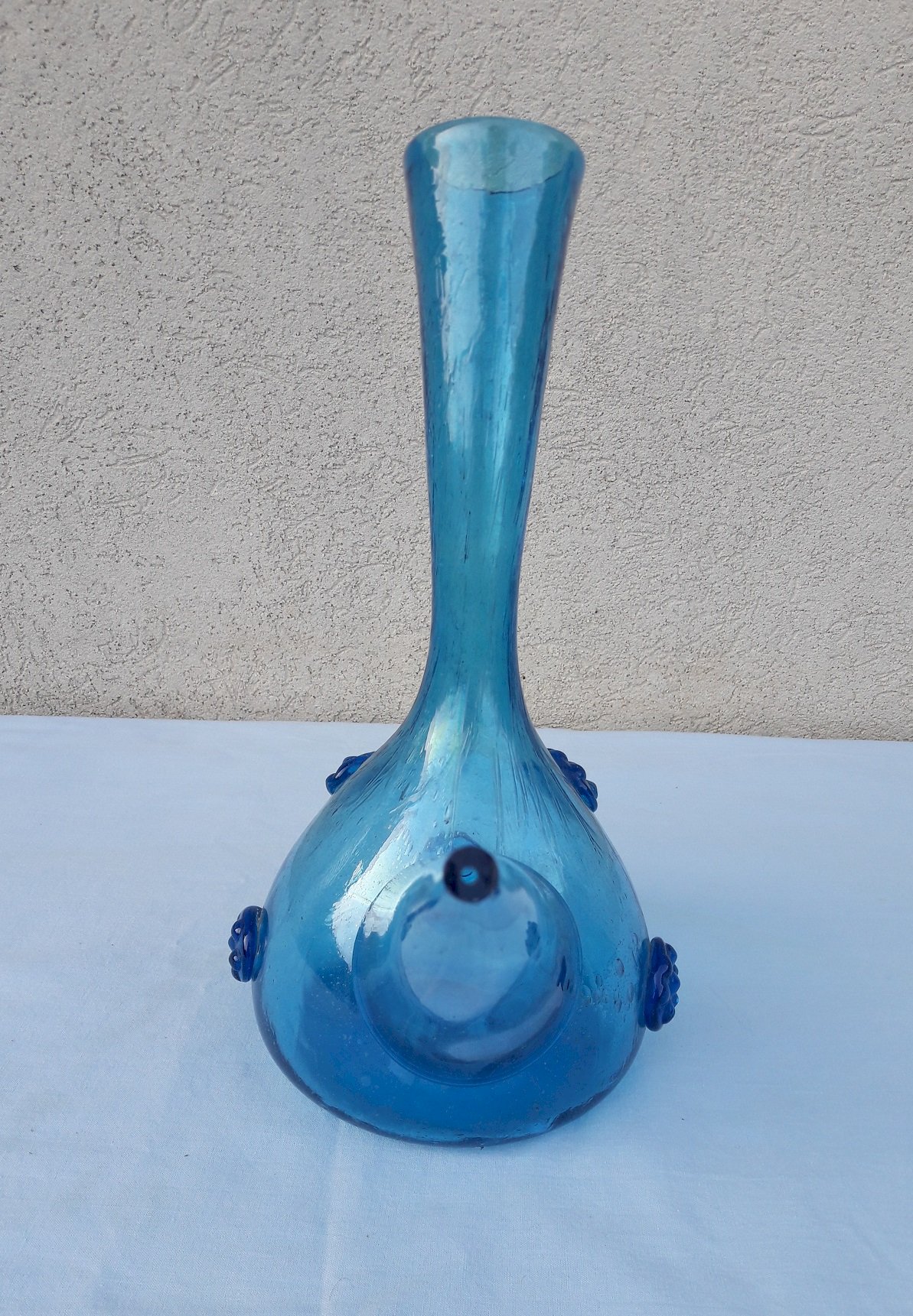 Blue bubbled glass pitcher, for drinking without a glass, named Porro in Spain.