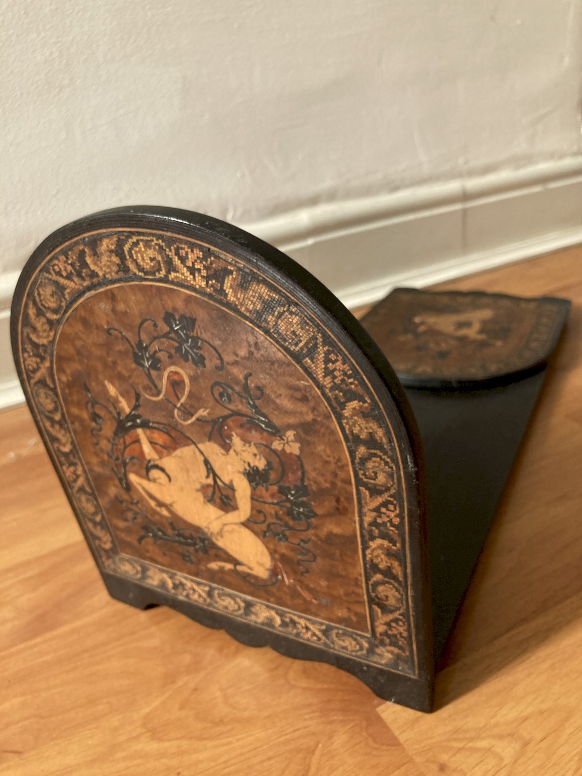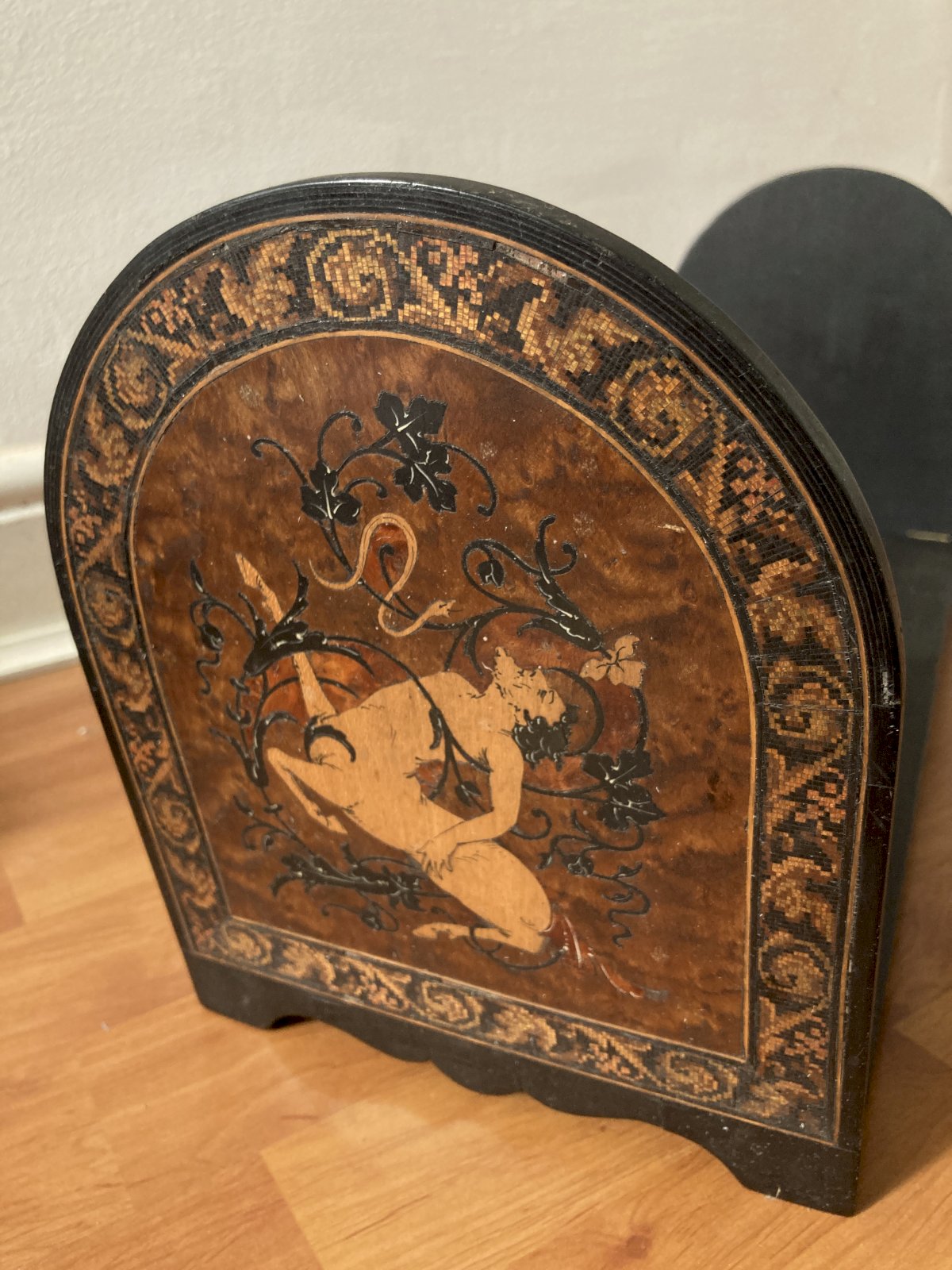 Bookends with divine creature marquetry decoration, Total length 46 cm, Width 17.8 cm, Height 21 cm.