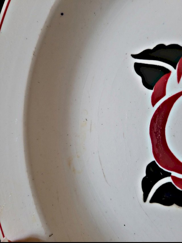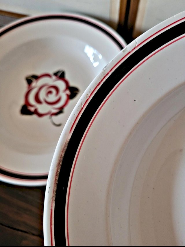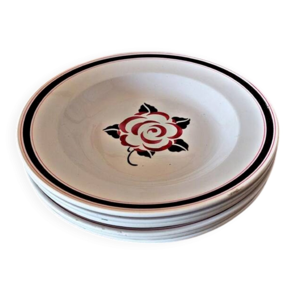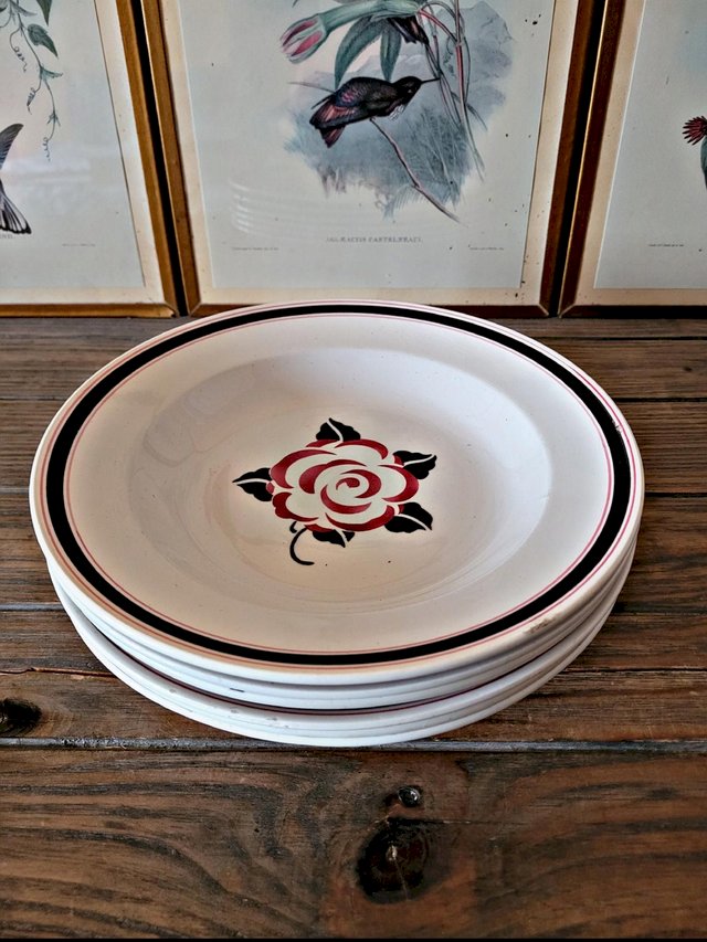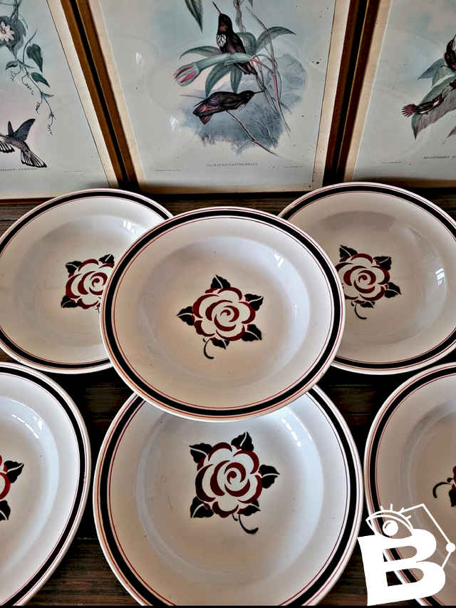 These 6 deep earthenware plates from Sarreguemines, model Noyon, immediately attract attention with their uncommon burgundy and black color! In the center, a burgundy rose with black leaves blooms intensely, framed by burgundy and black borders that accentuate the plate's silhouette with character. This model is decidedly out of the ordinary: far from classic and subdued floral patterns, it asserts a strong aesthetic! One can imagine these plates set on a characterful table during meals where adventurous tableware tells a story. Good condition, used (traces of cutlery, more marked on one plate, see photo), signs of use, small chip under one plate.