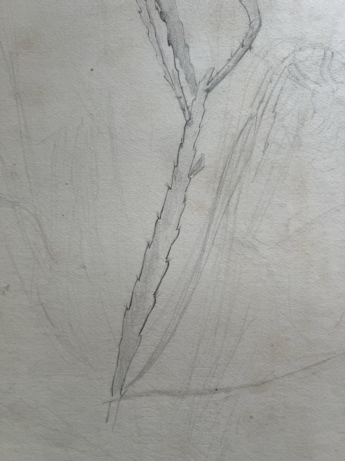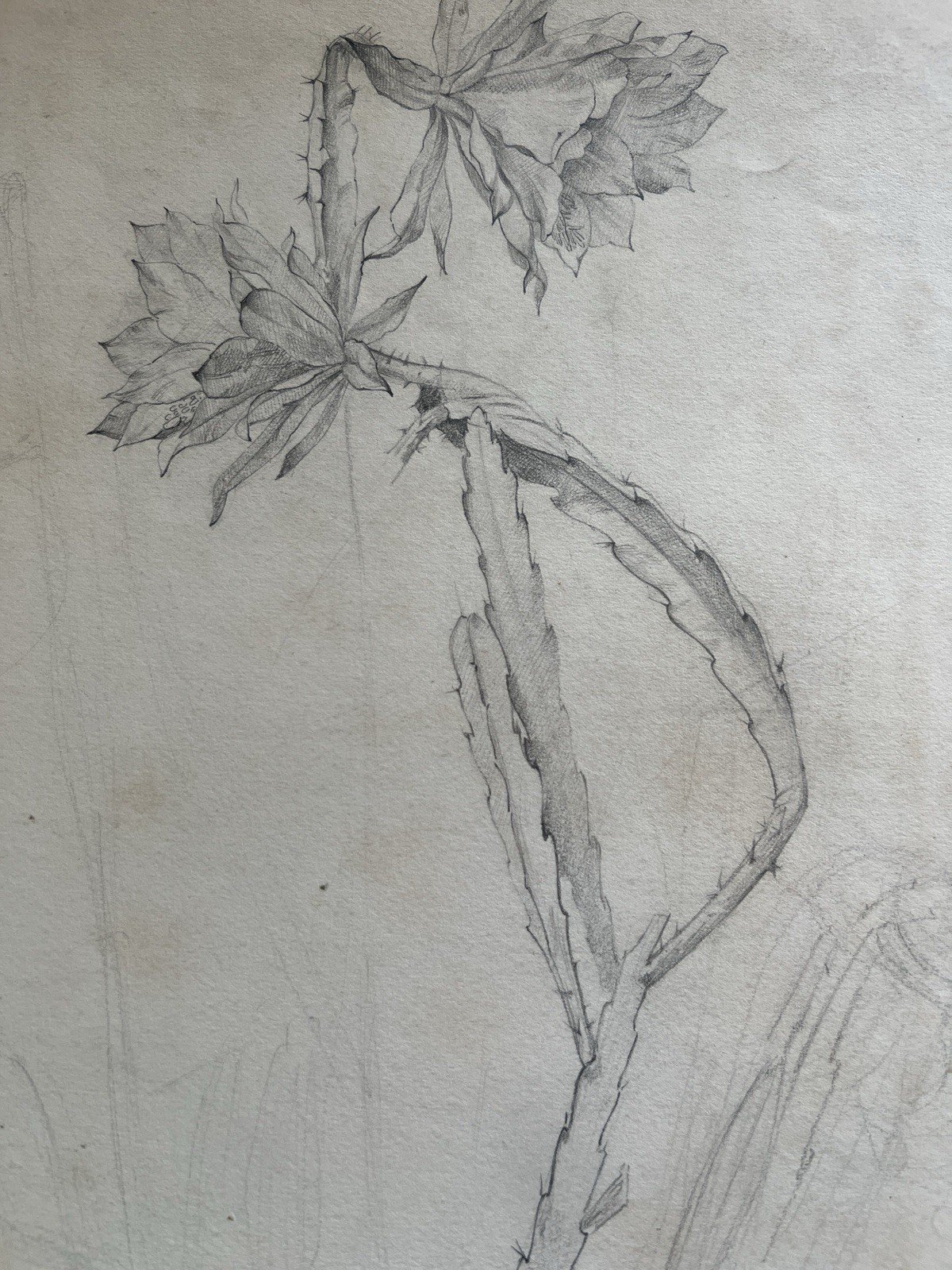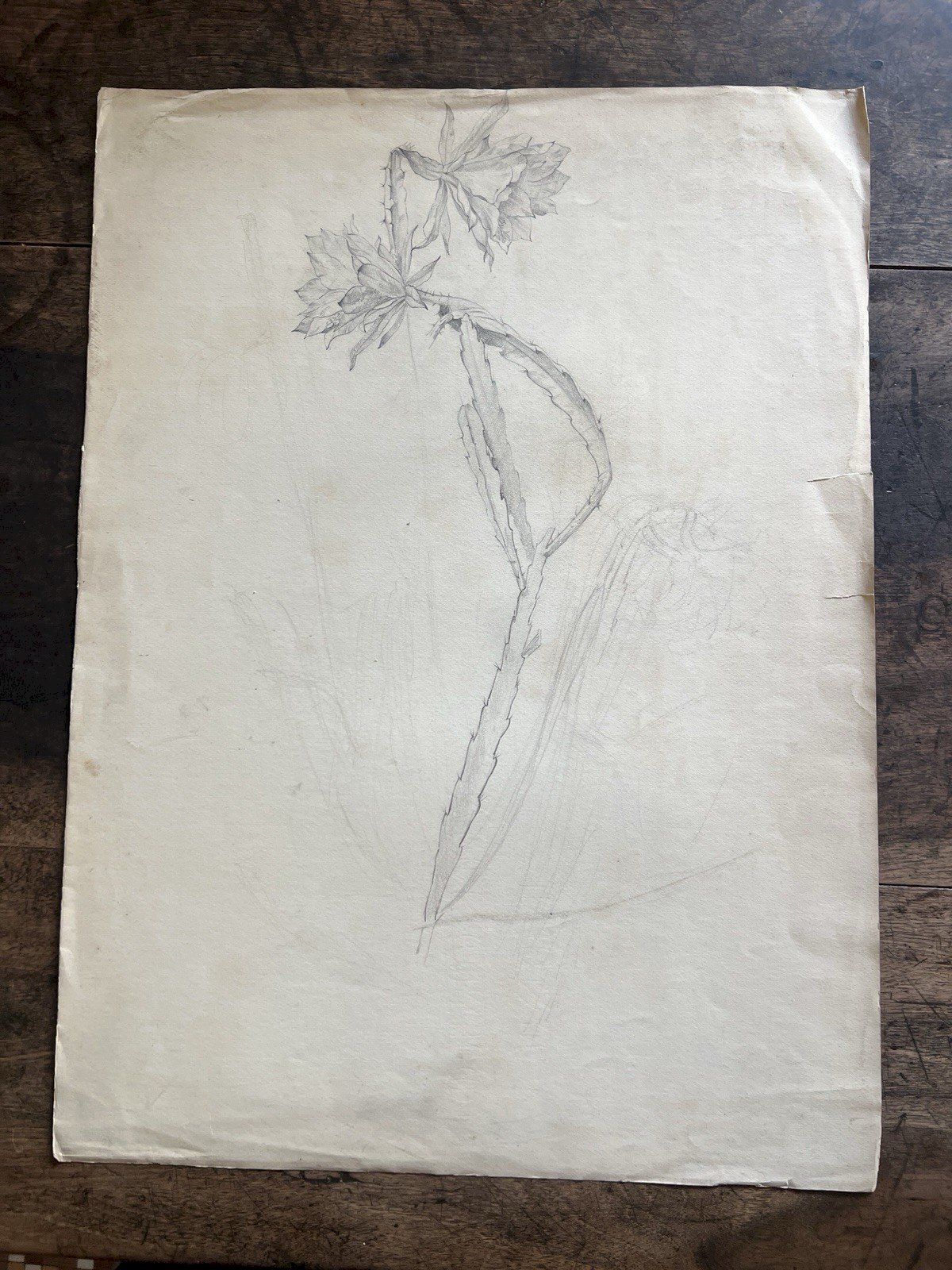 Large antique botanical drawing – study of flowering cacti – 19th century. Beautiful antique botanical study depicting a flowering epiphytic cactus, executed in graphite pencil on paper. The drawing shows the plant with its flat and serrated, slightly spiny stems, as well as several open and budded flowers, carried out with the careful observation typical of 19th-century naturalist studies. The depicted plant appears to be an epiphytic cactus of the Epiphyllum type (orchid cactus), known for its large spectacular flowers. These drawings were often created as academic exercises or scientific studies in art and botanical schools in the 19th century. Dimensions: approximately 52 cm × 38 cm. Technique: graphite pencil on paper. Period: 19th century. Condition: old paper with some tears and wear along the edges (see photos). The drawing itself remains well preserved. Blank verso. Beautiful naturalistic study that can be framed for decoration or botanical drawing collection. Photos are an integral part of the description. I have included a final photo of the plant to illustrate the plant depicted in the drawing. Of course, this plant is not included in the lot. Authenticity: Original. Type: Drawing. Period: 19th century and earlier. Material: Pencil. Genre: Study. Theme: Floral.
