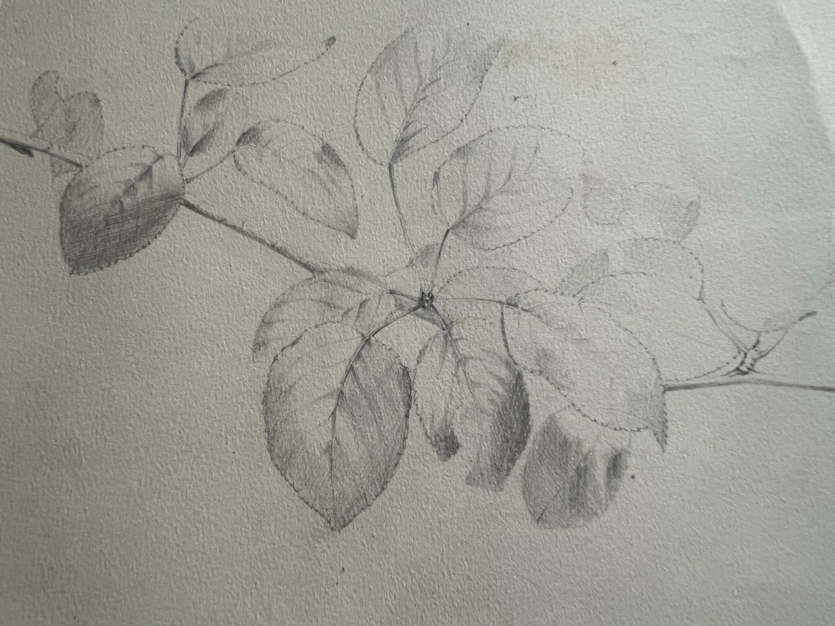 Large antique botanical drawing – plant study – 19th century Beautiful antique botanical study created in graphite pencil on paper, depicting a branch with leaves and buds, executed from nature. The drawing shows precise naturalistic observation work, typical of academic and scientific studies of the 19th century. This type of drawing was commonly produced in art or botanical schools for the study of plants. The stroke is light and sensitive, with a beautiful rendering of the volumes of the leaves and shadows. This drawing can be linked to botanical and naturalist studies of the 19th century, often used as workshop exercises or preparatory studies. Very decorative, it can be easily framed under a mat. ⸻ Technique: graphite pencil on paper Period: 19th century Dimensions: approximately 45 cm × 28.5 cm Condition: old paper showing some wear and tears at the edges as well as signs of time (see photos). The drawing remains well legible. Reverse blank with signs of time. The photos are an integral part of the description. Authenticity: Original Type: Drawing Period: 19th century and earlier Material: Pencil Genre: Study Theme: Floral