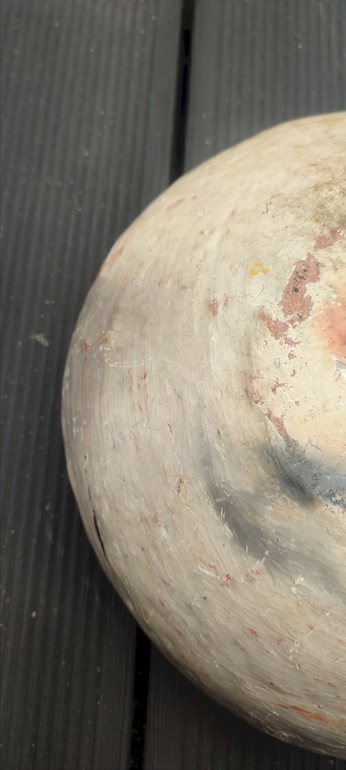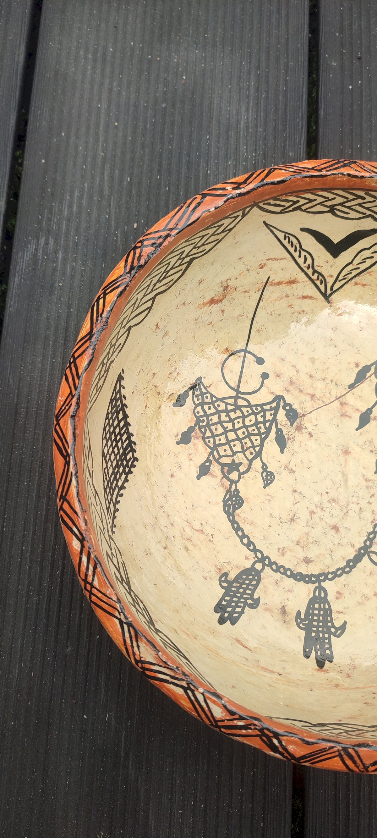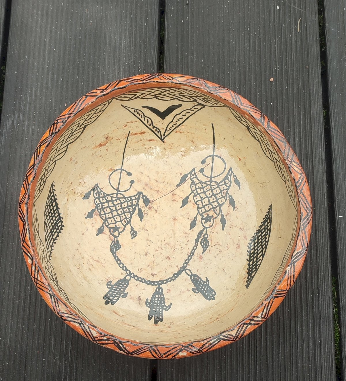 This ancient Berber terracotta salad bowl is a piece crafted by hand using the traditional coil technique. The object features a rich interior decoration filled with protective symbols, including Khamsas (hands of Fatima) and stylized fibulas, painted with natural mineral oxides. Its ancestral craftsmanship is confirmed by the carbon nuances visible on the back, indicating artisanal cooking in an open pit. The surface has been burnished with stone to achieve a satin finish without the use of chemical varnish. Ideal for ethnic decoration or as a serving dish for dry foods. Very good condition with only slight signs of wear. Diameter of 23 cm and a height of 7 cm.