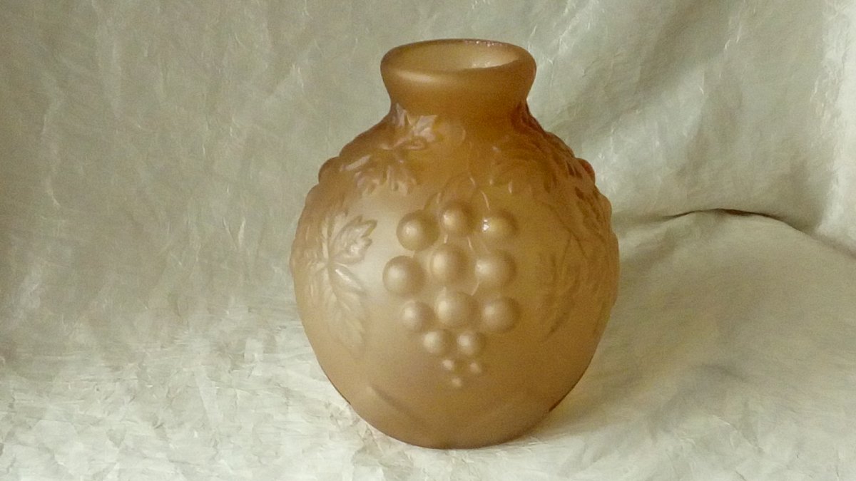 VERY BEAUTIFUL ART DECO ROUND VASE MADE OF FROSTED MOLDED AND PRESSED GLASS, DECORATED WITH GRAPE CLUSTERS, SIGNED PRIOR FRANCE, TRADEMARK, HEIGHT 19 cm, WIDTH 14 cm, CHIP ON THE EDGE OF THE OPENING.