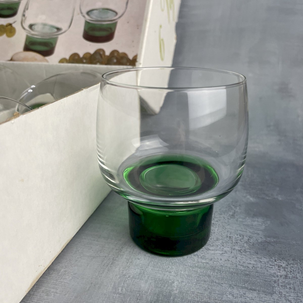 Box of 6 LUMINARC glasses model VIGNE vintage green base 3 sizes to choose from Small 14cl. Height ~8cm Ø drinking ~6cm / Weight 1 box ~ 1 kg Medium 20cl. Height ~8.5cm Ø drinking ~6.5cm / Weight 1 box ~ 1.2 kg Champagne flute 27cl. Height ~8.5cm Ø drinking ~8.5cm / Weight 1 box ~ 1.5 kg The glasses are new or in excellent condition, some still have their original label, the boxes are dirty and damaged, see photos Remember to combine your purchases to reduce shipping costs! Country of origin: France