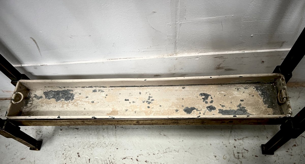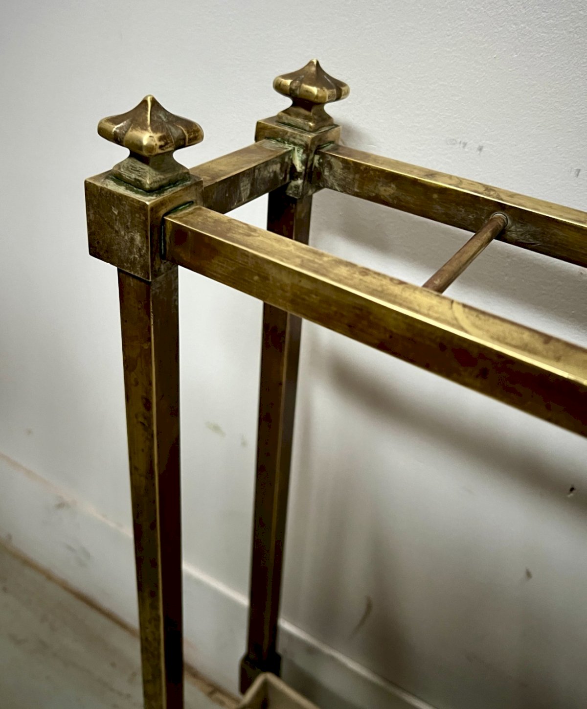 Brass umbrella stand Made of square brass tubes Water catchment tray is made of painted iron Good condition Dimensions H 54 x W 53 x D 13 cm Period Early 20th century Design style 20th century Origin: France Country of origin: France Height: 54 Material: Brass Length: 53 Width: 13