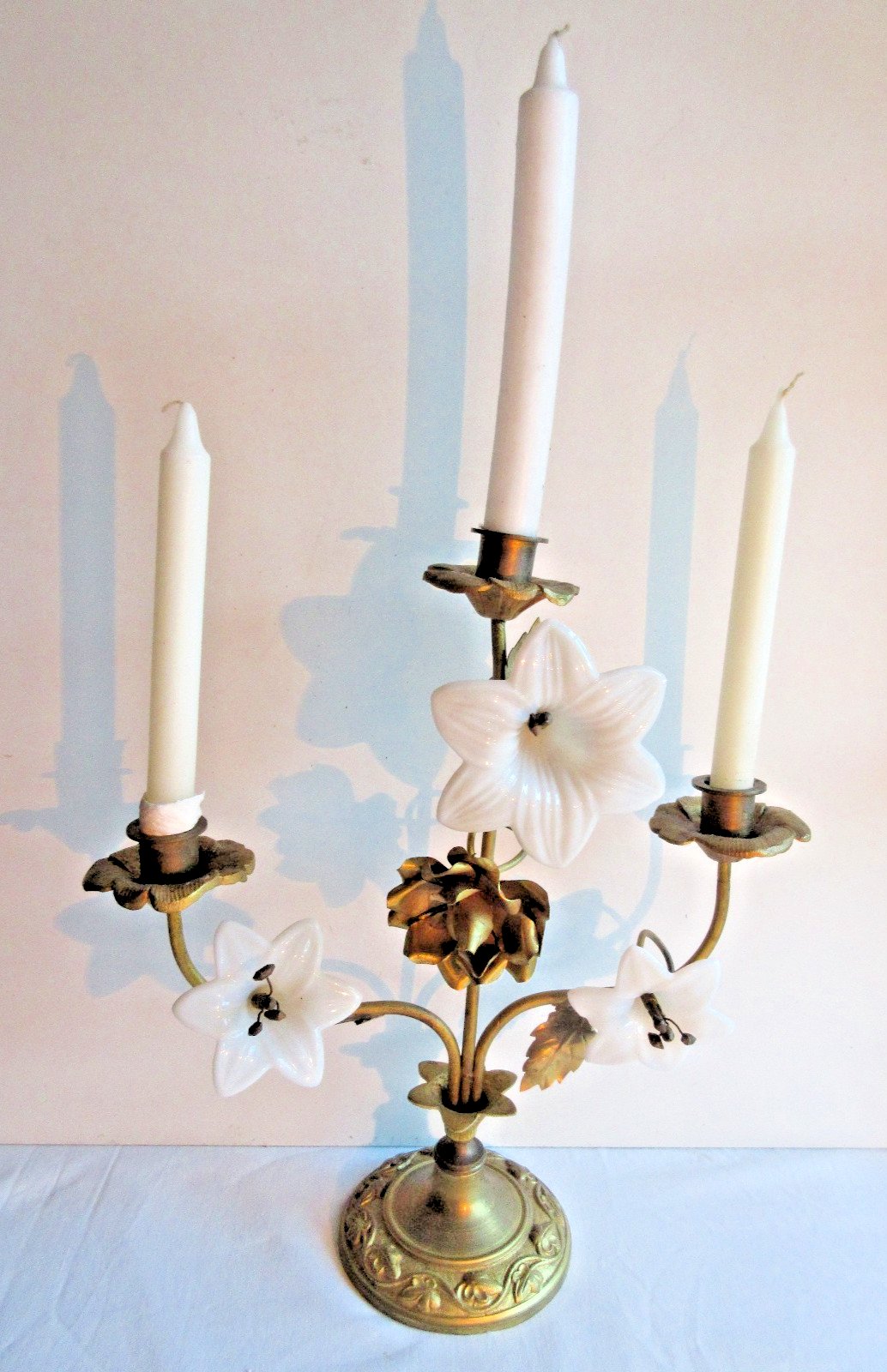 Worldwide sale. Early 20th-century church candlestick. Gilded brass candlestick composed of a brass rose and 3 white porcelain fleurs-de-lis. Three-armed candlestick with 3 candle holders whose drip pans are shaped like flowers. Height: total: 33 cm. Width: 30 cm. 2 flowers measure 7 cm in diameter. The one on top measures 10 cm. In the center, the small rose with many petals measures: 7 cm. The whole piece rests on a round base of 11 cm. It appears to be in good condition, but the fleur-de-lis at the top does not hold onto its stem. It stays in place thanks to a small piece of paper, see photo. Otherwise, it is in perfect condition. Collectible candlestick for lovely decor. Authenticity: Original Type: Display item, Decorative Origin: France Subtype: Glass Country of manufacture: France Style: Napoleon III Material: Porcelain