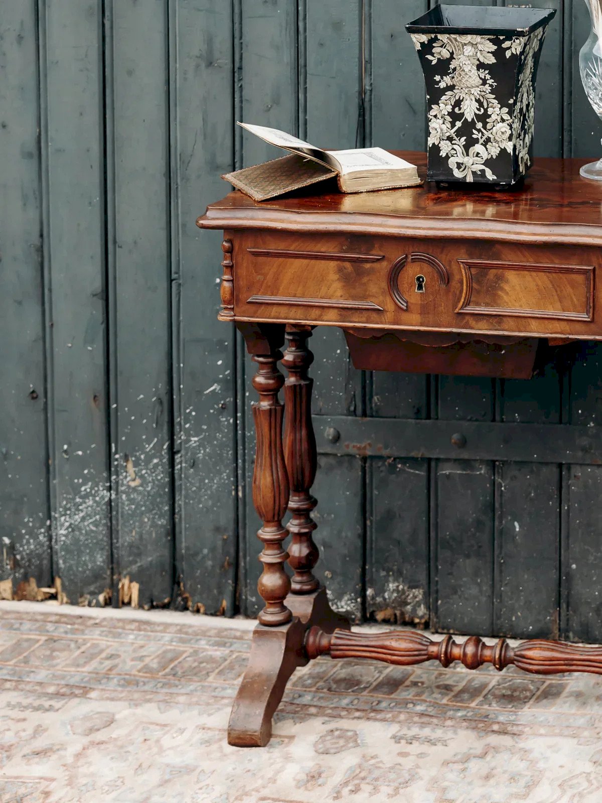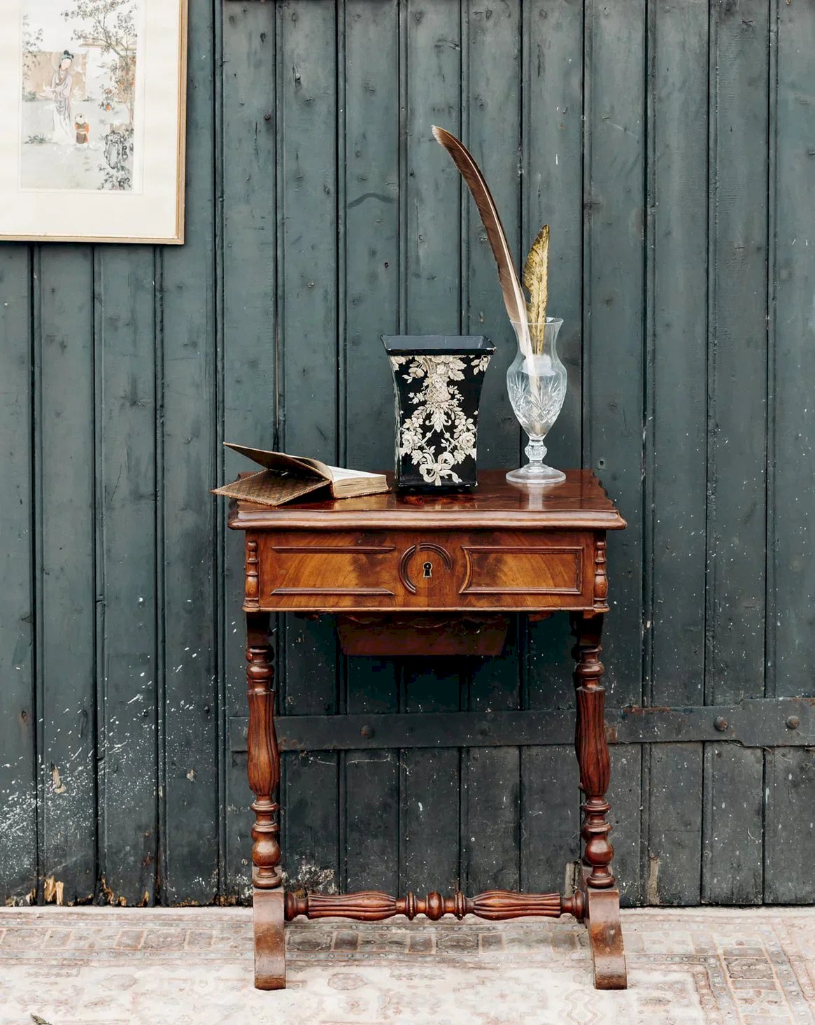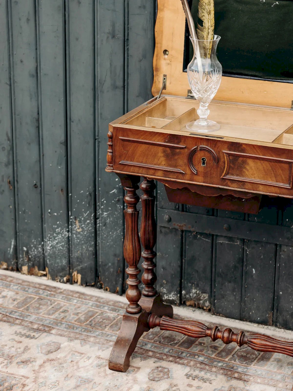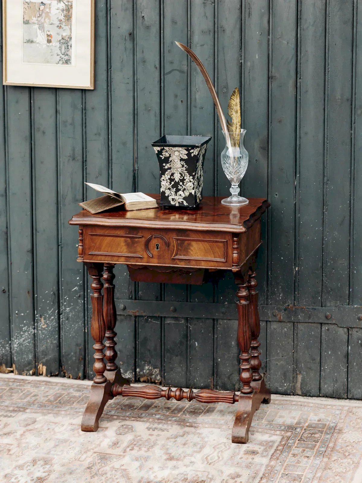 Discover this elegant wooden work table, both practical and warm. Featuring a hidden drawer and multiple interior storage options, it allows you to organize your items with style. Its removable compartmentalized top adds an extra functional touch. Despite some signs of wear and a lack of wood on the front, its vintage charm makes it a unique piece, full of history and character. Sold without a key. Length: 54 cm Height: 66 cm Drawer height: 7.5 cm Depth: 37 cm Condition: Used: Item has been used. Item shows some signs of superficial wear... Used: Item has been used. Item shows some signs of superficial wear, fully operational and functioning correctly. It may be a demonstration model or an item returned to store after a short period of use. Any imperfections. Brand: Debongout Type: Thrifted product Material: Wood Style: Country Custom: Work tables