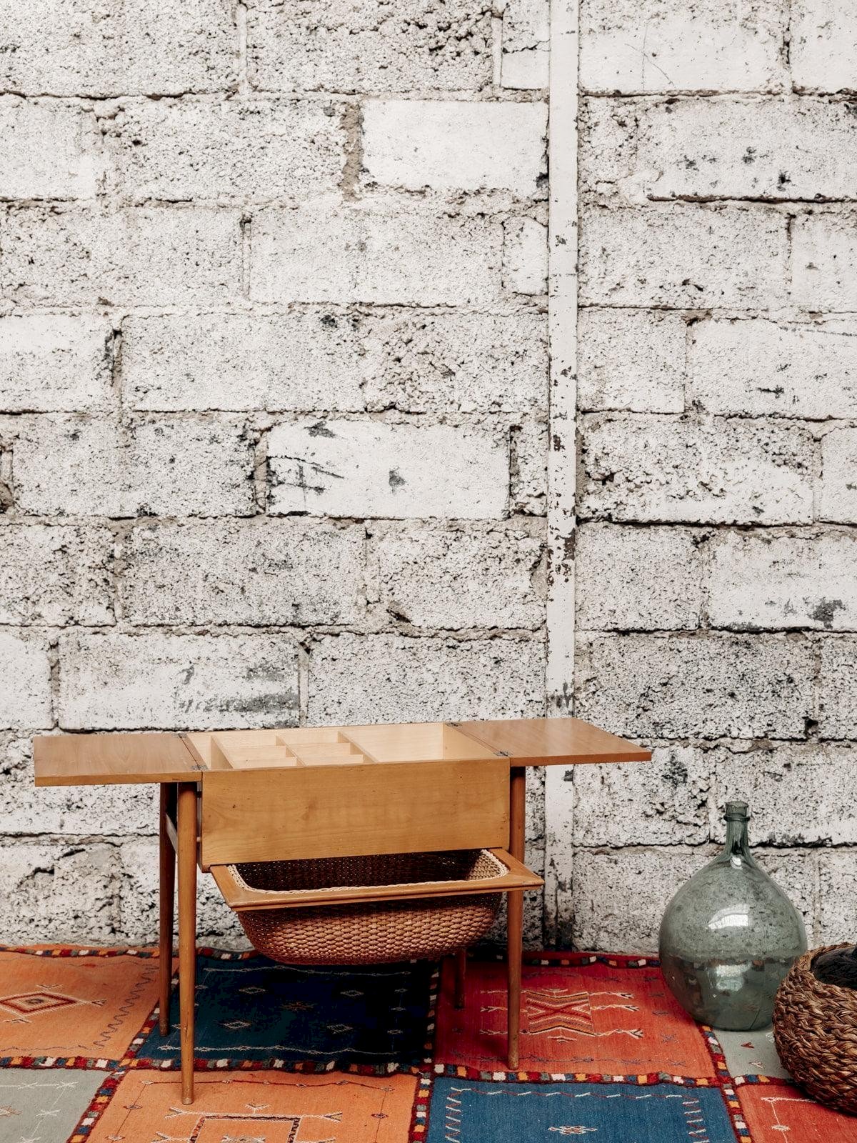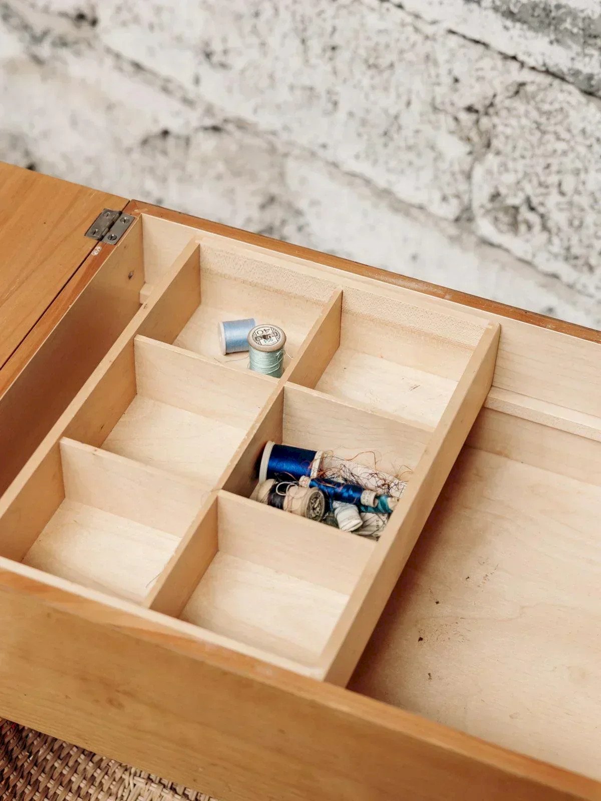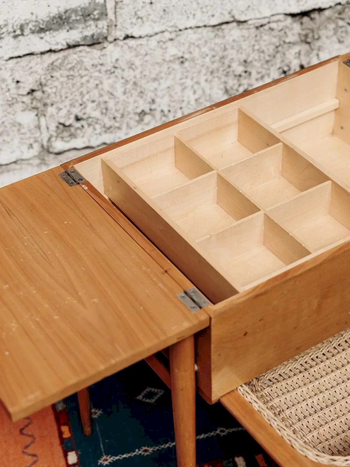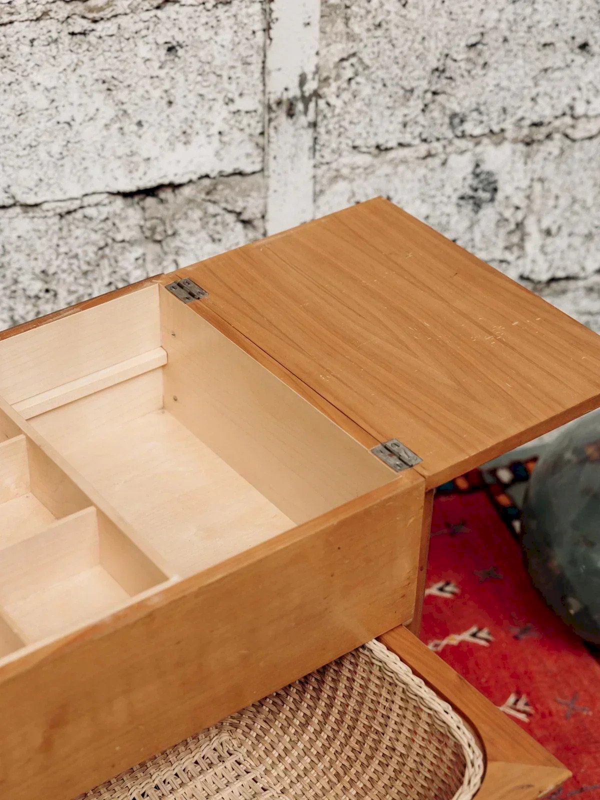Add a touch of vintage charm to your space with this small period wooden work table. It features a storage compartment with small cubbies as well as a drawer with a small basket underneath (initially for storing balls of yarn). With its delicate design and neat finishes, it is perfect for organizing and displaying your work items or favorite objects. Its compact size makes it an asset for small spaces while maintaining great functionality. Web exclusive, the meeting will take place at your home! Length: 58 cm Length with doors open: 100 cm Height: 55 cm Depth: 39 cm Condition: Used: Item has been used. Item shows some superficial signs of wear... Used: Item has been used. Item shows some superficial signs of wear, fully operational and working correctly. It may be a demonstration model or an item returned to the store after a short period of use. Any imperfections. Brand: Debongout Type: Thrifted product Material: Wood Style: Country Custom: Work tables