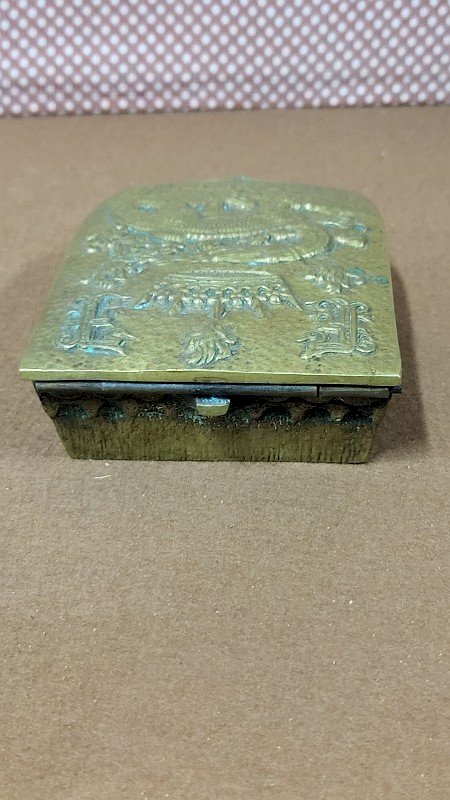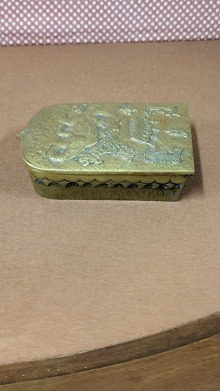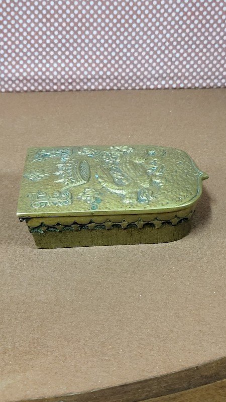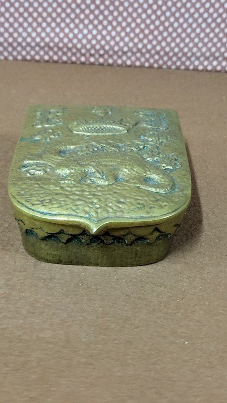 superb bronze card box by Max Le Verrier, it is in very good condition with a beautiful patina featuring a dragon. It is monogrammed "FF" and measures 8.3 cm wide, 11.7 cm deep, and 3.2 cm thick. Type: Display object, Decorative Subtype: Box Material: Bronze