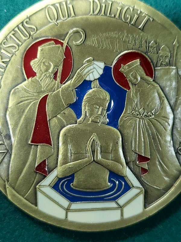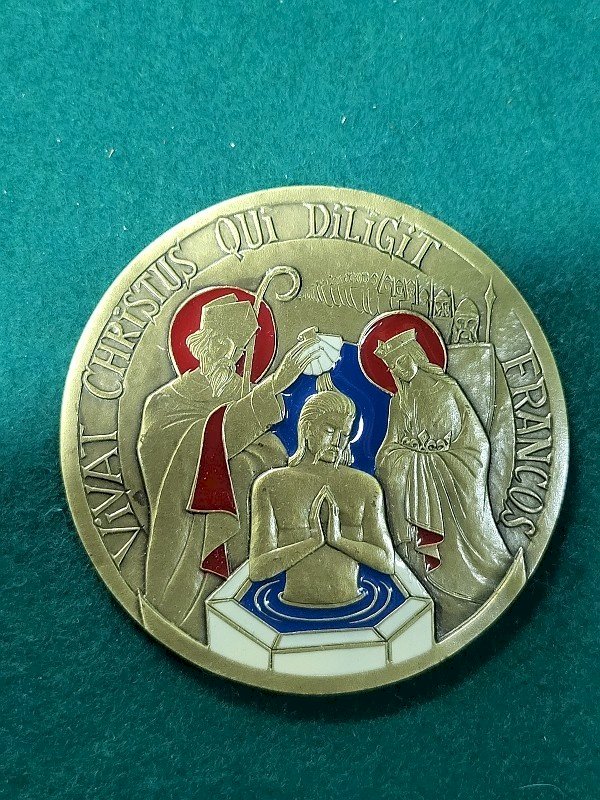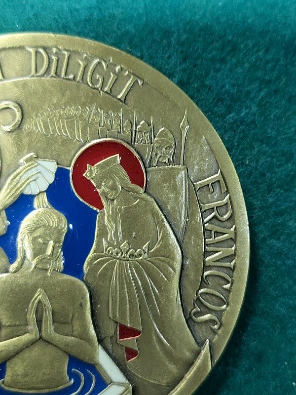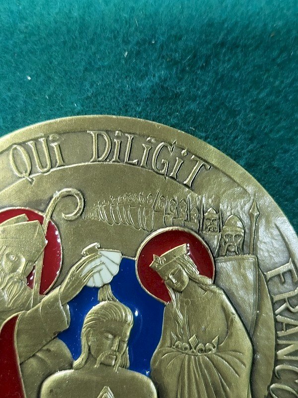 superb enameled bronze tabletop medal Baptism of Clovis Vivat Christus qui diligit Francos Sanctus Spiritus Incolumba Appa Ruit Donosigularis Gratiae it is in very good condition it is a very beautiful piece it measures 7.2 cm in diameter Type: TABLE MEDAL Sub-type: Medal Country, Organization: France Country of origin: Metropolitan France