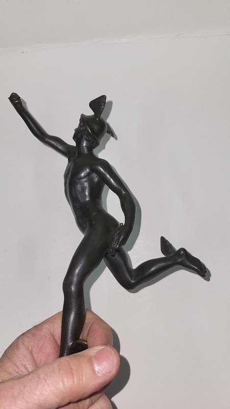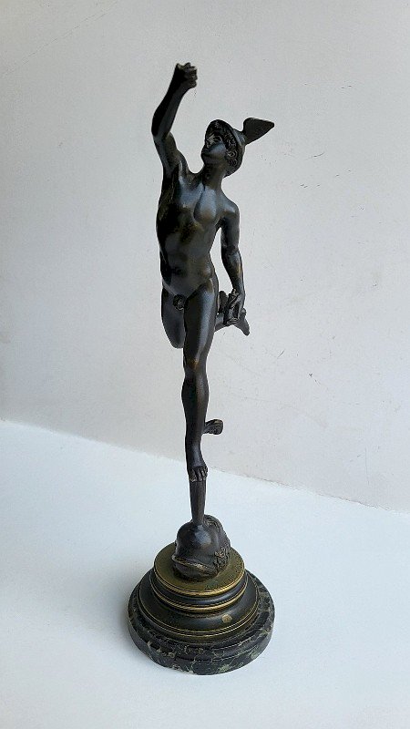 very beautiful bronze statue of Mercury by Jean de Bologna on a marble base it is in good condition it is a bit twisted so it leans slightly backwards but it stands up the caduceus and the index finger of the right hand are missing there are some chips on the marble base it measures 32 cm high, 17 cm deep, and 9.3 cm in diameter for the base Type: Statue, Sculpture Country of origin: Metropolitan France Material: Bronze