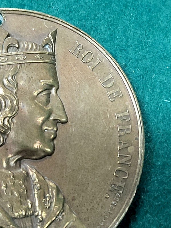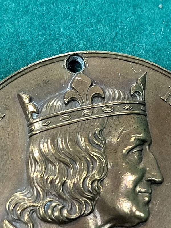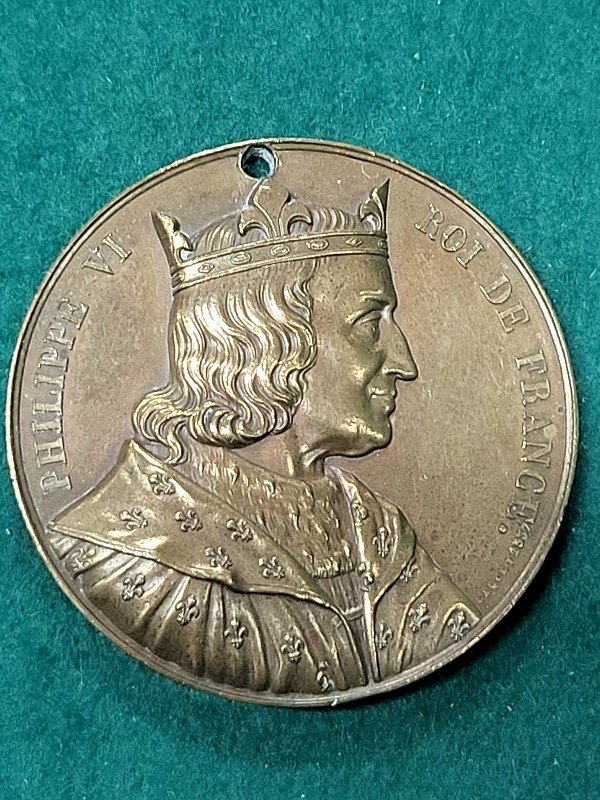 stunning tabletop medal in bronze Philippe VI King of France it is in good condition it has a hole above the crown it is a beautiful medal its weight is 73.41 grams it measures 5.3 cm in diameter Country of origin: Metropolitan France