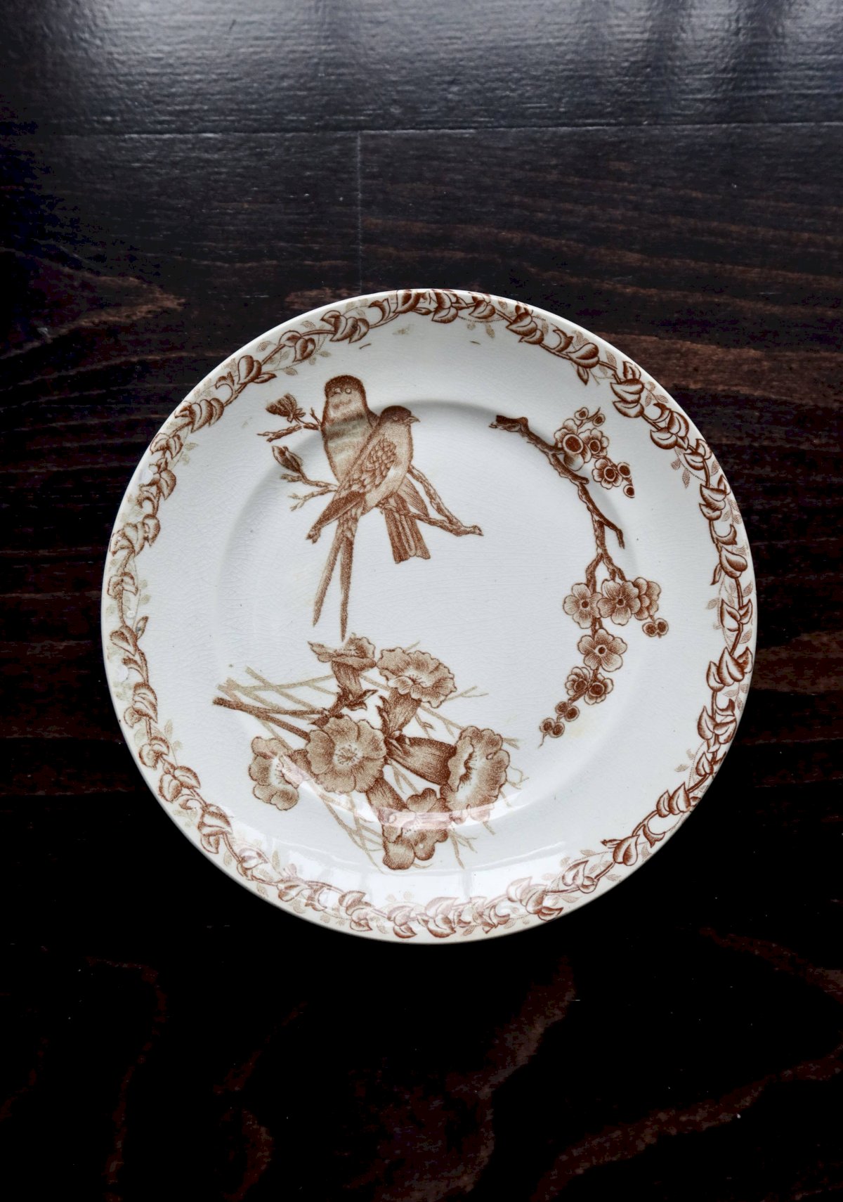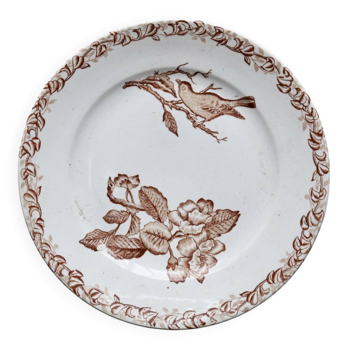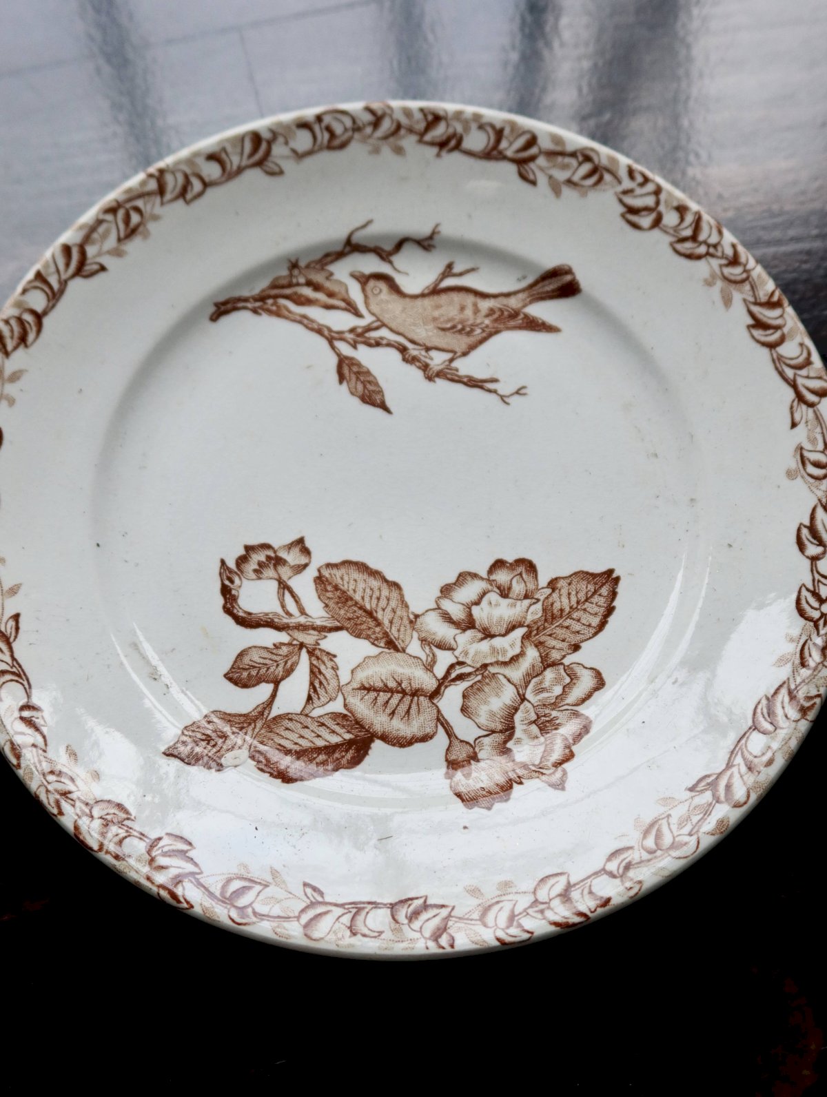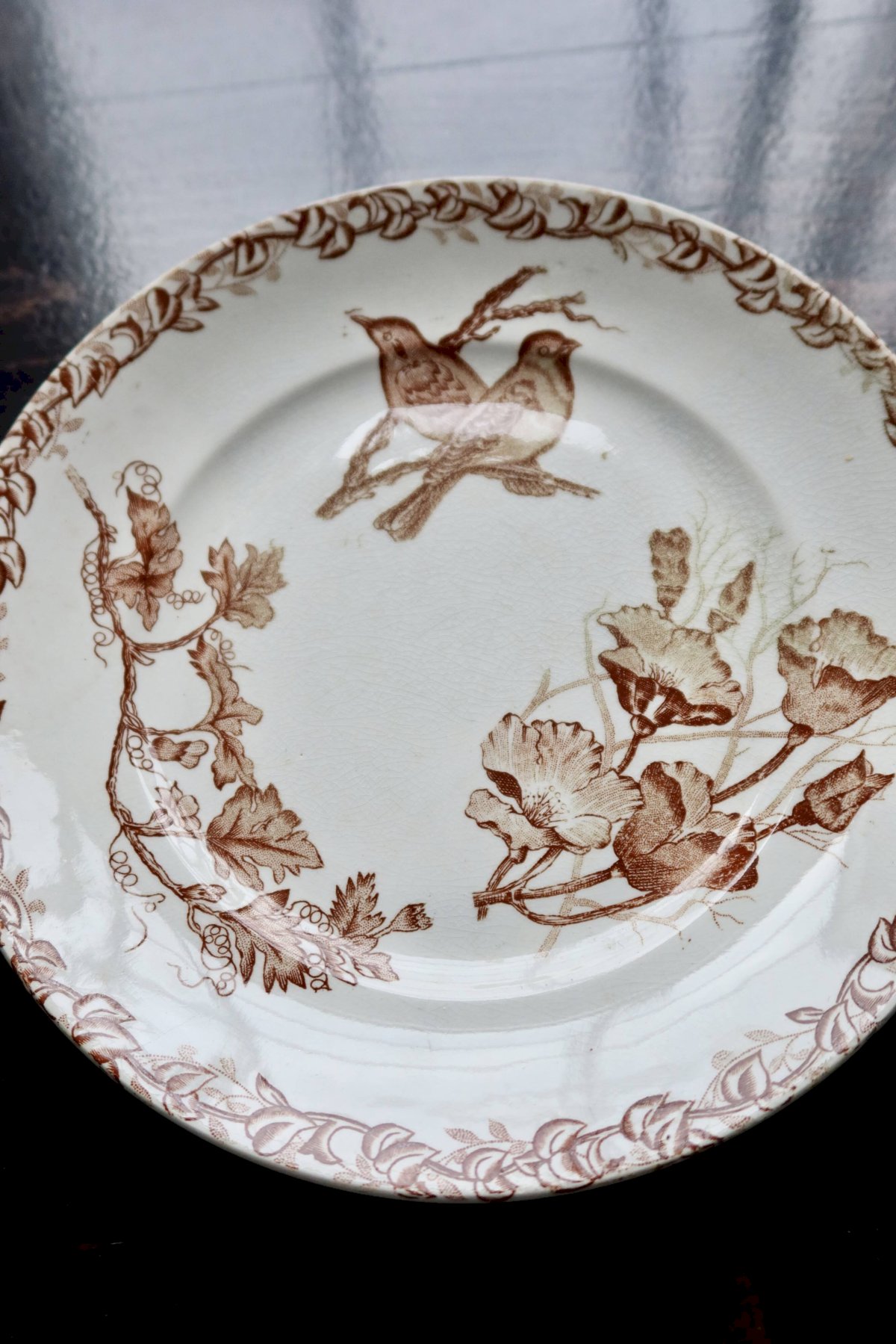 Antique dessert plate made of ironstone from the Onnaing pottery, part of the Fleurs Jetées series, featuring a finely detailed sepia brown decor depicting birds, branches, and wildflowers. Each plate has a different pattern, making every piece unique and particularly decorative, typical of French productions from the late 19th century. Sold individually: please specify the desired model when ordering from the visible patterns, subject to availability. Dimensions: 21.5 cm in diameter. L: 21 W: 21 H: 1