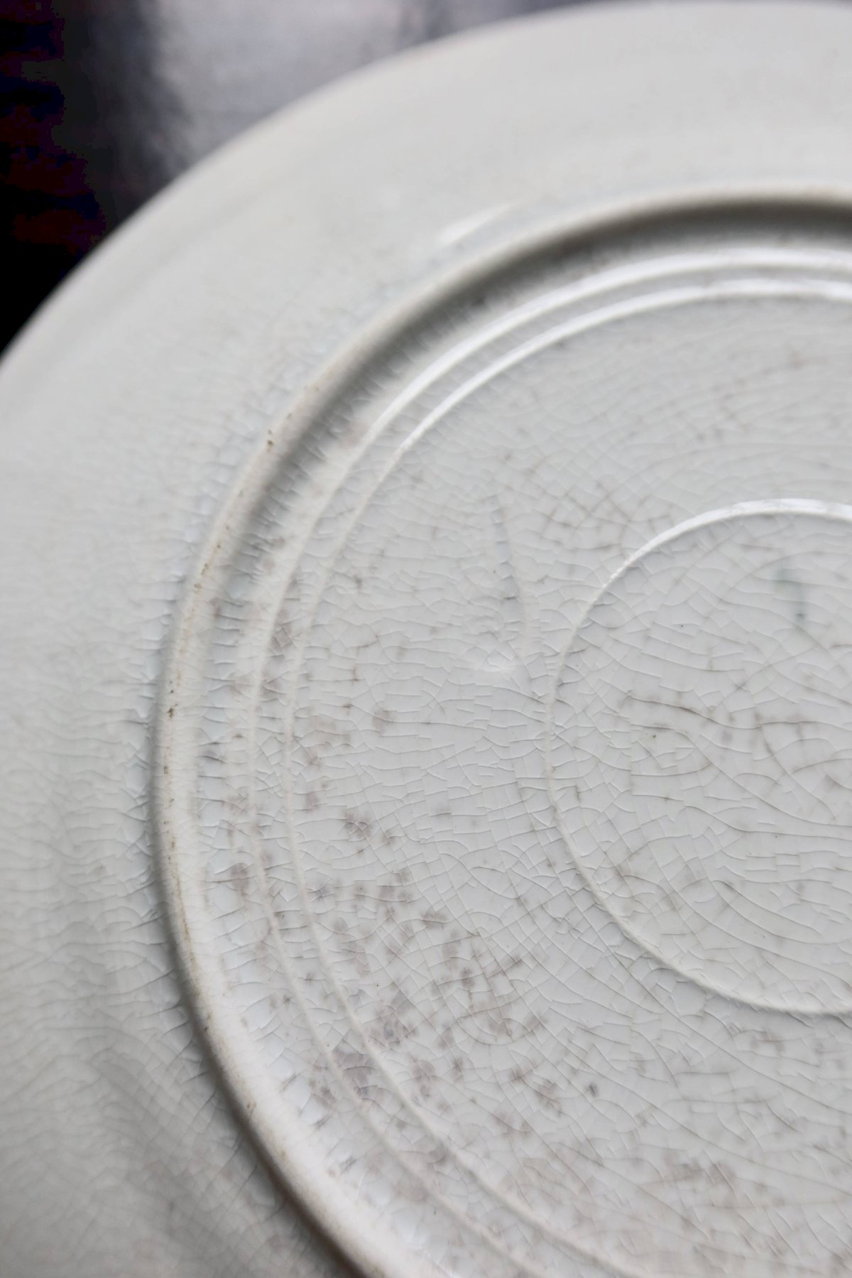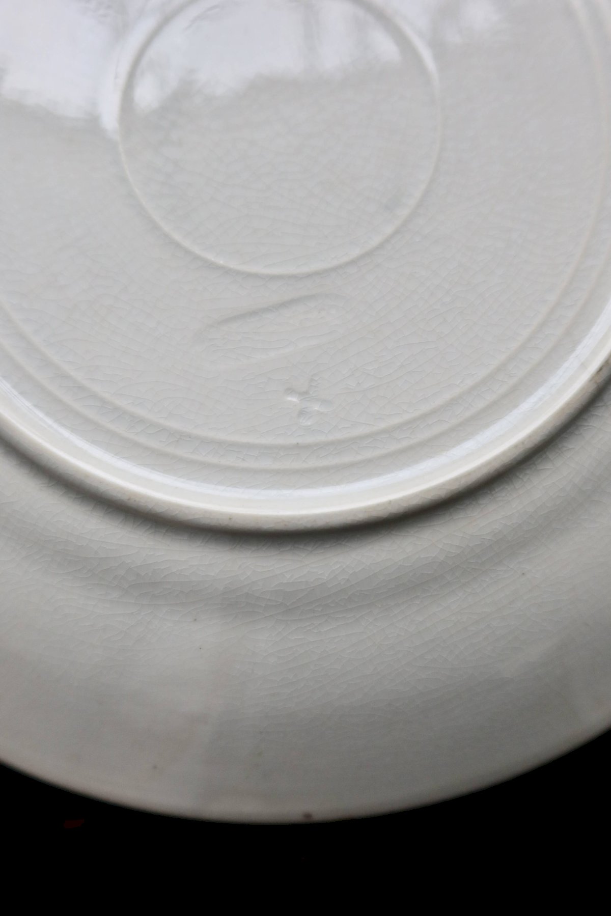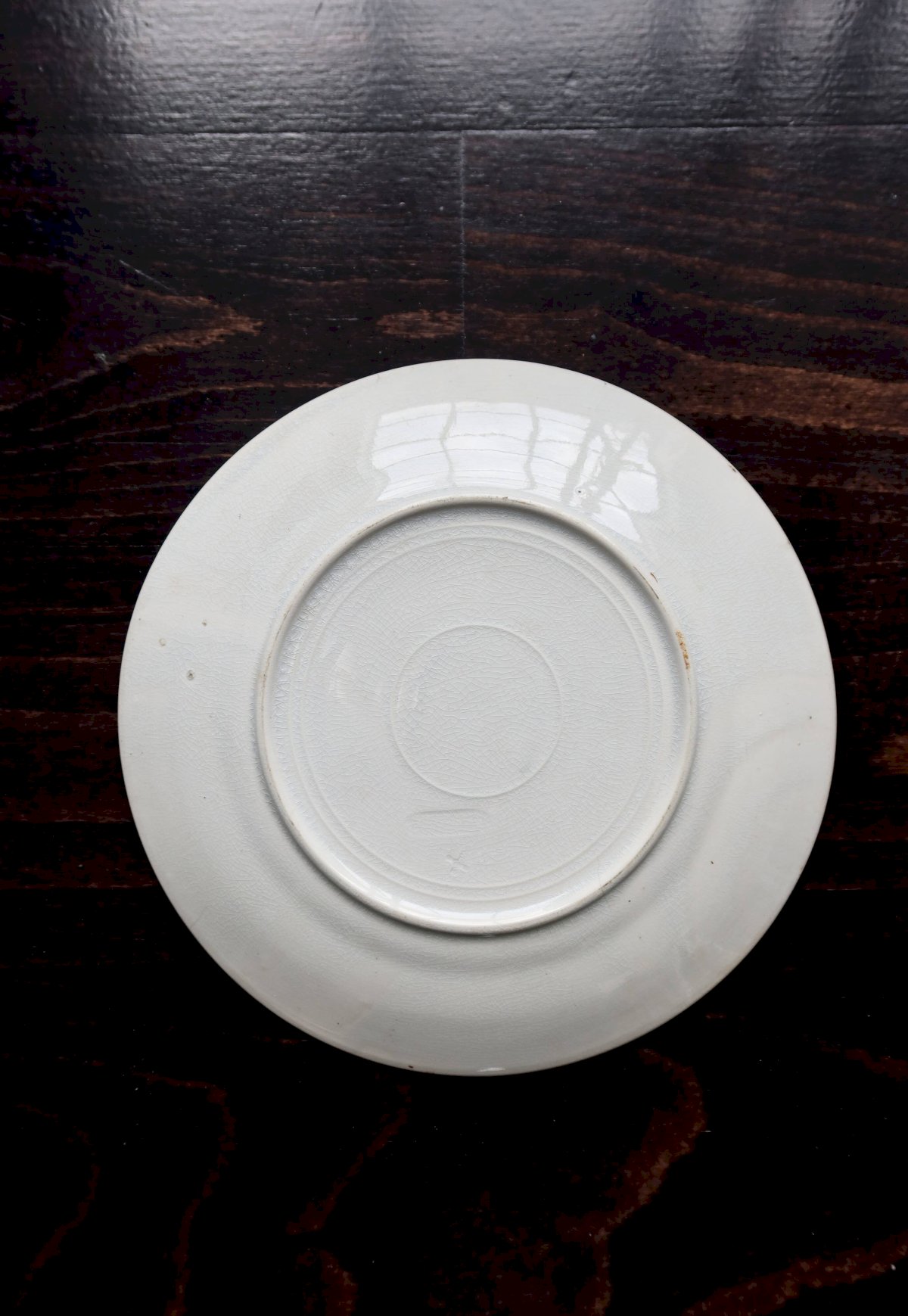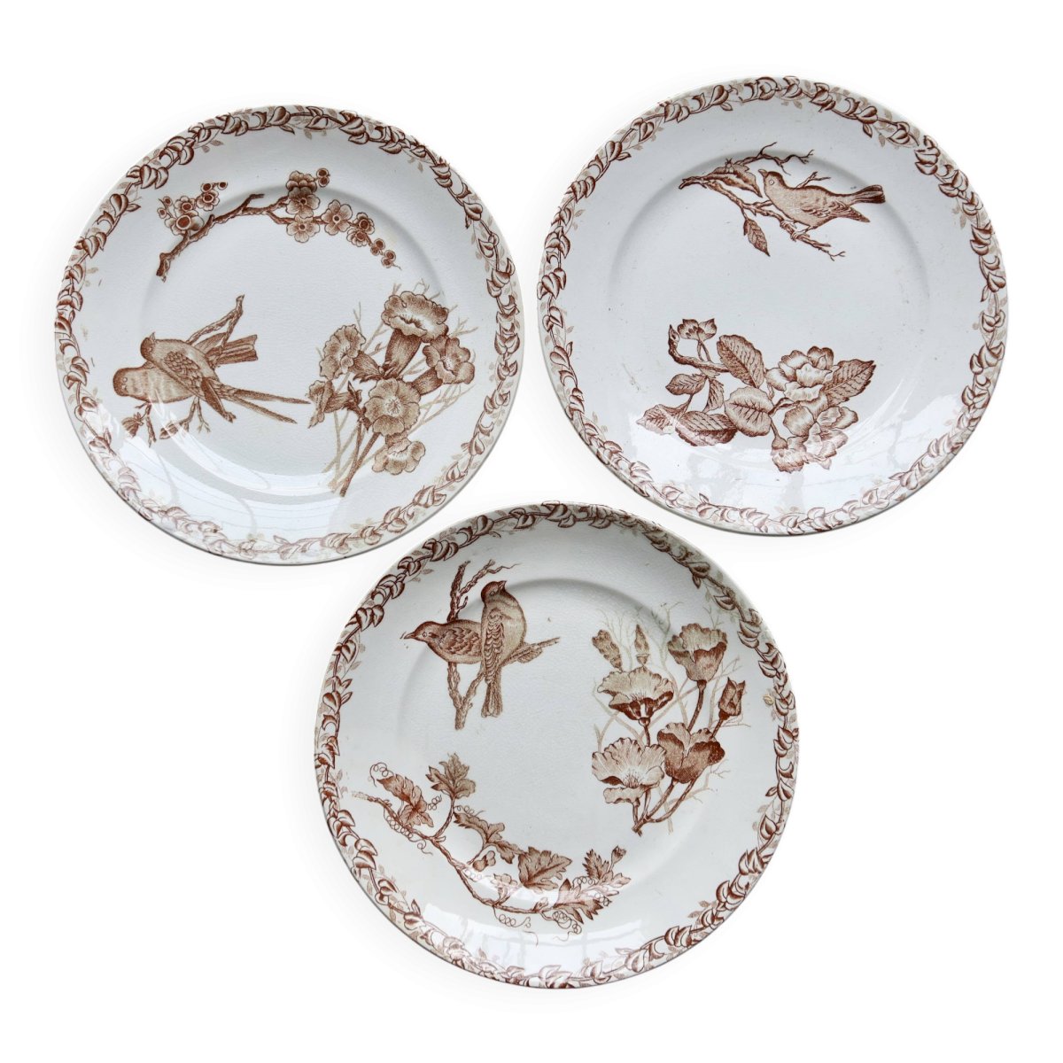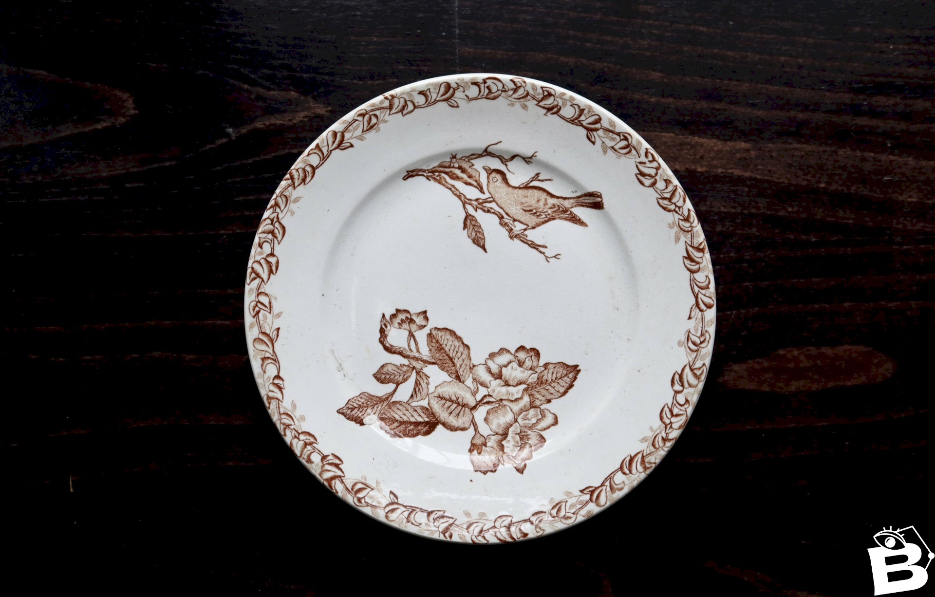 Antique dessert plate made of ironstone from the Onnaing pottery, part of the Fleurs Jetées series, featuring a finely detailed sepia brown decor depicting birds, branches, and wildflowers. Each plate has a different pattern, making every piece unique and particularly decorative, typical of French productions from the late 19th century. Sold individually: please specify the desired model when ordering from the visible patterns, subject to availability. Dimensions: 21.5 cm in diameter. L: 21 W: 21 H: 1