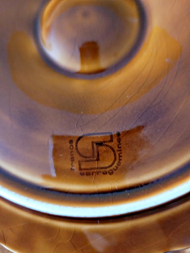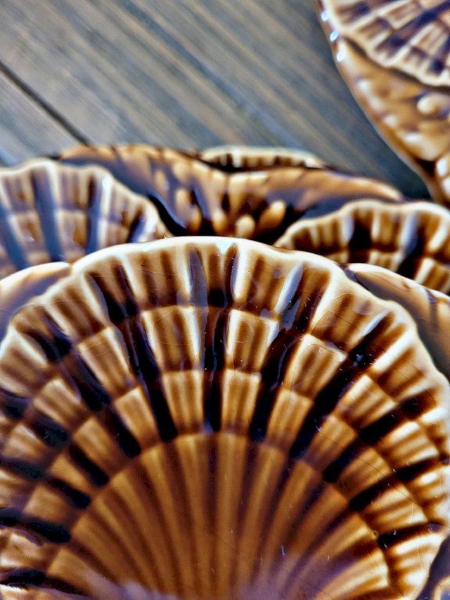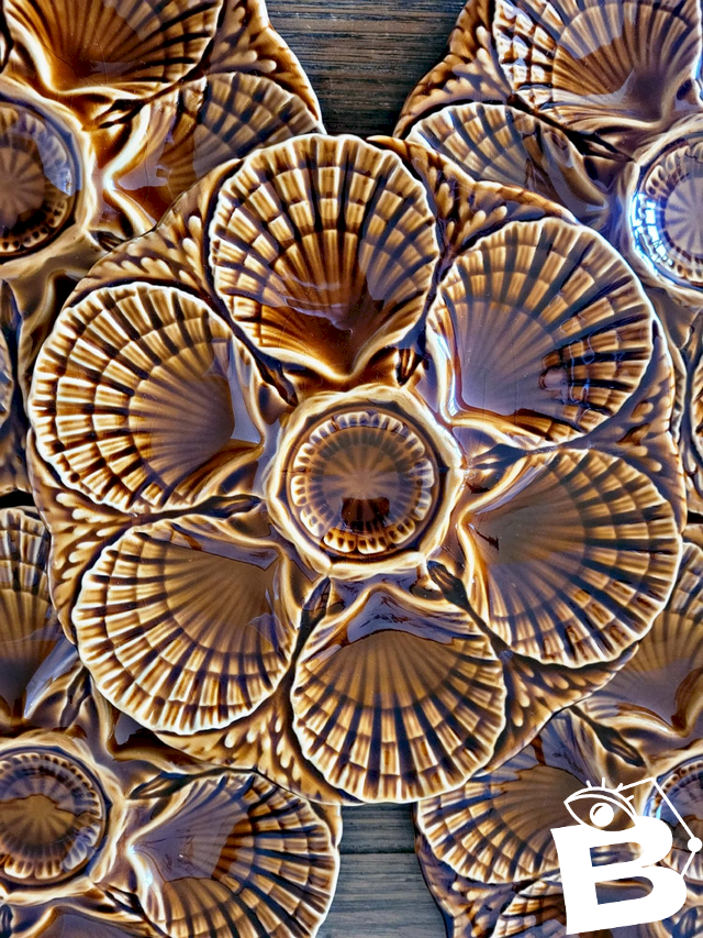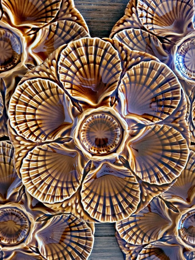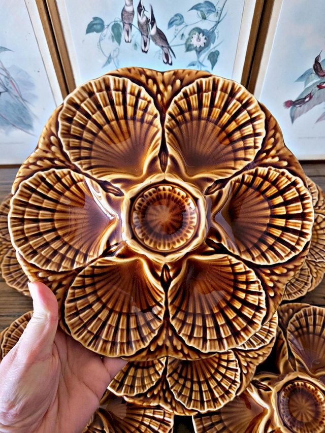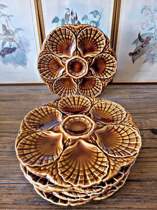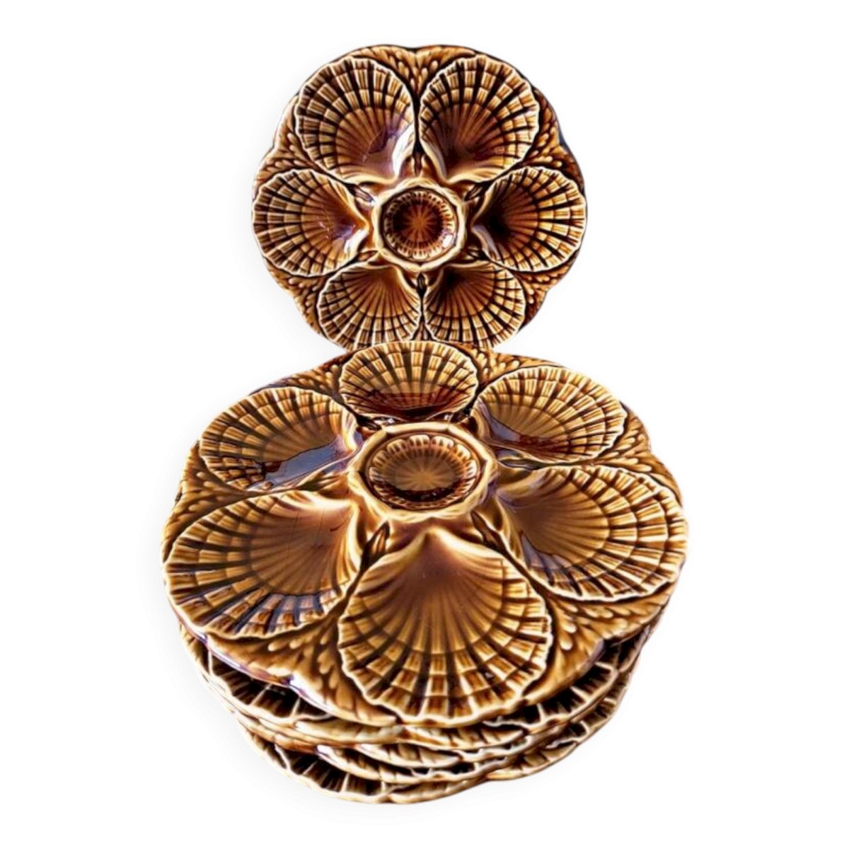 Vintage Sarreguemines oyster plates, brown (set of 6). When the sea invites itself to the Christmas table... Honor the oysters by presenting them in these 6 Sarreguemines barbotine plates (stamped on the underside), brown in color. Each plate has six spaces for oysters and a central compartment for lemon, a composition that is both practical and elegant. They will be perfect for your year-end meals, to enhance your seafood or simply to add a vintage and convivial touch to your table service. The plates have been used but are in very nice condition, with only a tiny chip on the edge of one plate (see photo). ? Diameter approximately 24 cm x height approximately 2 cm. Weight of the 6 plates: approximately 4040 g. L: 24 W: 24 H: 2