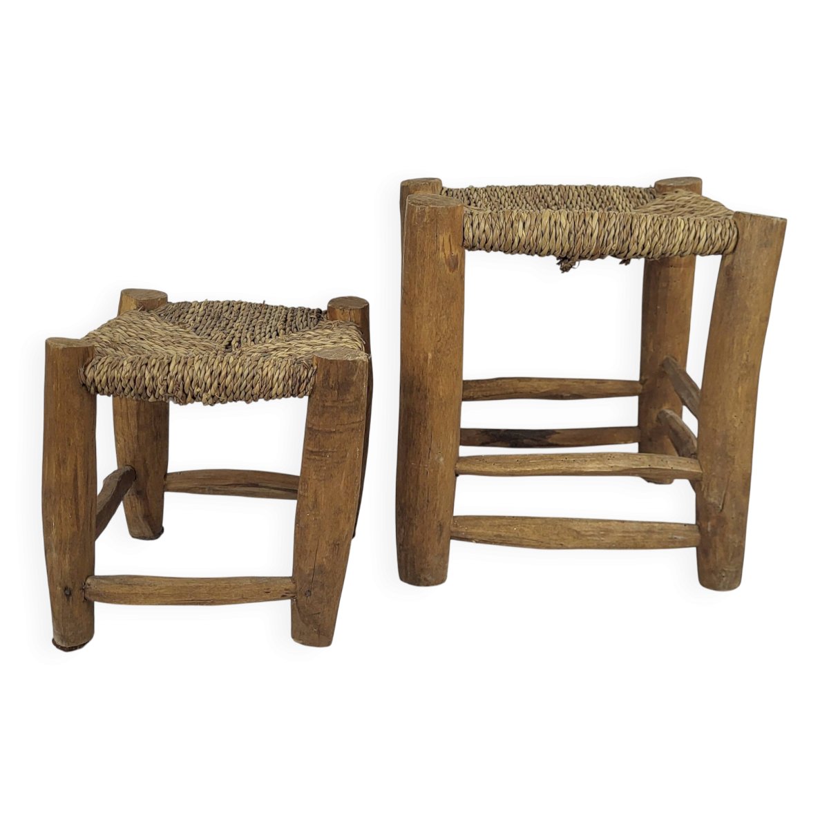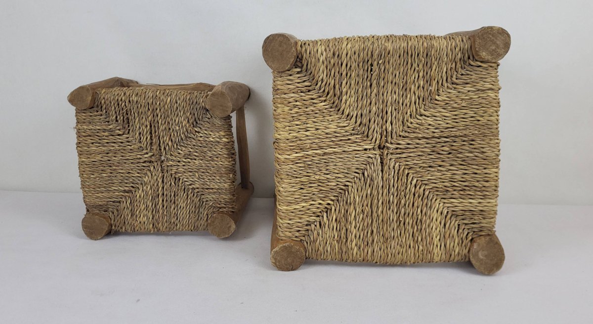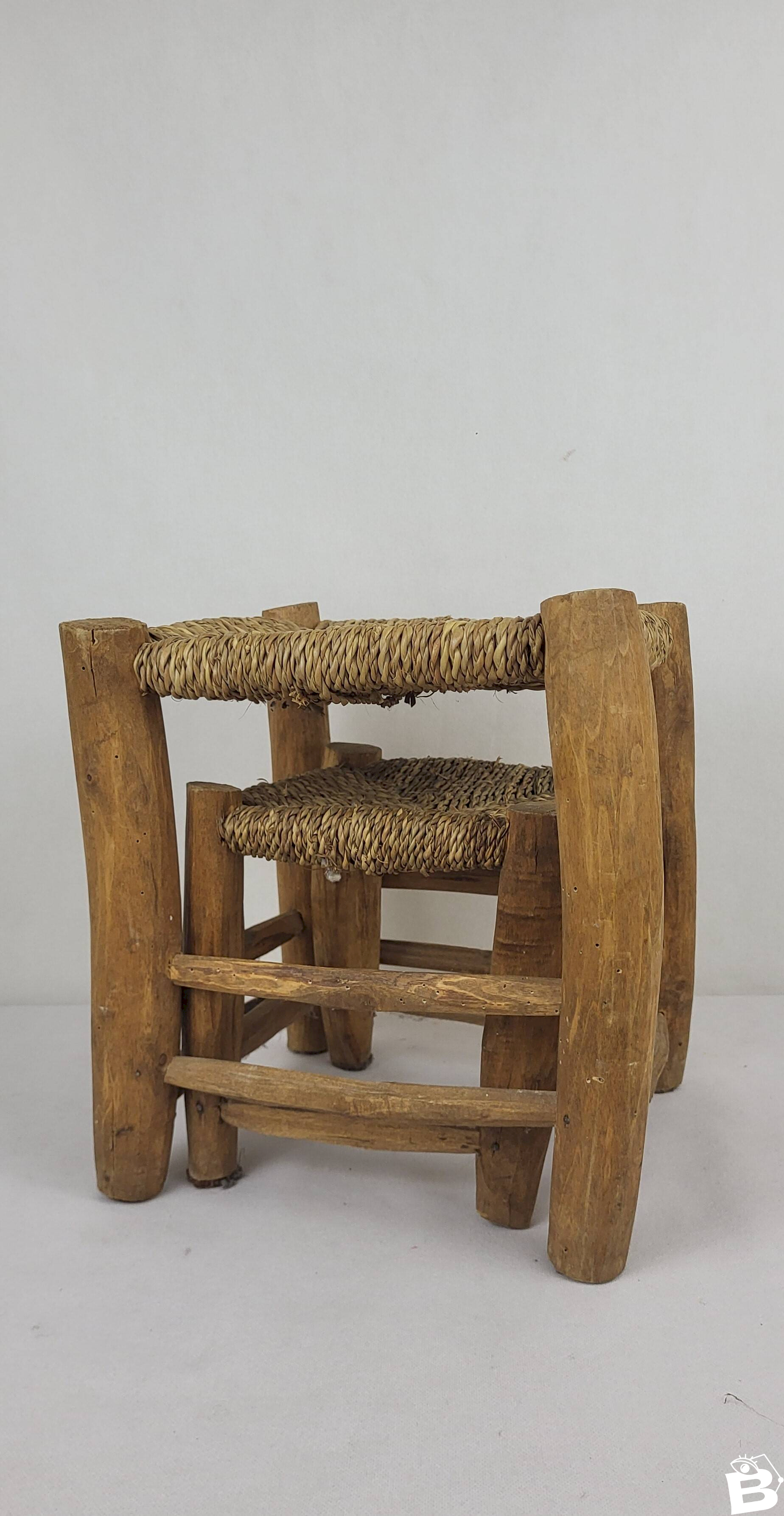 Brutalist stool in wood and rope. The pair makes an interesting set. Probably a "homemade" piece. Height 32 cm. Dimensions 28*29 cm. Height 21 cm. Dimensions 20.5*21 cm. In good condition. Careful packaging and fast delivery. L: 29 W: 28 H: 32