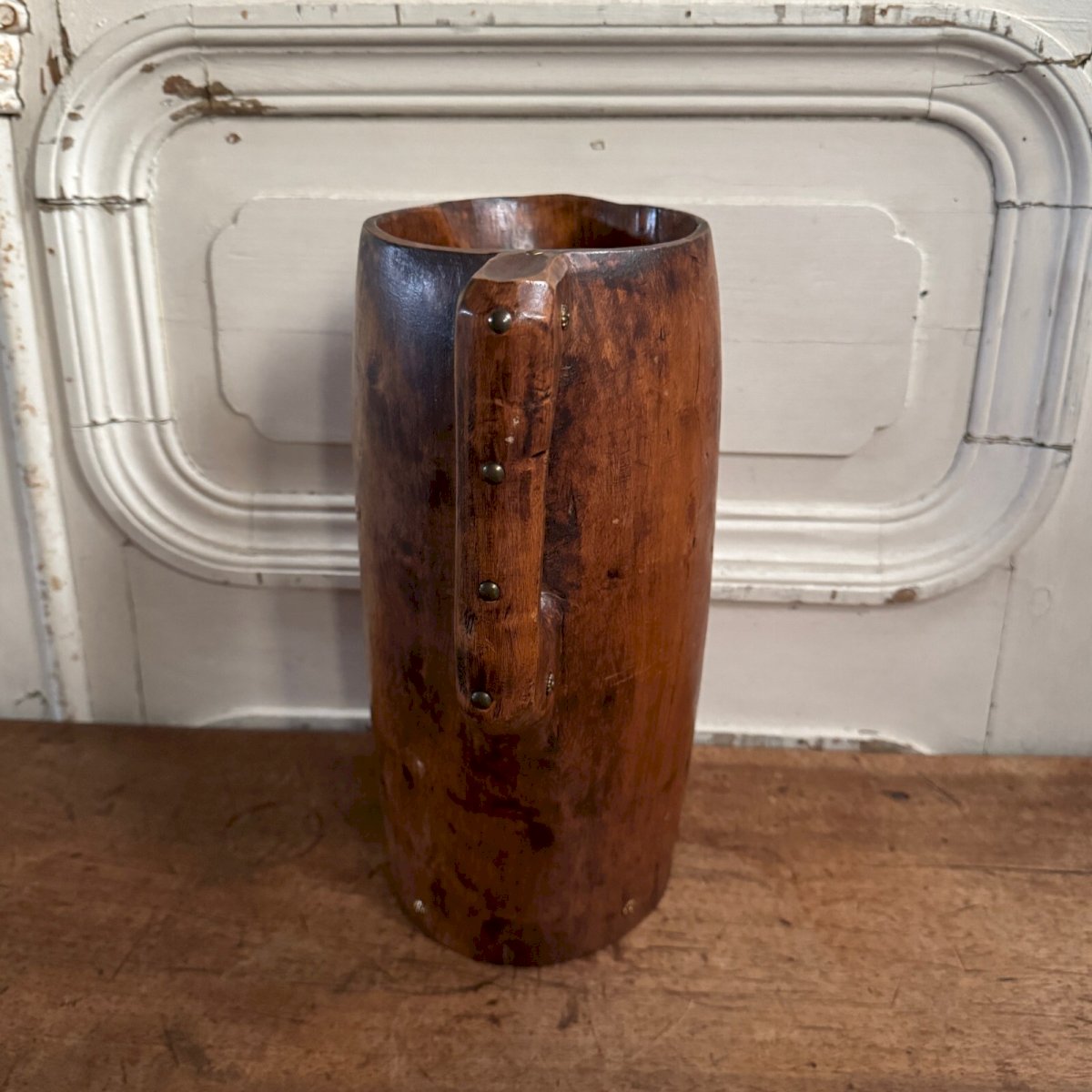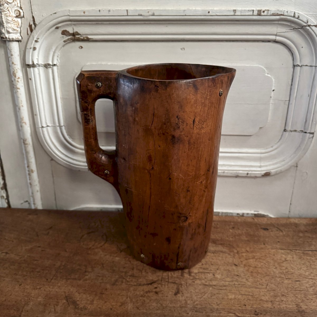 Brutalist wooden pitcher with monooxide accentuated by nails, popular art 20th century M3622. Regarding its condition, there are fine scratches due to use. Our photos allow you to appreciate the quality of the item. Please take a good look at the photos. Feel free to zoom in. The photos are an integral part of the description. Dimensions: Height: 29 cm Width: 21.5 cm Neck diameter: 13 cm Base diameter: 13.8 cm A: K2C5DL89XX P: 1572483 I remain at your disposal for any questions. Type: Showcase object, Decorative Origin: France Sub-type: Pitcher Height: 29 cm Material: Wood Length: cm Width: 21.5 cm