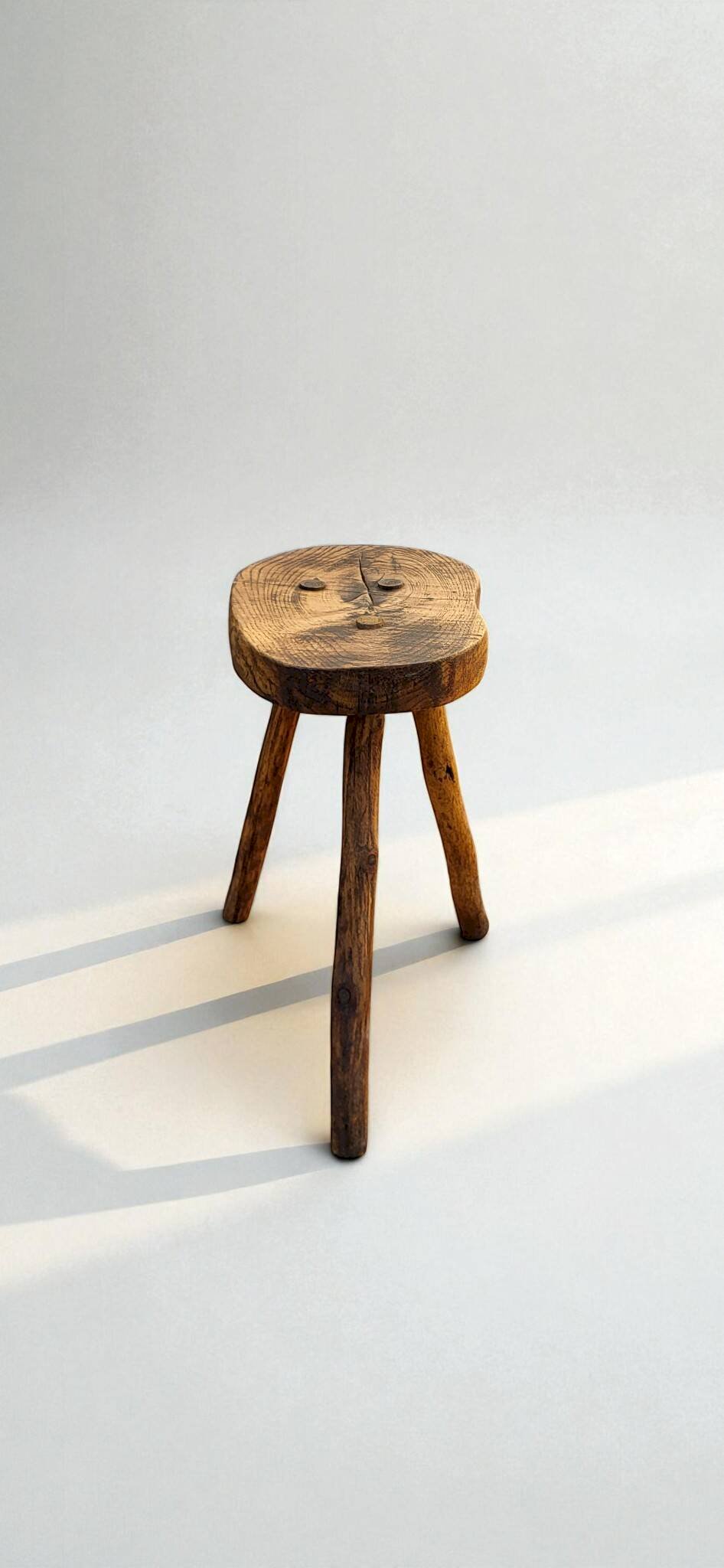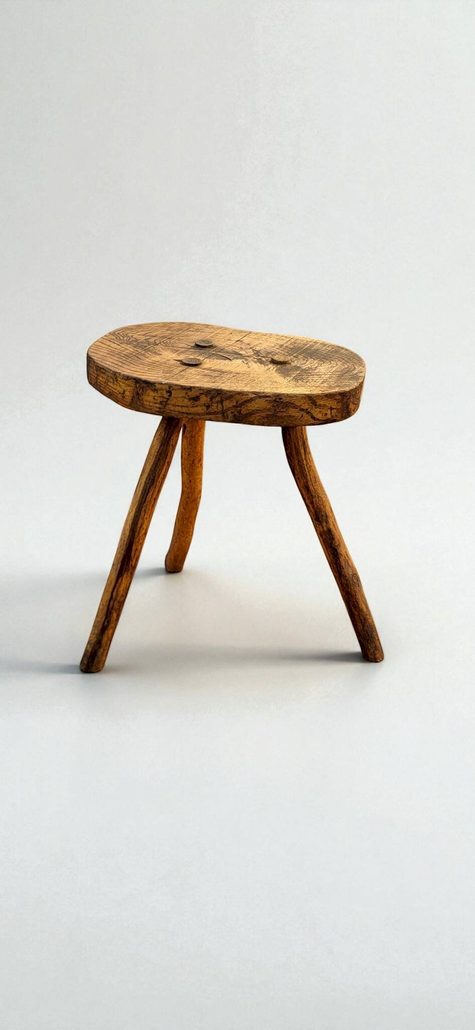 Wooden stool (oak) in Brutalist style resting on 3 legs. It is perfectly stable, in good condition, and very sturdy. Height 51 cm. Width 40.5 cm. Depth 26.5 cm. Weight 4.5 kg. L: 40 W: 26 H: 51