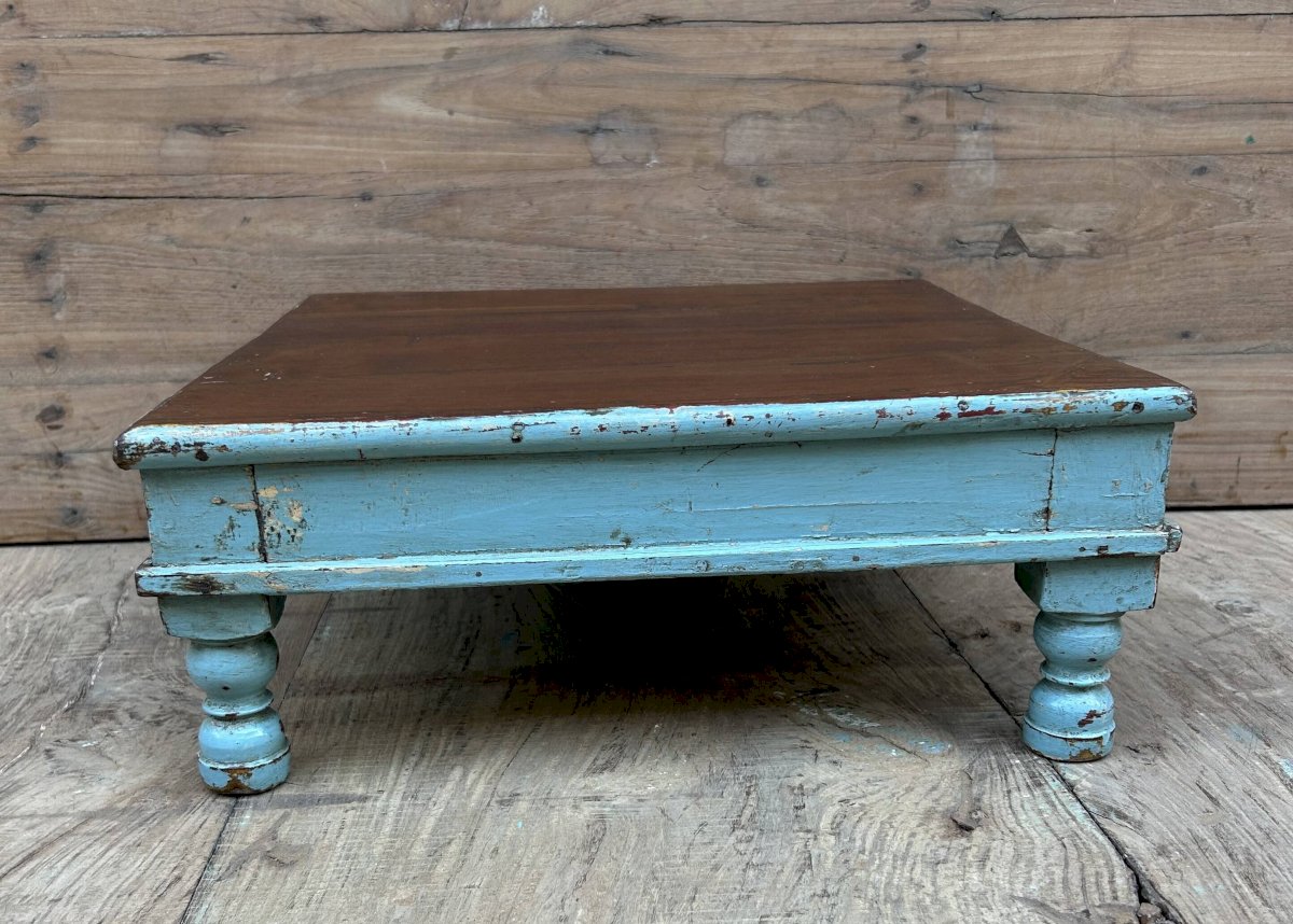 Burmese teak coffee table with original turquoise patina. Ethnic Blue Wood