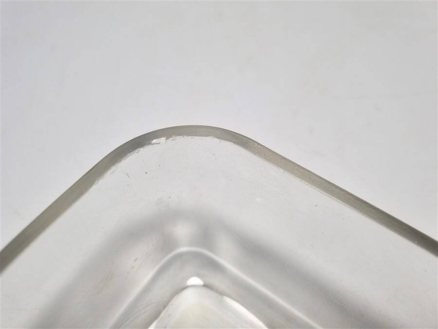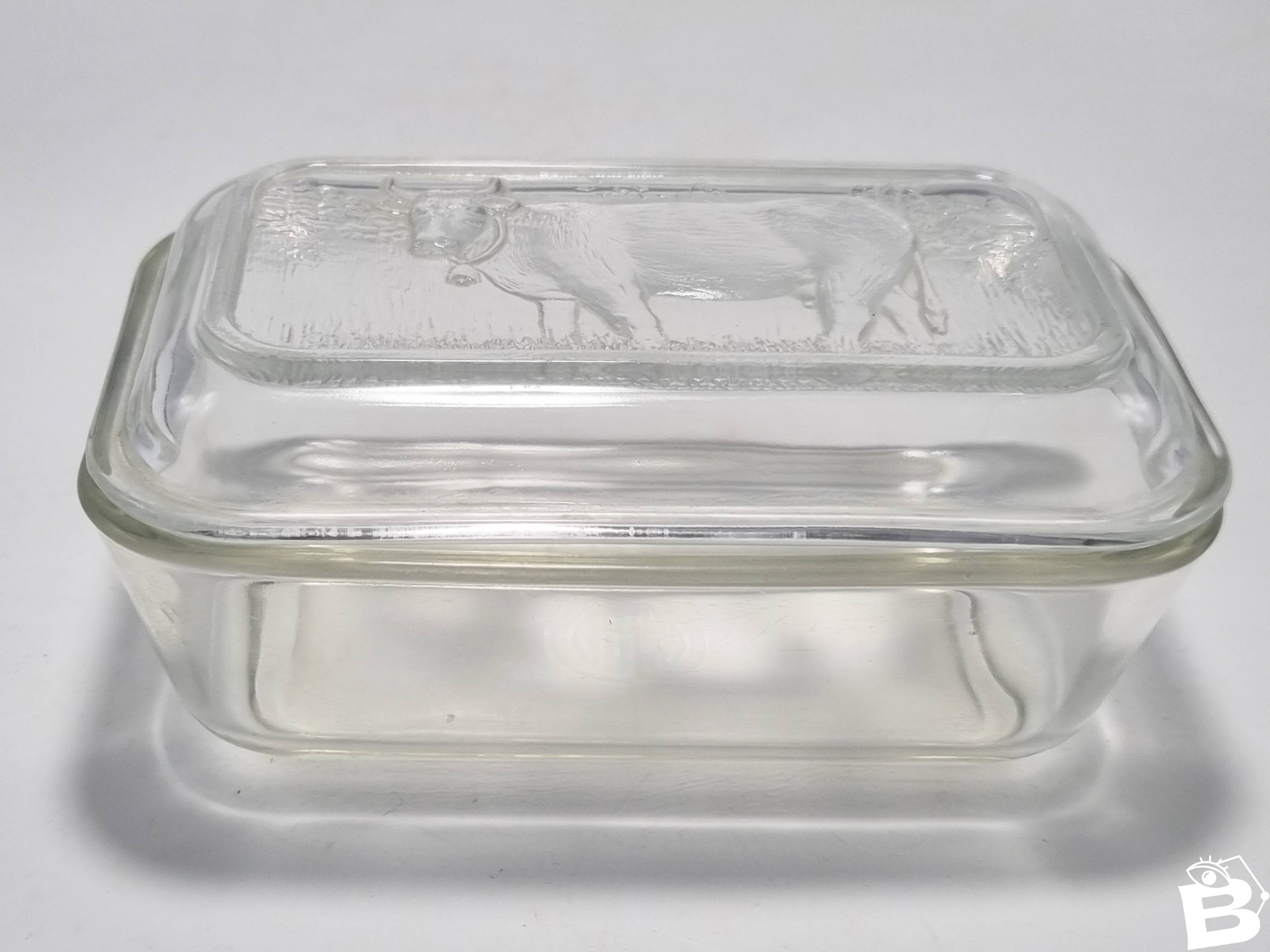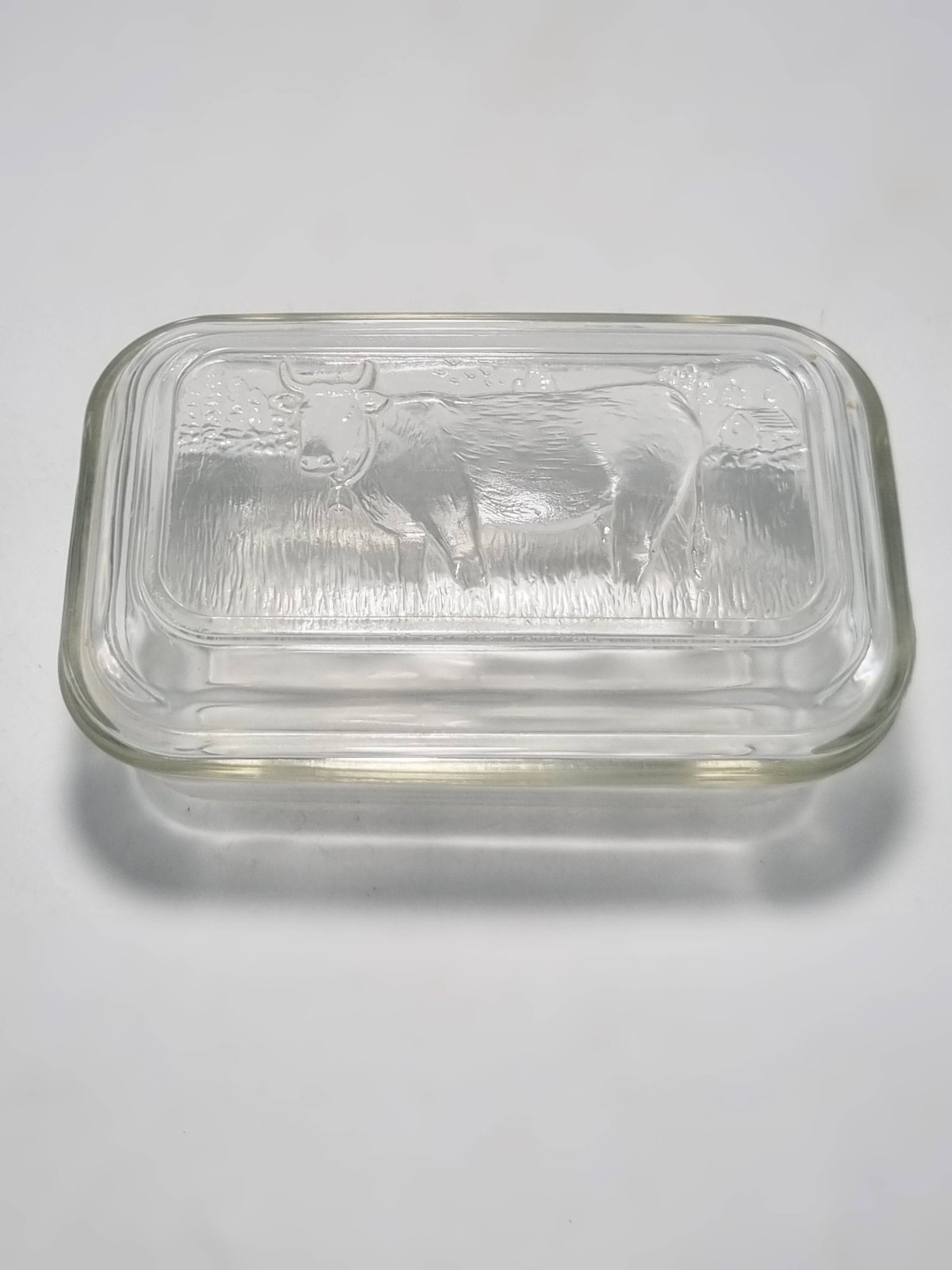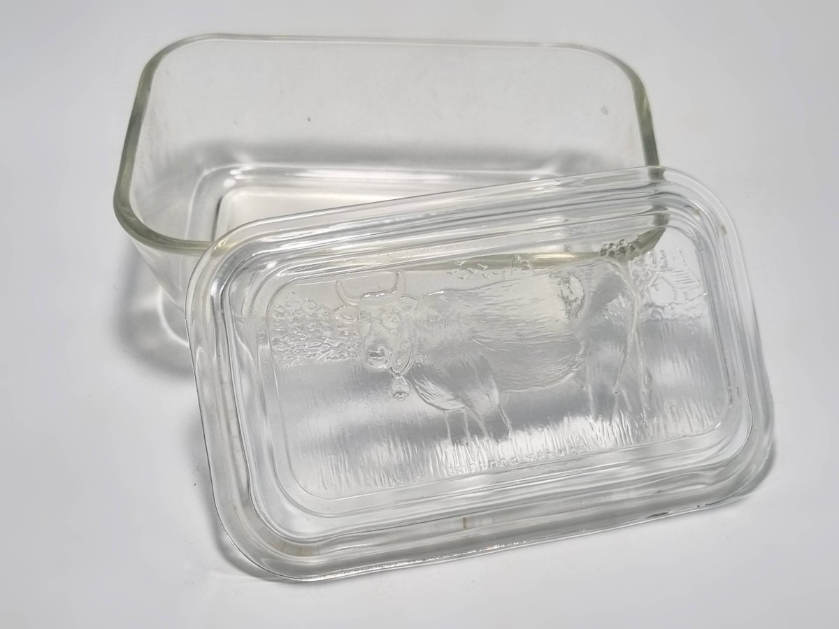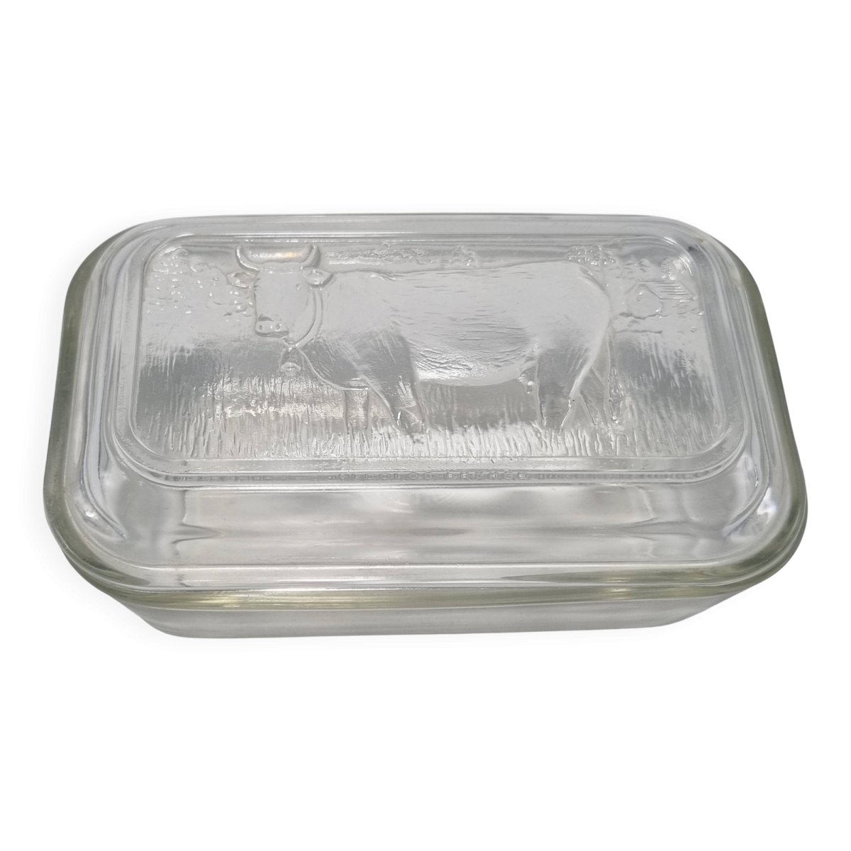 Glass butter dish with a raised decoration of a cow on the lid. It has some minor defects, see photo. Dimensions: approximately 17 x 11 x 7.5 cm Weight: 640 g L: 11 W: 17 H: 7.5