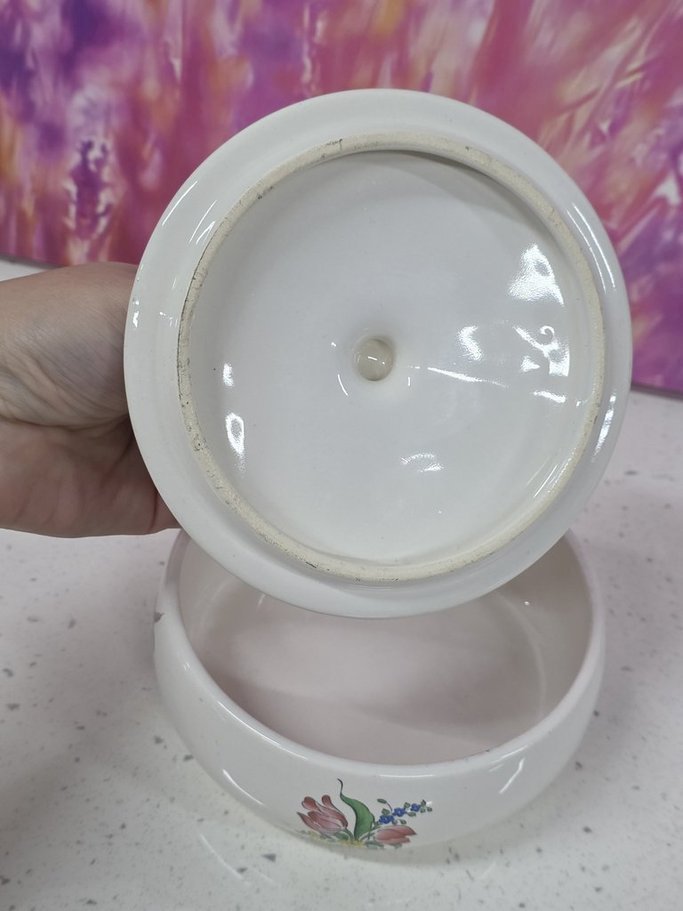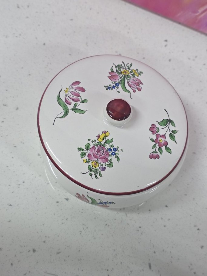 Vintage beige ceramic candy jar - Hand-painted blue floral decor