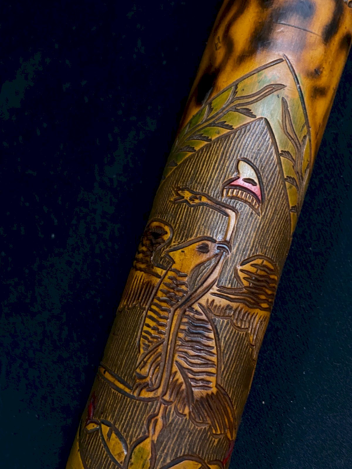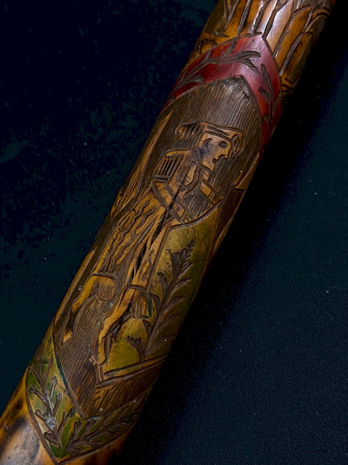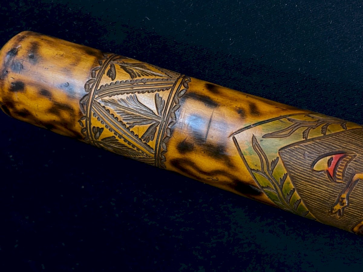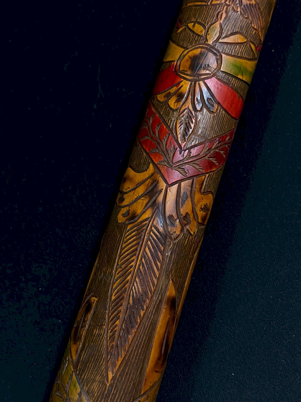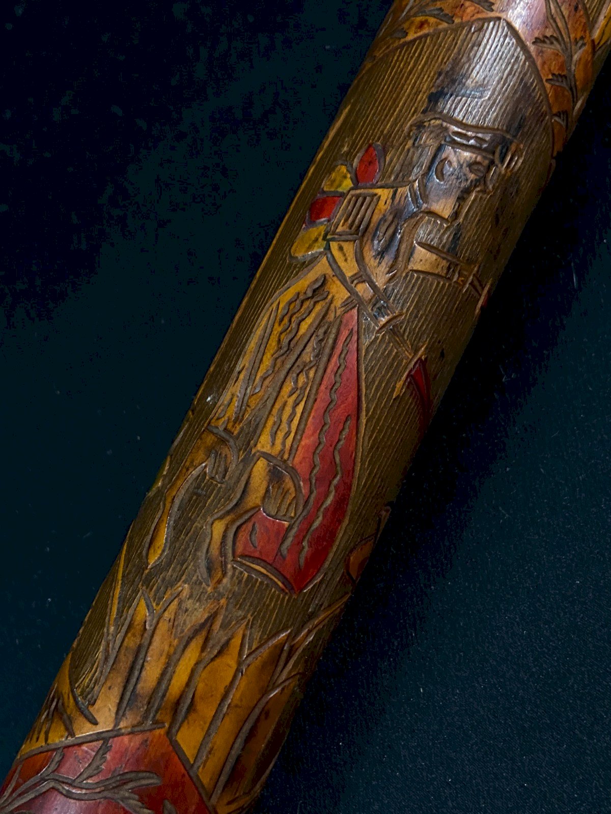 Superb cane or walking stick made of hand-carved solid wood, decorated with a continuous frieze of pre-Columbian characters wearing feather headdresses and geometric tunics typical of Aztecs and Mayans, alternating with stylized animal motifs (probably bulls or sacred cattle) and vegetal patterns. The entire piece is carved in low relief and enhanced with polychromy in red, green, and ochre, giving the decoration remarkable vibrancy. Handcrafted work from Latin America: Mexico – State of Guerrero, Oaxaca or Michoacan, circa 1960-1970. Very beautiful "tiger honey" patina typical of tropical woods used in Mexican art craftsmanship. Dense and well-balanced piece made of tropical wood such as Parota, Guayacan, or Copal. Max dimensions: Length 84 cm x max diameter at the top 4.2 cm Weight: 605 grams Carefully packed shipping worldwide Authenticity: Original Type: Cane Origin: Americas Country of origin: Mexico Materials from: Mexico Material: Wood