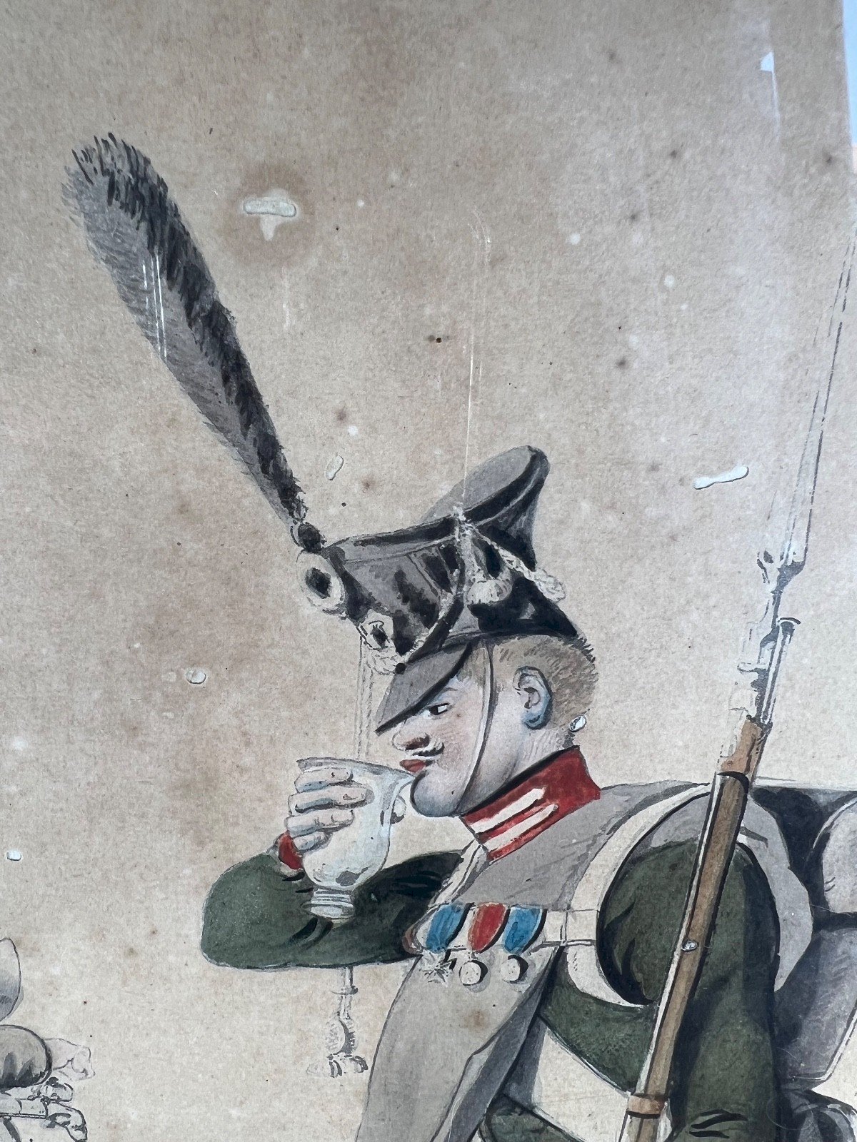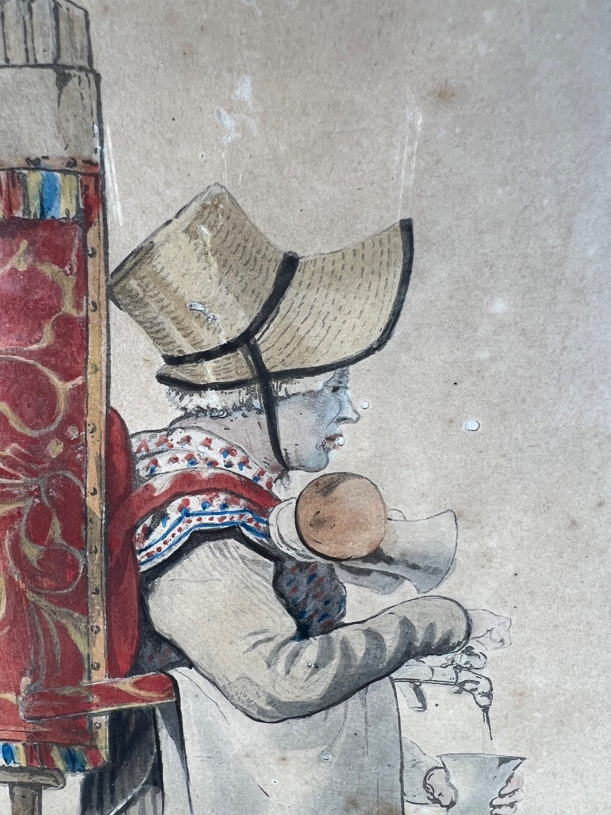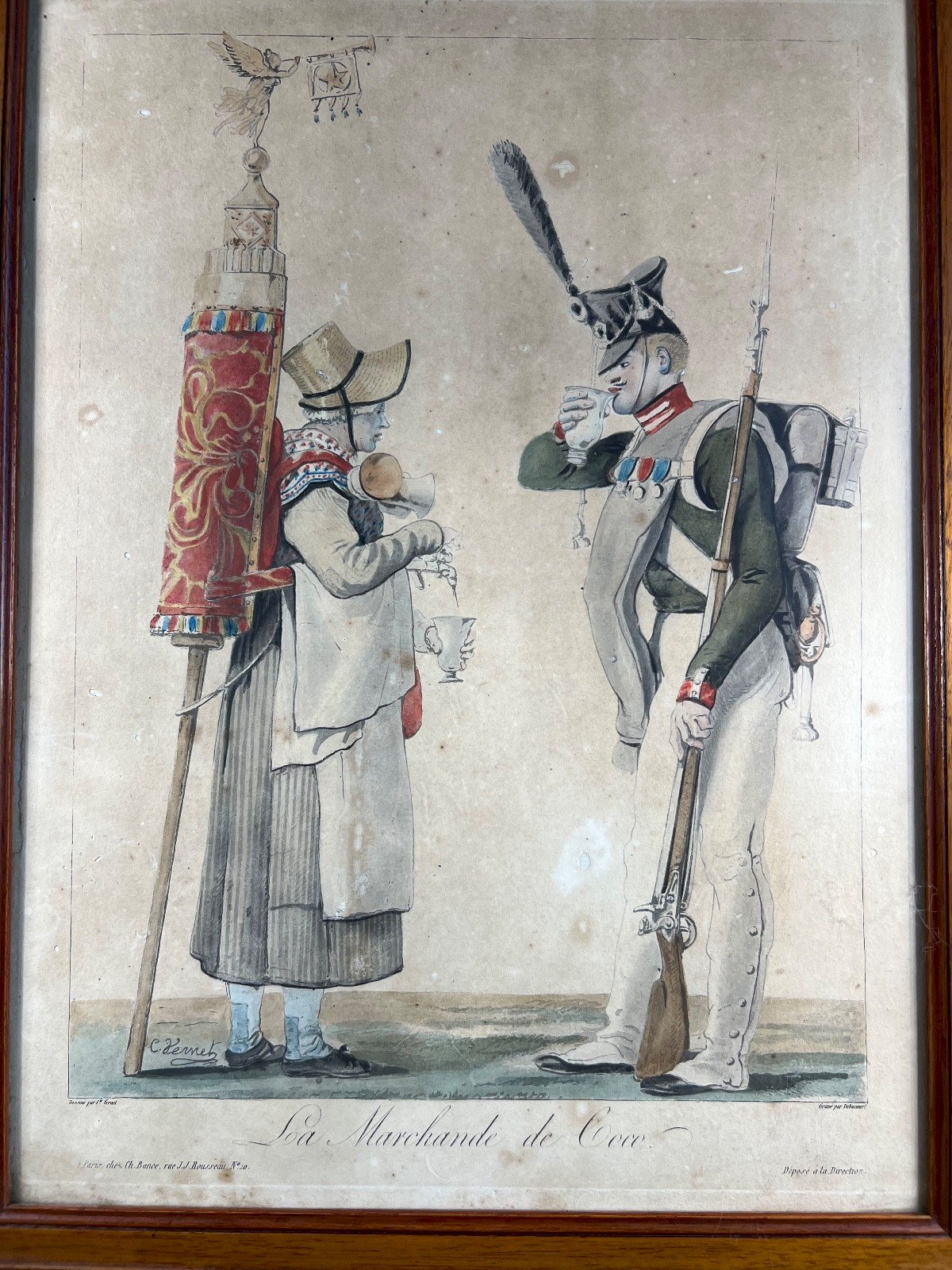 Superb antique engraving titled “The Coconut Seller,” drawn by Carle Vernet (1758–1836) and engraved by Louis-Philibert Debucourt (1755–1832). Published in Paris by Charles Bance, 20 rue J.-J. Rousseau, around 1810–1820. This rare and charming print depicts a Parisian street scene: a female street vendor offering her drink to a decorated Napoleonic soldier. A moment of life imbued with sweetness and humor, typical of the popular Paris of the Empire and Restoration eras. This work is part of the famous series of Street Vendors of Paris, with several copies preserved today at the Carnavalet Museum – History of Paris. Details: Title: The Coconut Seller Artist: Carle Vernet (1758–1836) Engraver: Louis-Philibert Debucourt (1755–1832) Publisher: Charles Bance, Paris, 20 rue J.-J. Rousseau Era: Empire / Restoration, around 1810–1820 Technique: Etching, hand-enhanced Notations on the plate: Drawn by C.le Vernet Engraved by Debucourt Deposited at the Administration Framing: old Parisian wooden frame, with label L. Bernard, rue de Penthièvre, Paris Total dimensions: 42 x 32 cm (16.5” x 12.6”) Condition: good overall condition – some spots and traces of time, original patina. Old glass. Museum reference: Identical engraving preserved at the Carnavalet Museum – History of Paris, in the collection of Street Vendors of Paris. Carle Vernet, Debucourt, antique engraving, Empire art, 19th century Paris, Bance Paris, street scene, Napoleon, Napoleonic art, French print, coconut seller, Carnavalet museum, antique art, wall decoration, hand engraving Type: Lithograph Period: 19th century and earlier Theme: Genre scene
