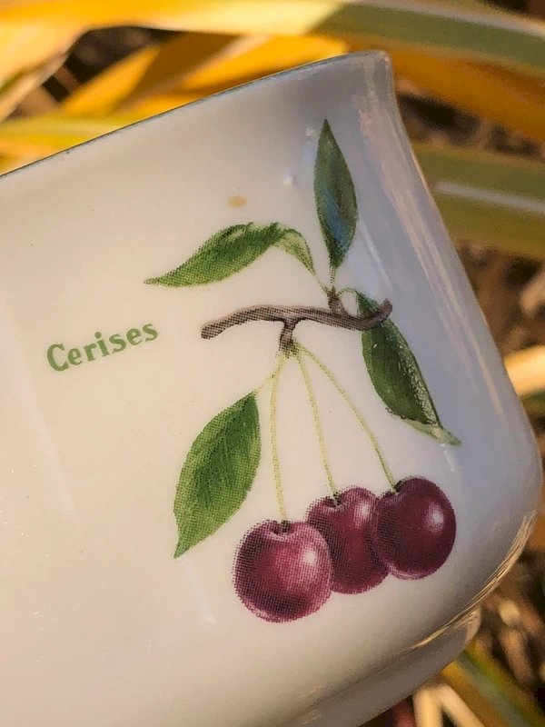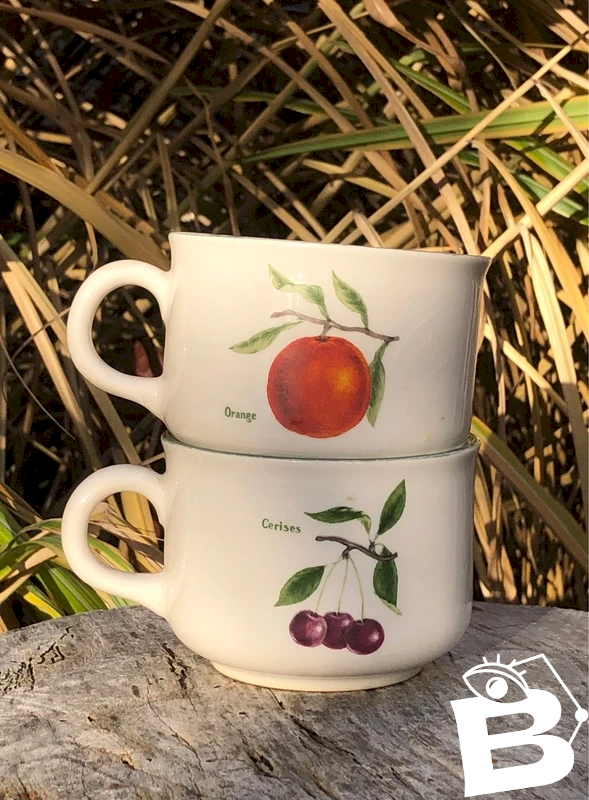 2 Cups Carrigaline Pottery Ireland fruit patterns in very good general condition, neither chipped nor cracked, but with crazing inside one of them, as well as its green trim which is faded compared to the other one, see the photos. Height 6.3 cm Diameter 8.7 cm...