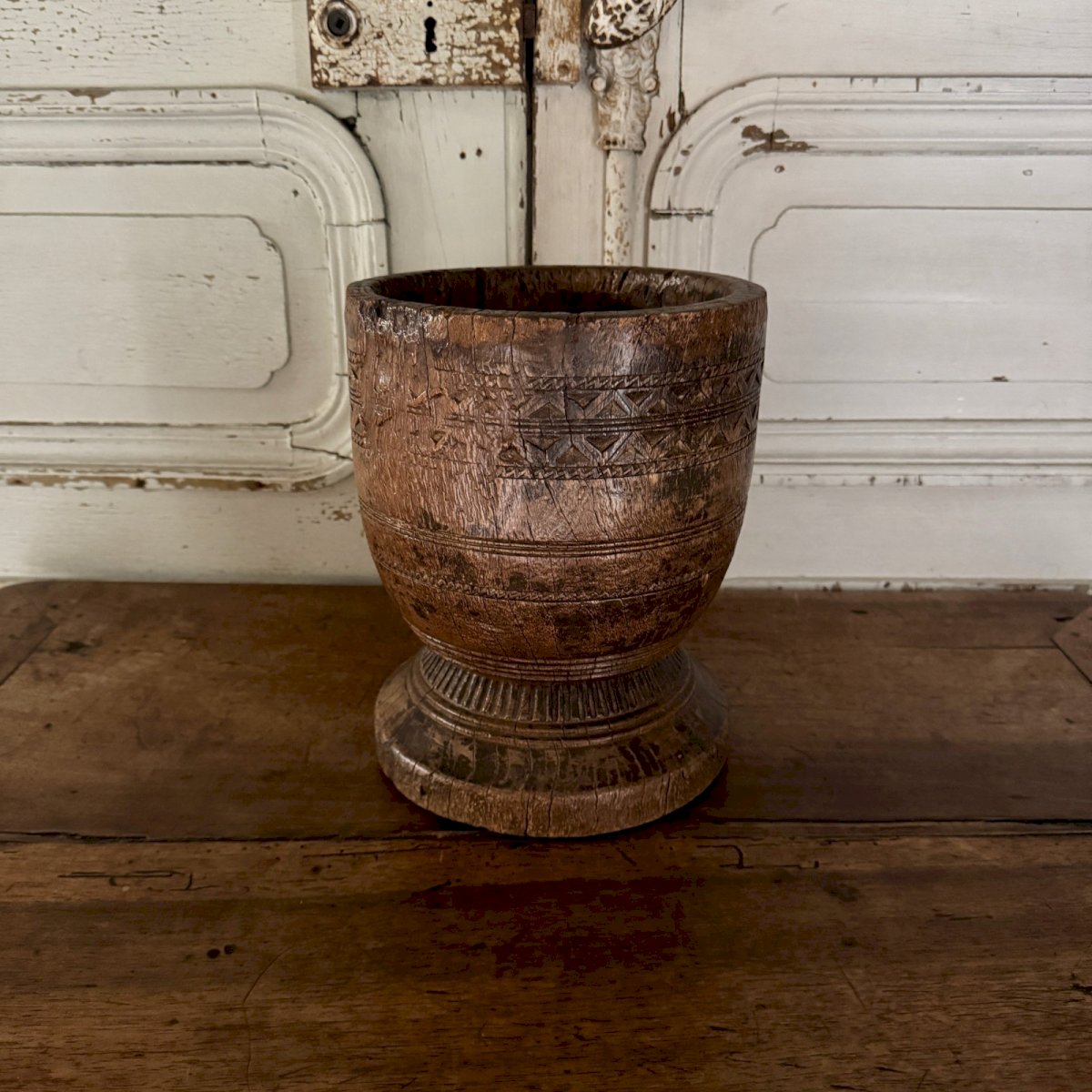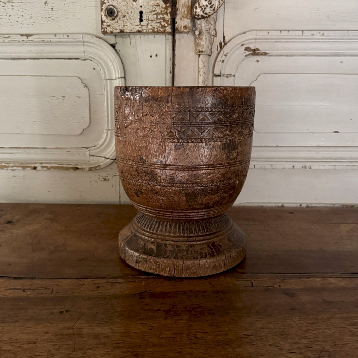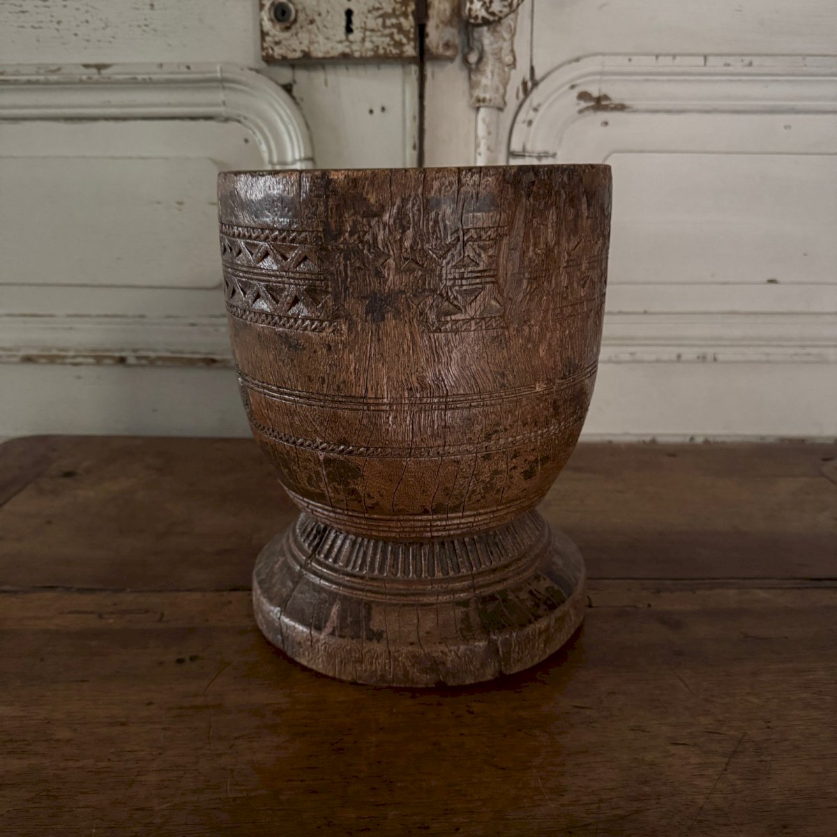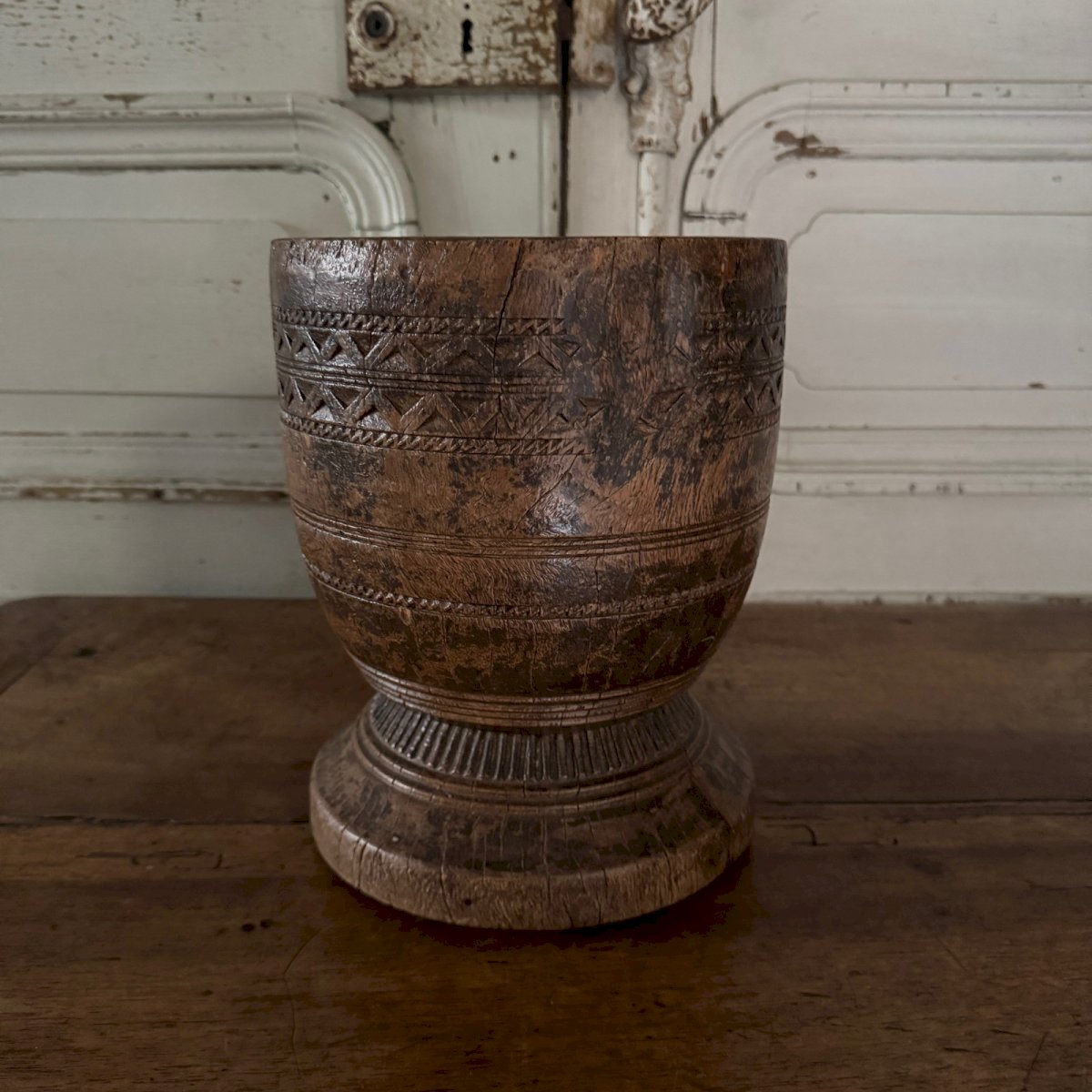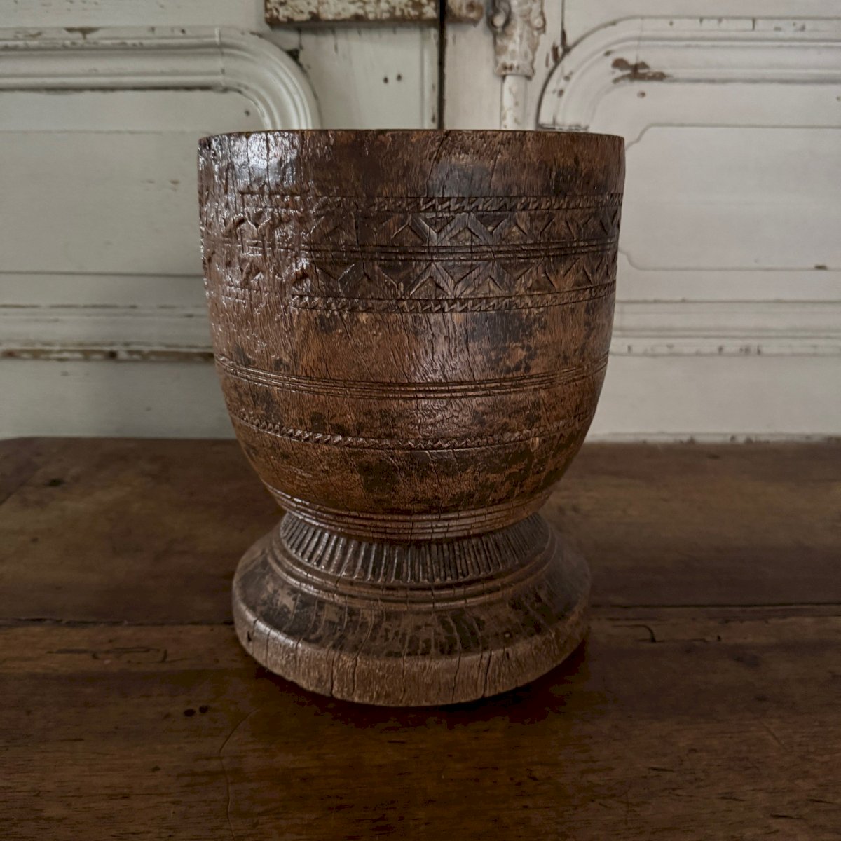 Sculpted wooden mortar engraved with Africanist style, 20th century M3641 This sculpted wooden mortar has a very beautiful patina and is likely an old African work. In terms of condition, note that there are classic cracks and wear, along with a patina from use. Our photos allow you to appreciate the quality of the object. Please detail the photos well. Don’t hesitate to zoom in. The photos are an integral part of the description. Dimensions: Height: 26.5 cm Neck diameter: 21 cm Belly diameter: 21.5 cm Base diameter: 21 cm A: I3IKTK99OG S: X7PA1D58 P: 1598033 I remain at your disposal for any questions. Type: Display object, Decorative Subtype: Mortar Height: 26.5 cm Material: Wood Length: cm Width: 21 cm