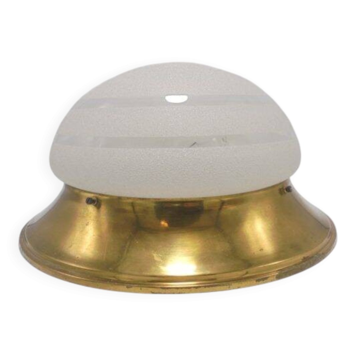 Ceiling light made of a golden metal base (showing signs of age) and a frosted glass globe. B22 socket (LED bayonet bulbs are easily available). Diameter: 28 cm. Height: 15 cm. Weight: 1 kg. L: 28 W: 28 H: 15