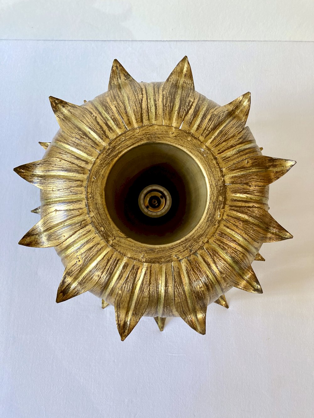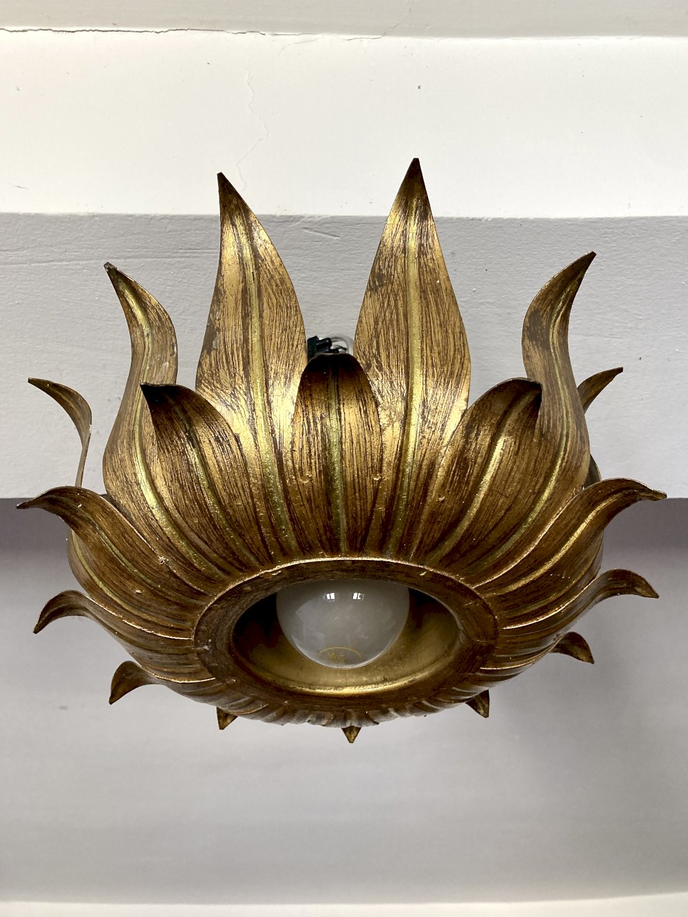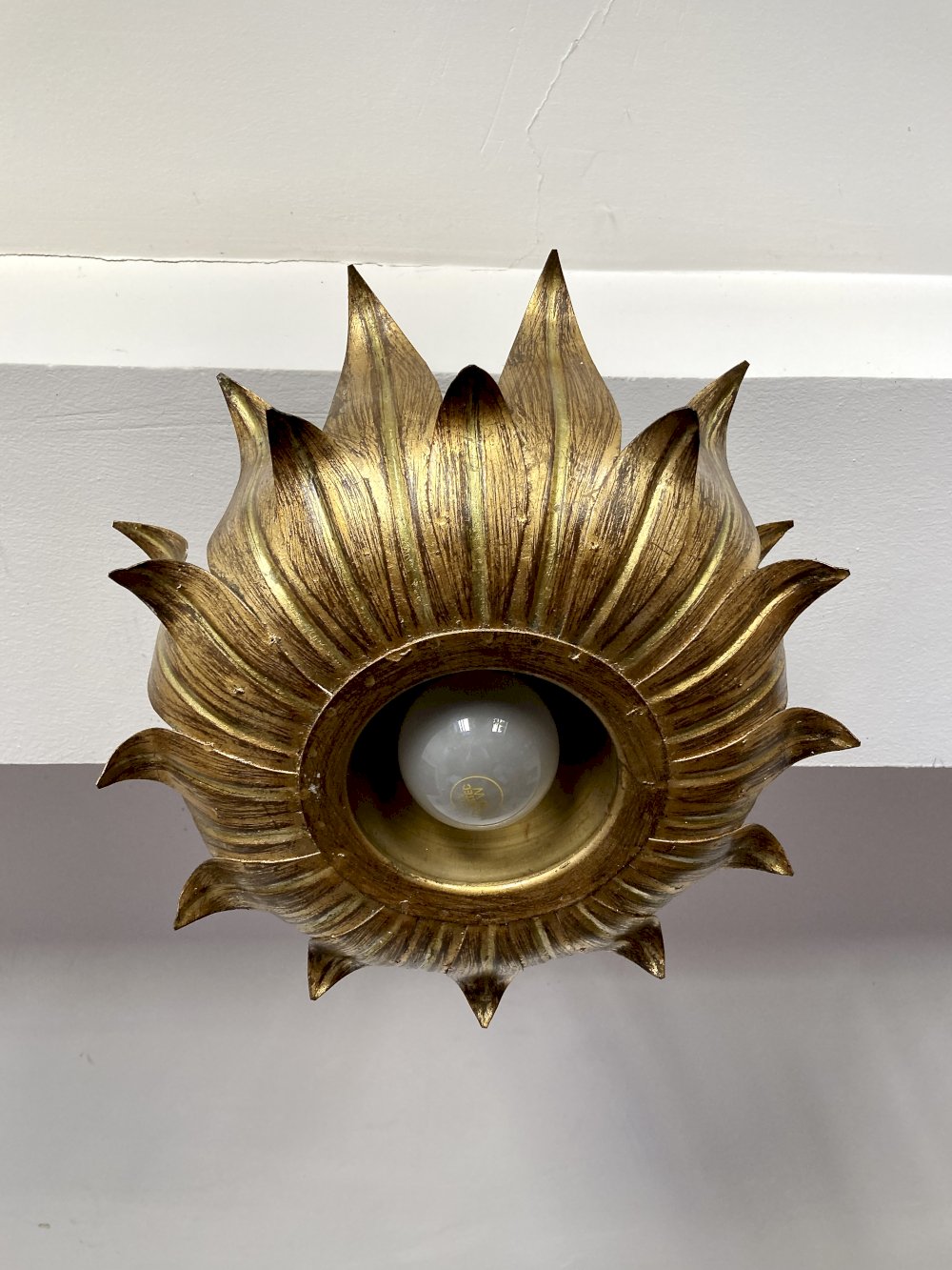 Vintage ceiling light by Hans Kögl, emblematic of the floral design of the 1950s. This "sunflower" model in gilded metal captivates with its intricate relief work and beautiful original patina, giving it a warm and authentic charm.