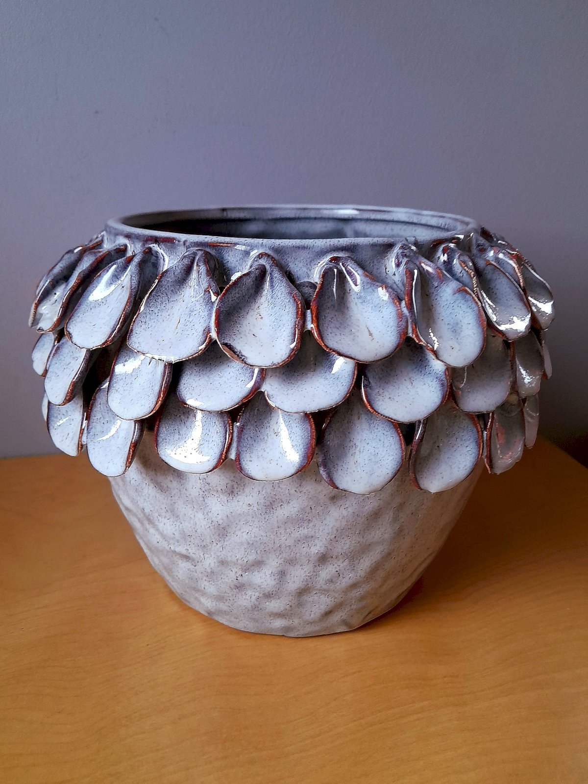 Ceramic pot adorned with delicate layers resembling petals.
