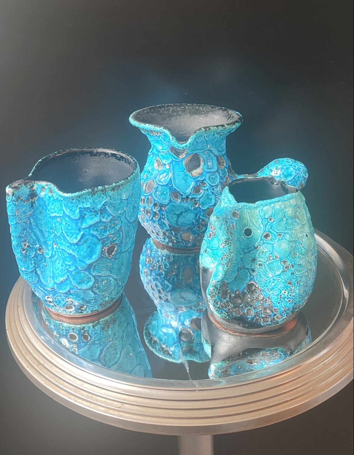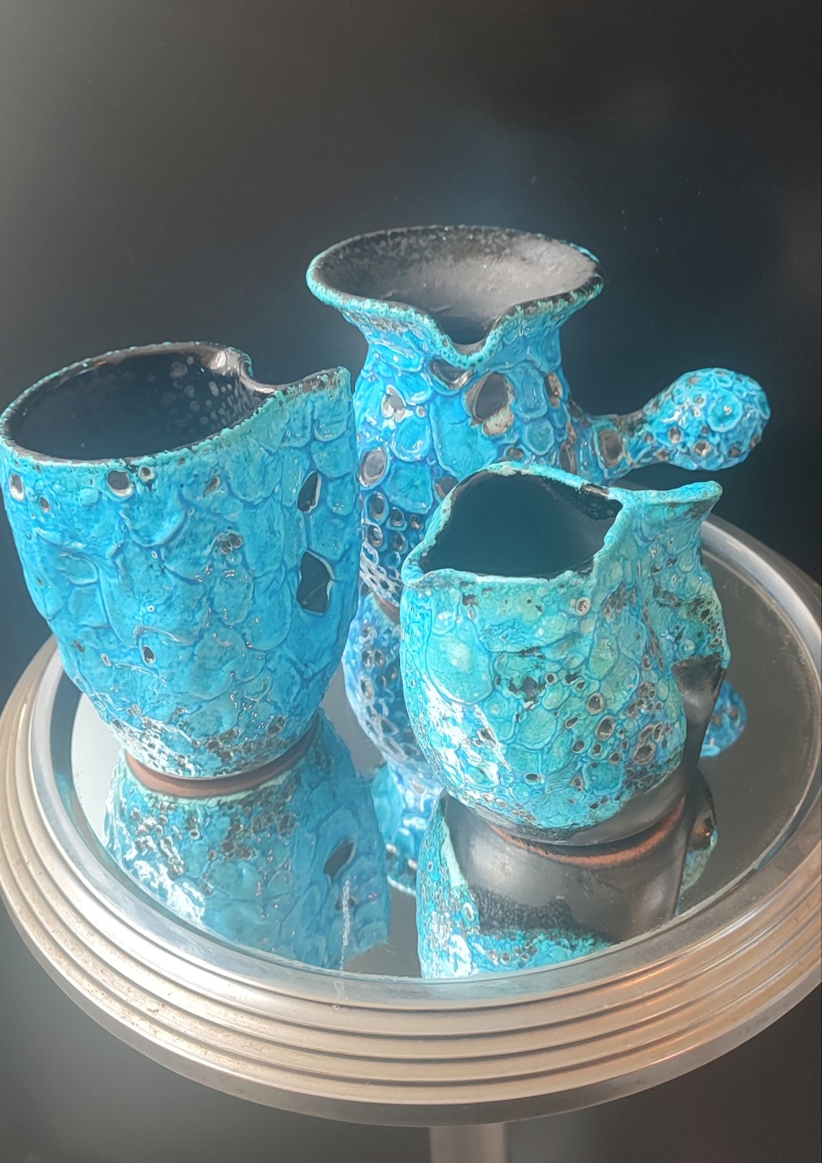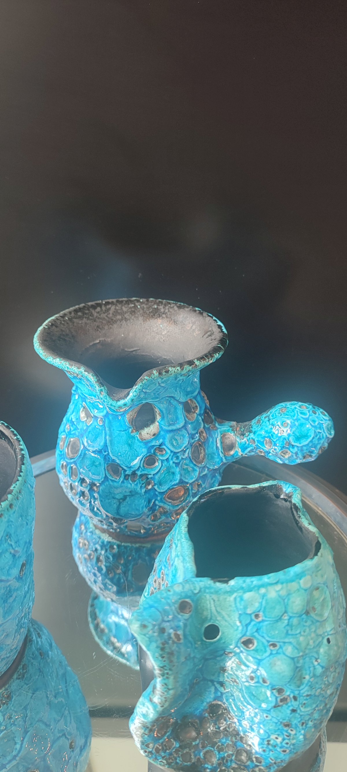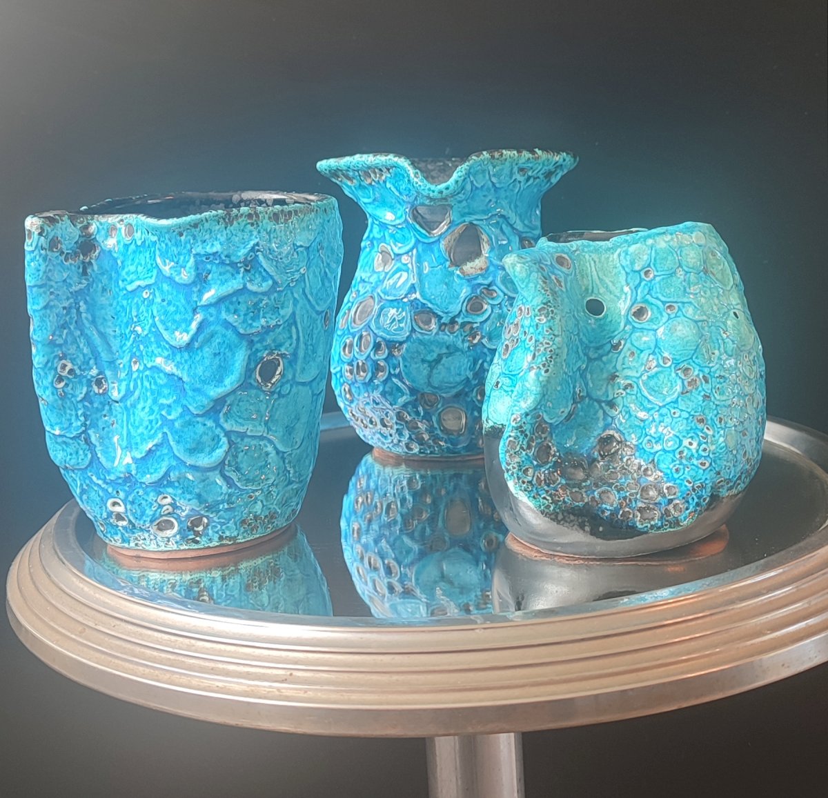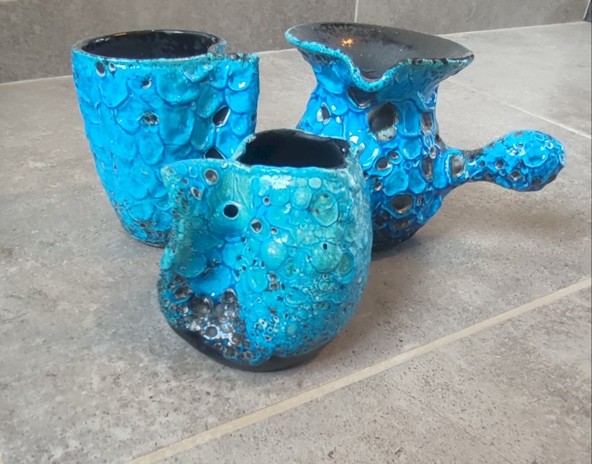 Composed of 3 pieces of workshop ceramics, covered with a thick turquoise glaze Emaux des Glaciers Cyclope with a strongly bubbled and cratered Fat Lava texture attributed to Charles Cart.