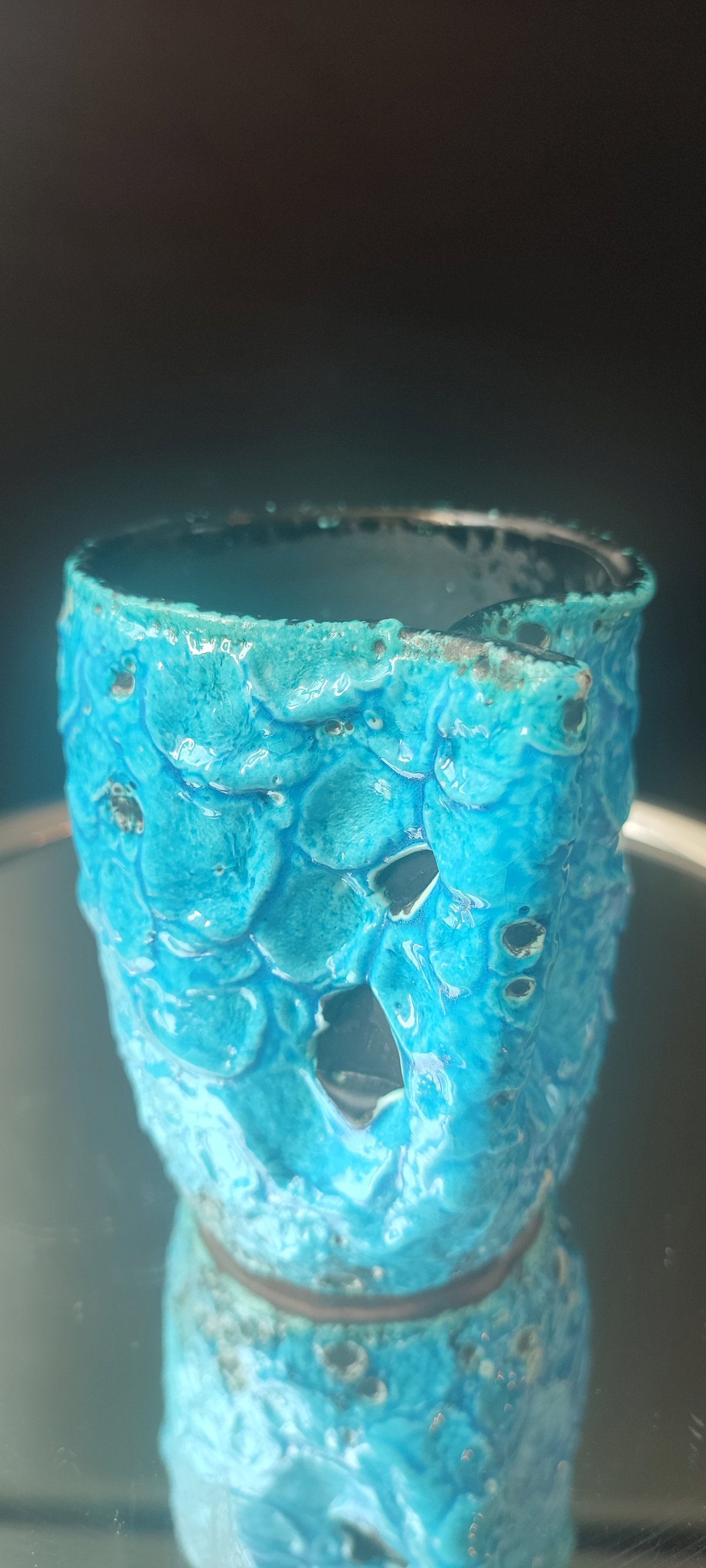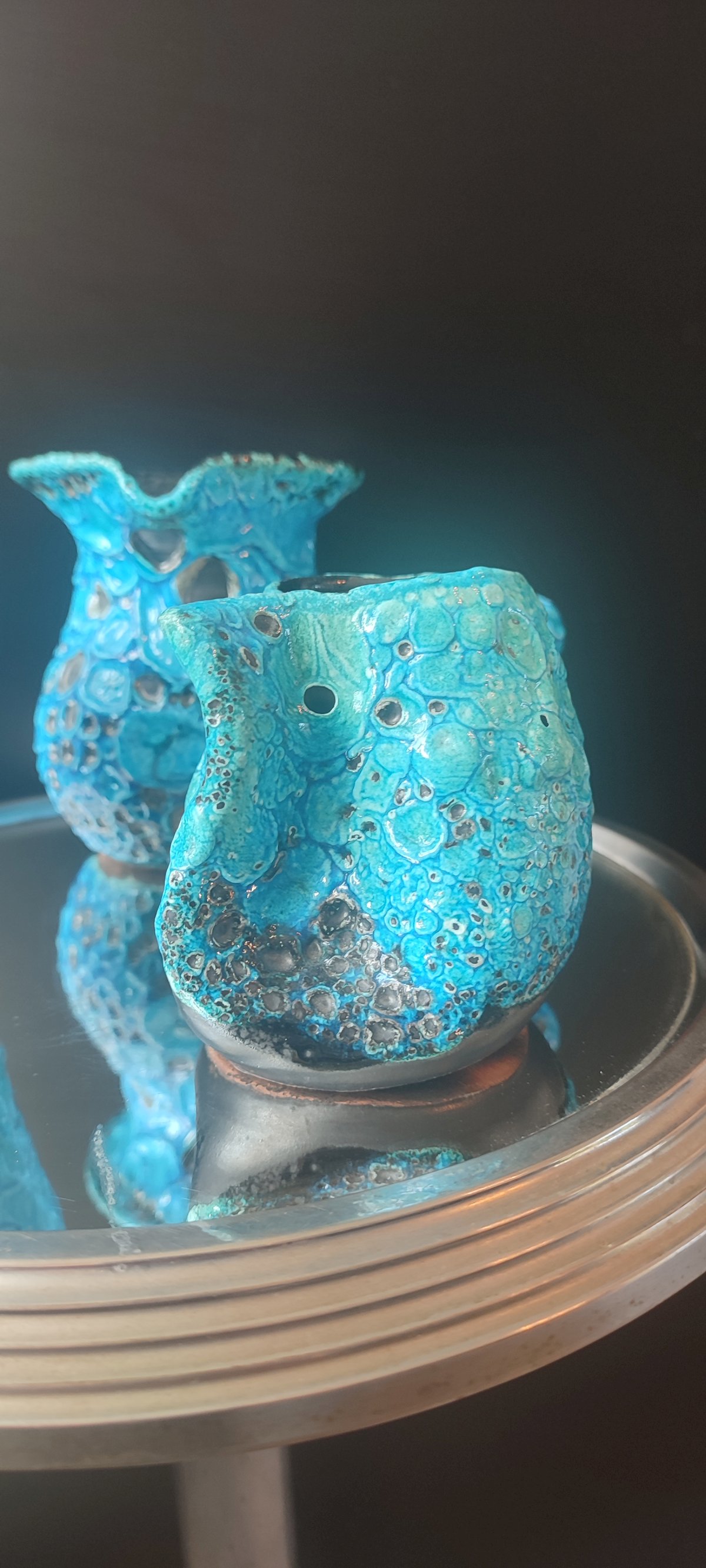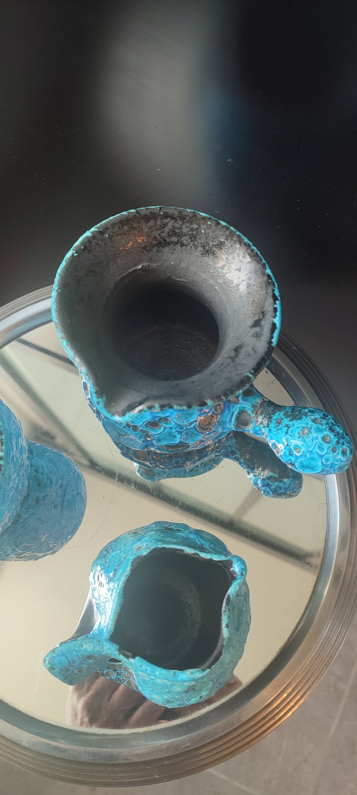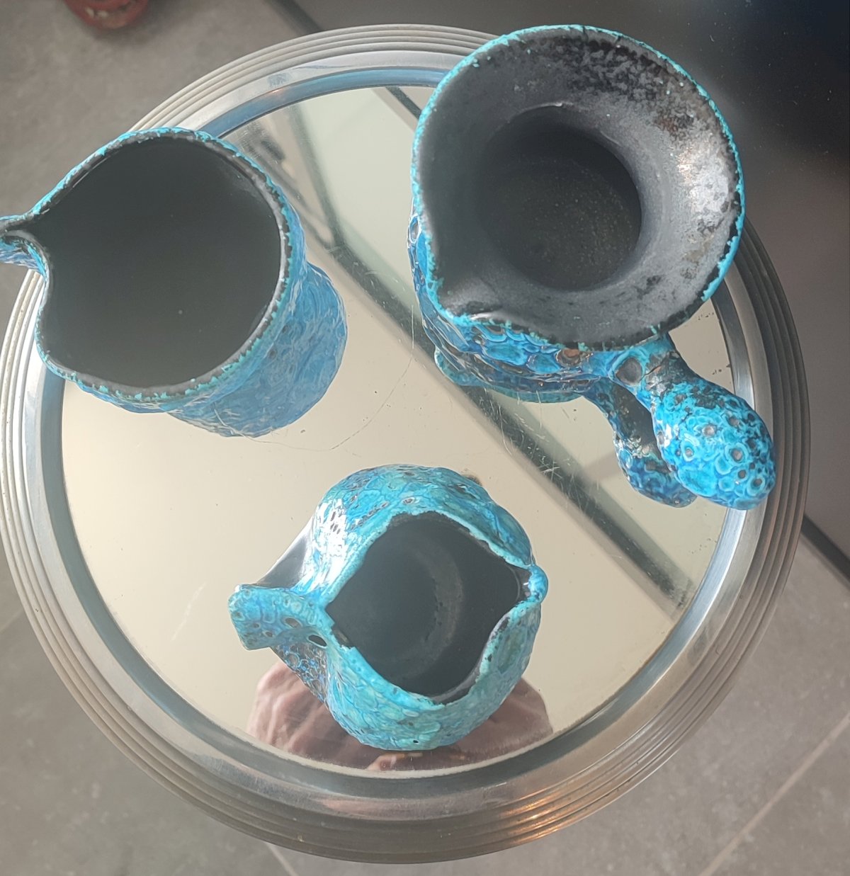 Composed of 3 pieces of workshop ceramics, covered with a thick turquoise glaze Emaux des Glaciers Cyclope with a strongly bubbled and cratered Fat Lava texture attributed to Charles Cart.