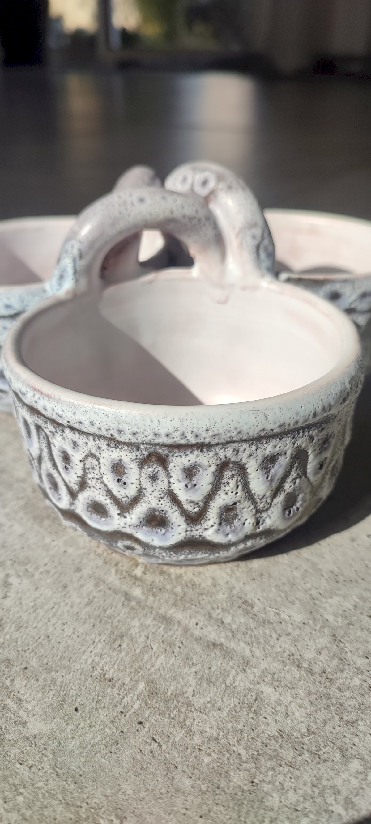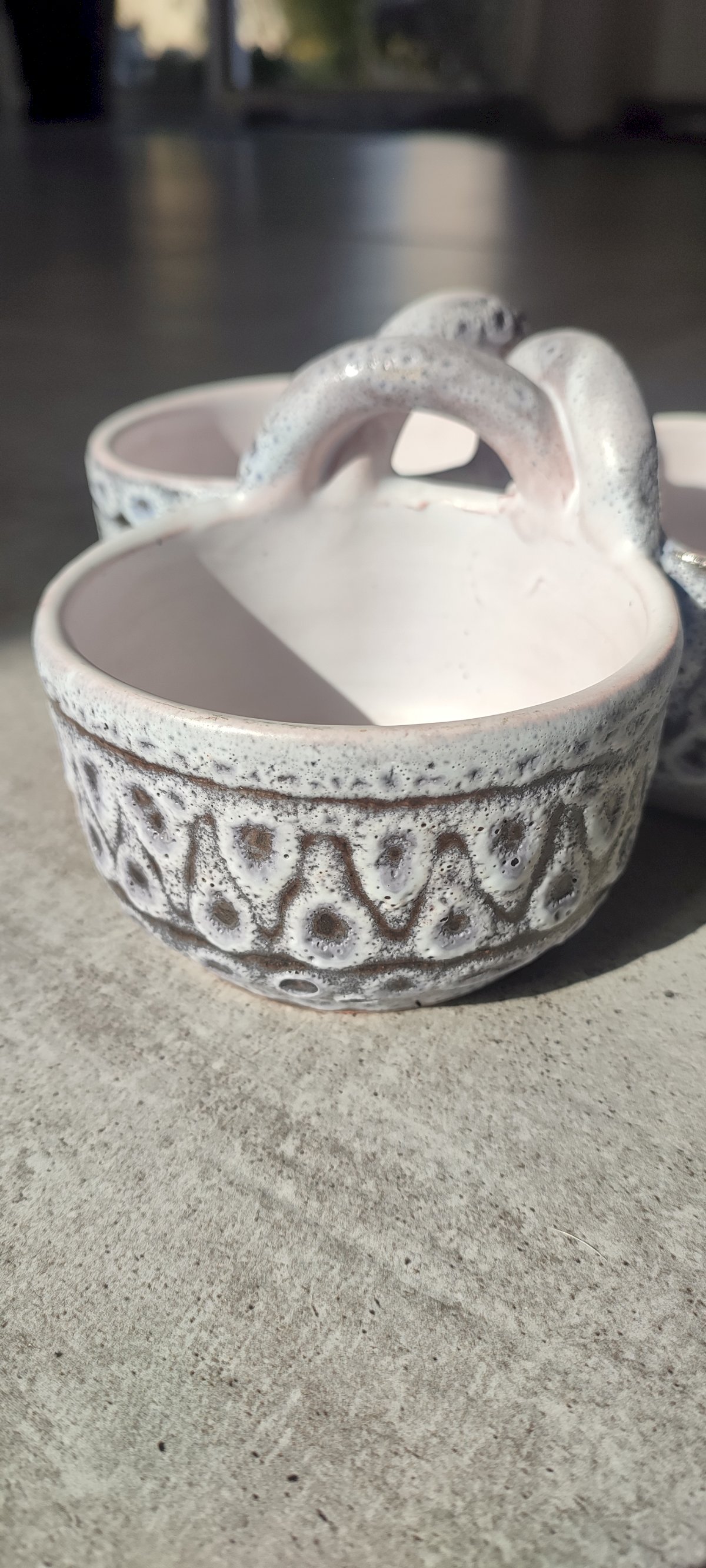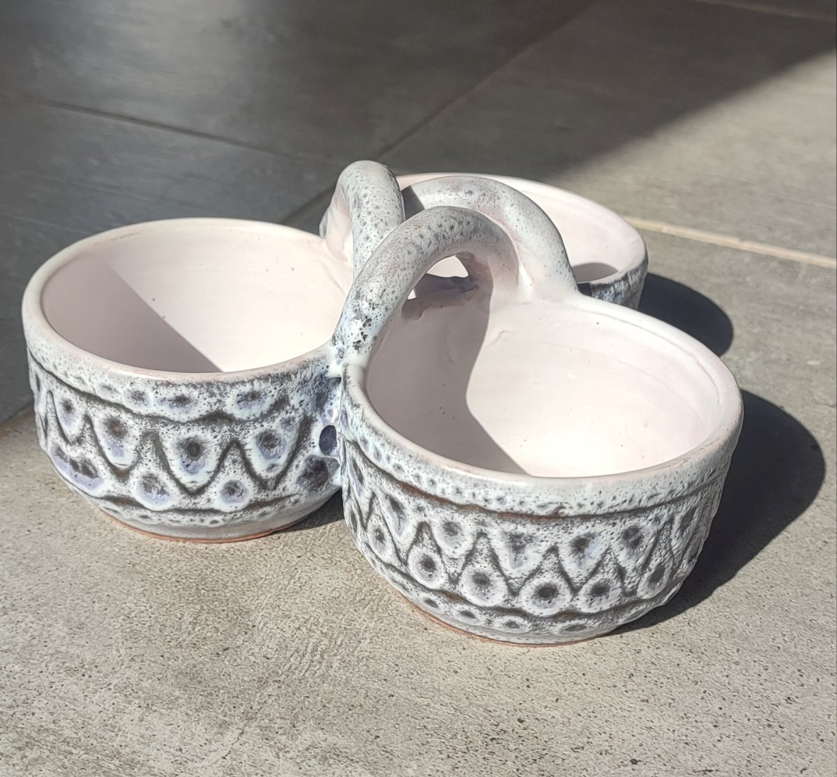 The object features three bowls connected by an intertwined helical handle, a technical feat perfectly preserved here. The piece is distinguished by its frothy white-grey glaze with an "orange peel" effect, whose transparency reveals the terracotta underneath. This process creates very pretty pink and ochre nuances within the incised geometric patterns (chevrons and small cups).