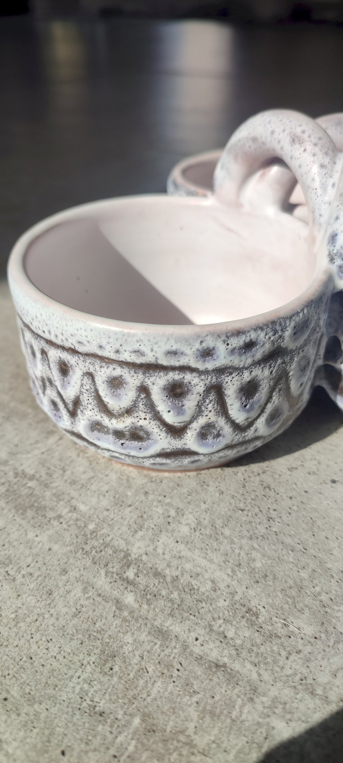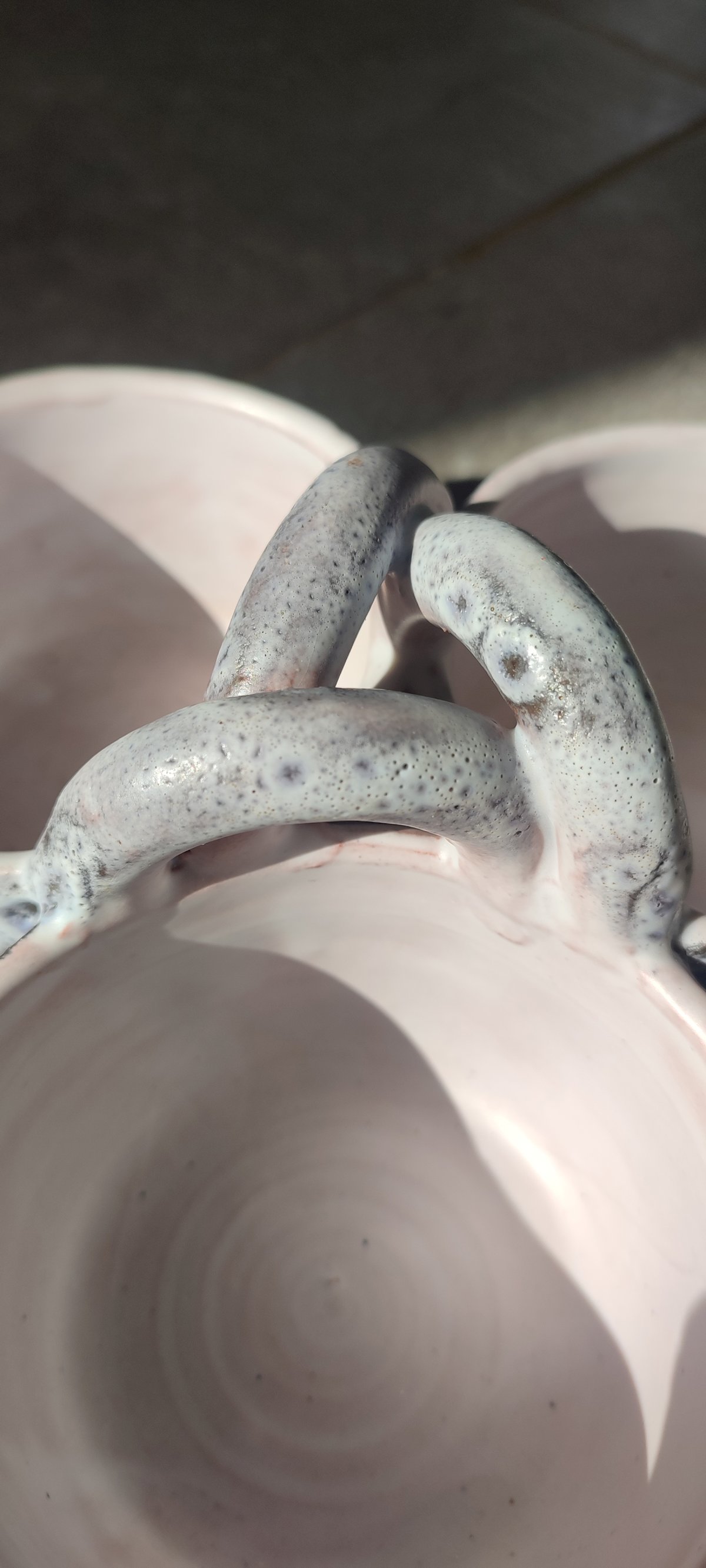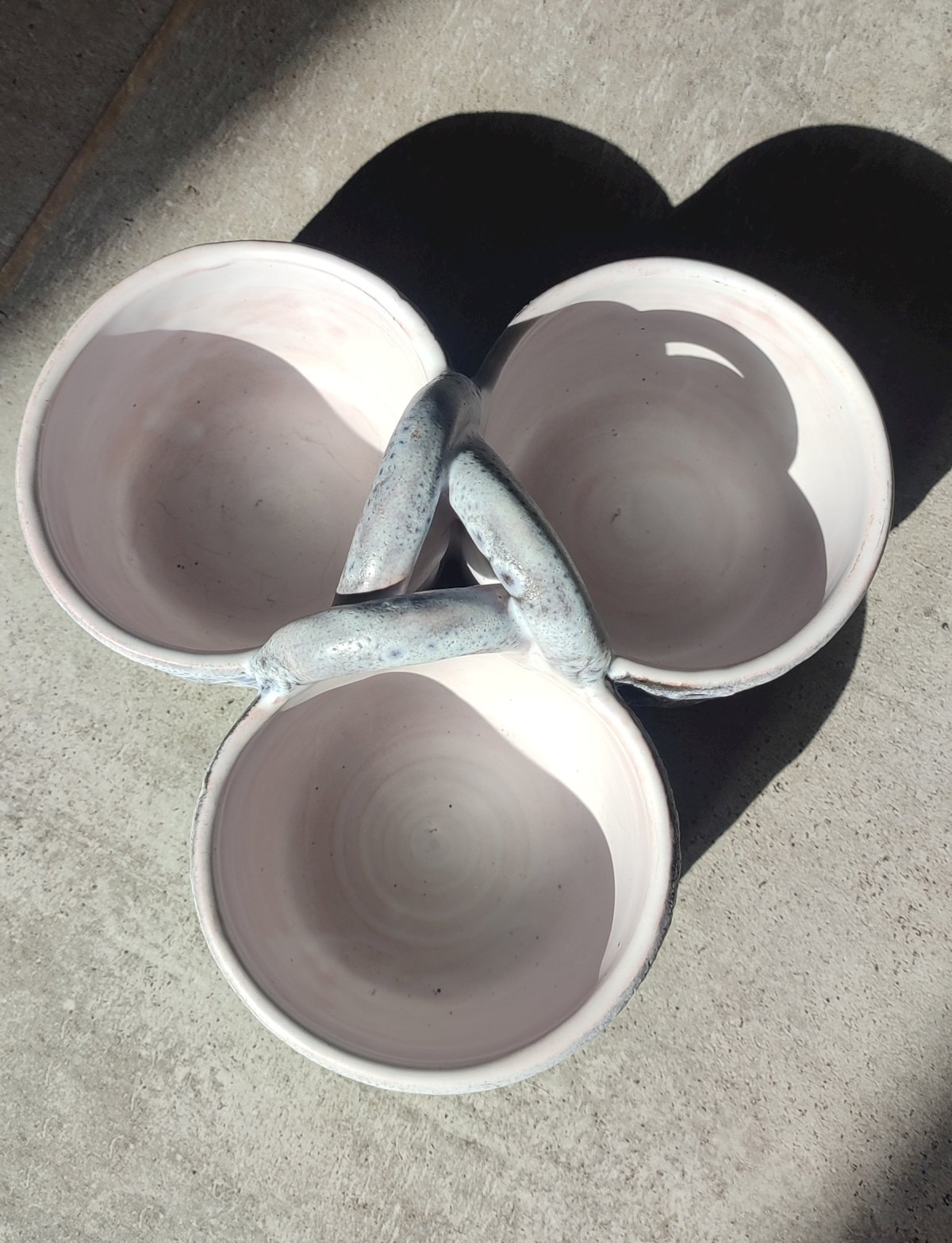 The object features three bowls connected by an intertwined helical handle, a technical feat perfectly preserved here. The piece is distinguished by its frothy white-grey glaze with an "orange peel" effect, whose transparency reveals the terracotta underneath. This process creates very pretty pink and ochre nuances within the incised geometric patterns (chevrons and small cups).