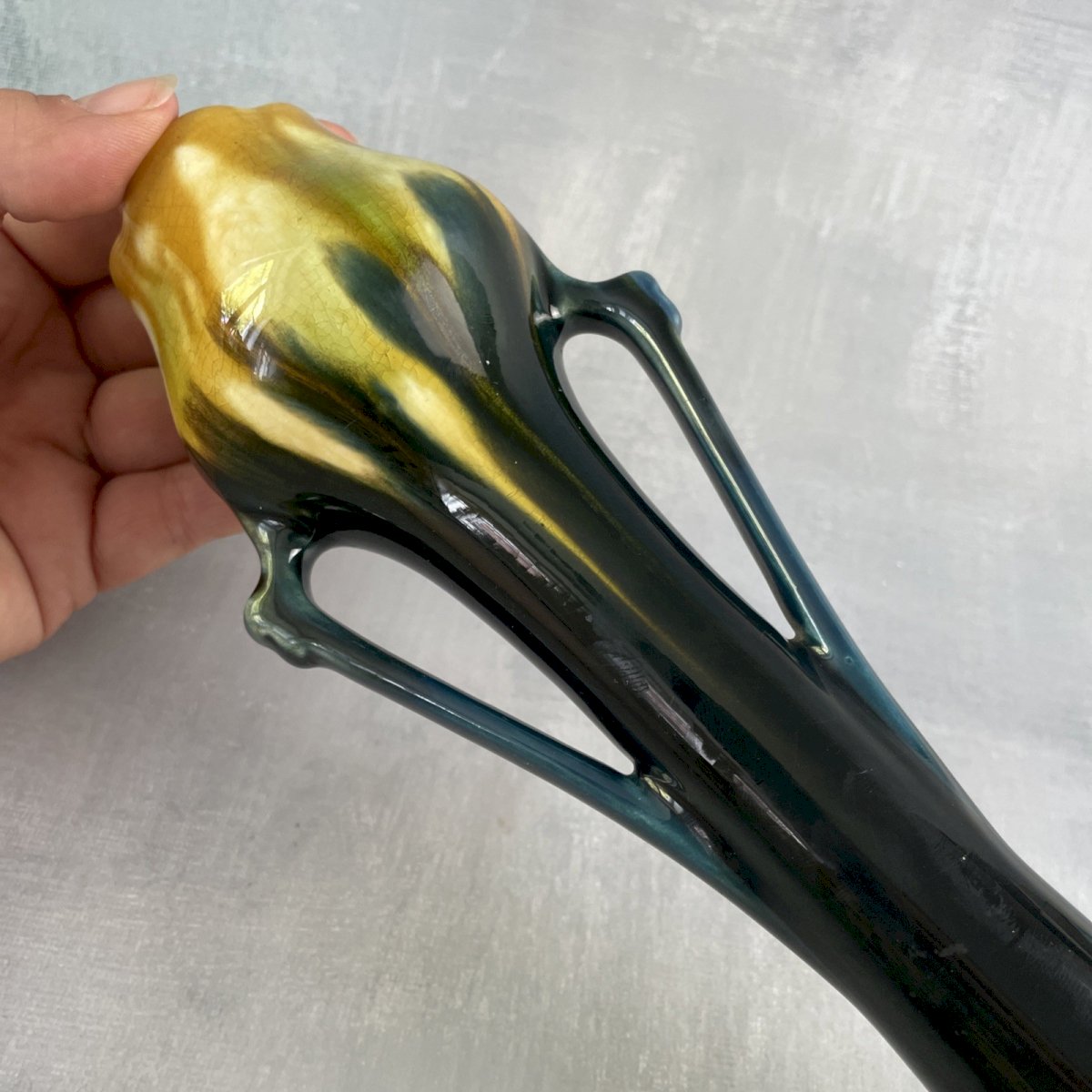 Art Nouveau style earthenware vase in the shape of a tulip flower, Belgium Thulin? unmarked Height ~ 25.8 cm Base ~ 9 cm Weight ~ 0.3 kg Good condition, two hairline cracks at the neck, chips underneath (due to removal of glaze drippings?), see photos. Remember to combine your purchases to reduce shipping costs! Country of manufacture: Belgium