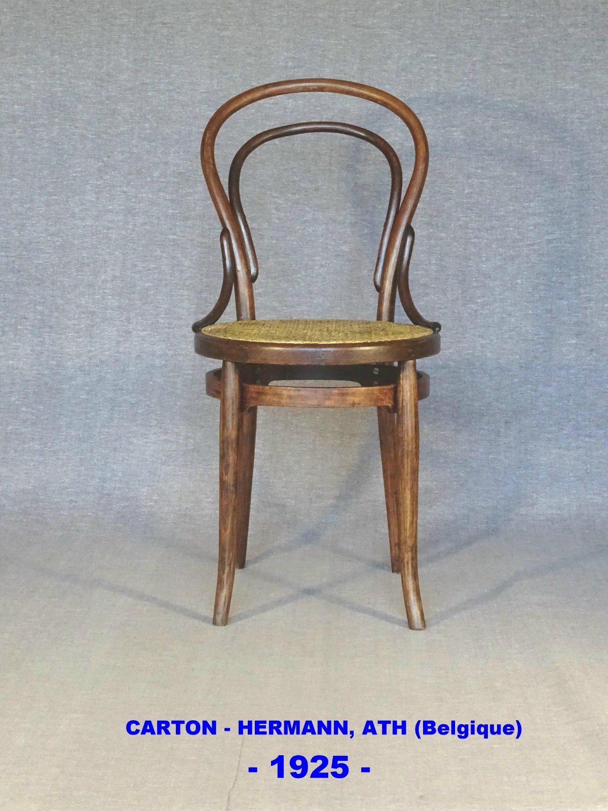 Very classic chair n°14 from the Carton company (-ATH -Belgium). The foot support ring is named "double ring" in the documents of the CARTON company, as its shoulder at the foot level allows for two screws to be placed on each leg. Recent caning, solid and stable chair. Total height: 91 cm, seat height: 47 cm, no markings. More photos and information available upon request. Delivery in France and Europe or pick up in Alsace. Color: Light brown Number of pieces: 1 Type: Chair Brand: Carton Subtype: Bistro Country of origin: Belgium Material: Beech Style: 1925