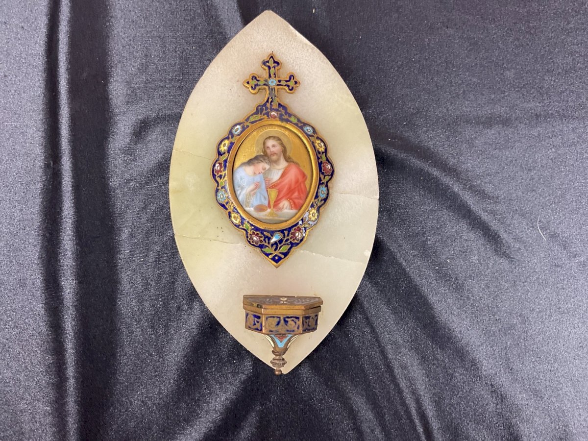 Enamelled holy water font, Jesus and the Virgin painted / porcelain, Napoleon III Attention, onyx and break Height: 16.5 cm Width: 9.5 cm Condition: Used: Item that has been used. Please refer to the seller's description for more details... Used: Item that has been used. any imperfections. Type: Christianity Subtype: Holy water font Material: Onyx and enamel