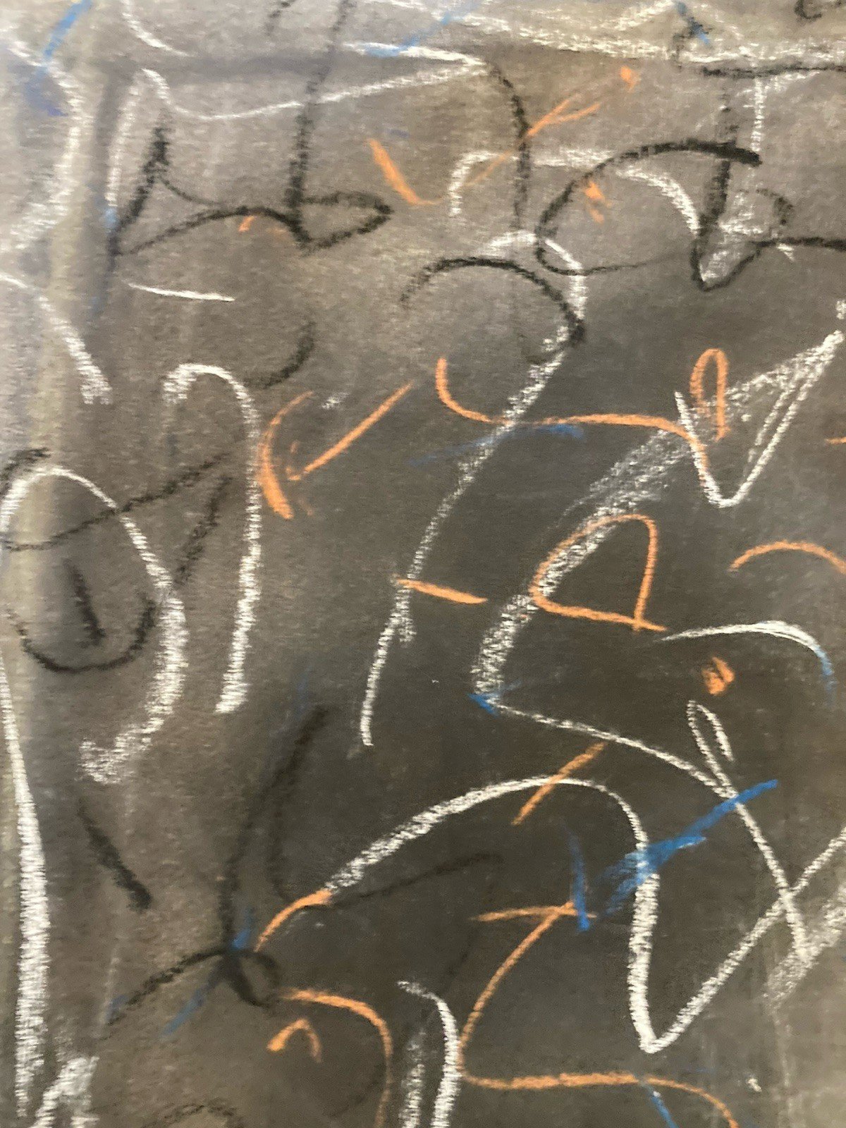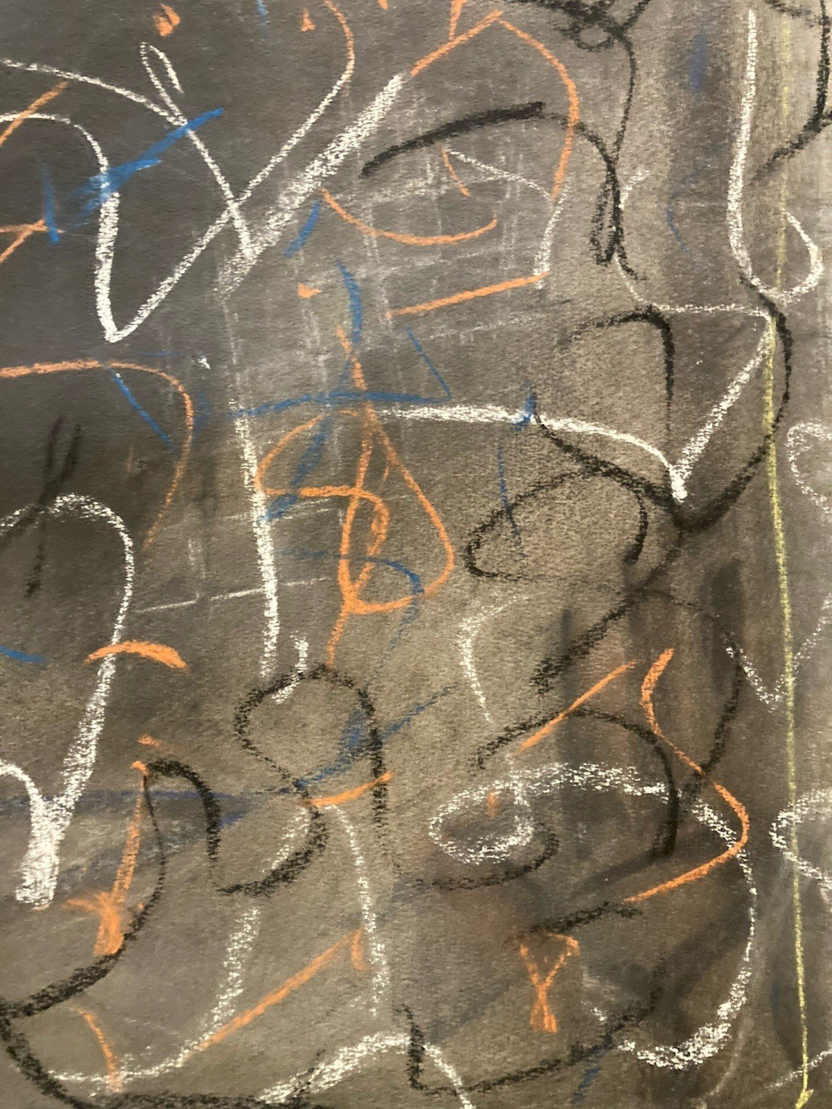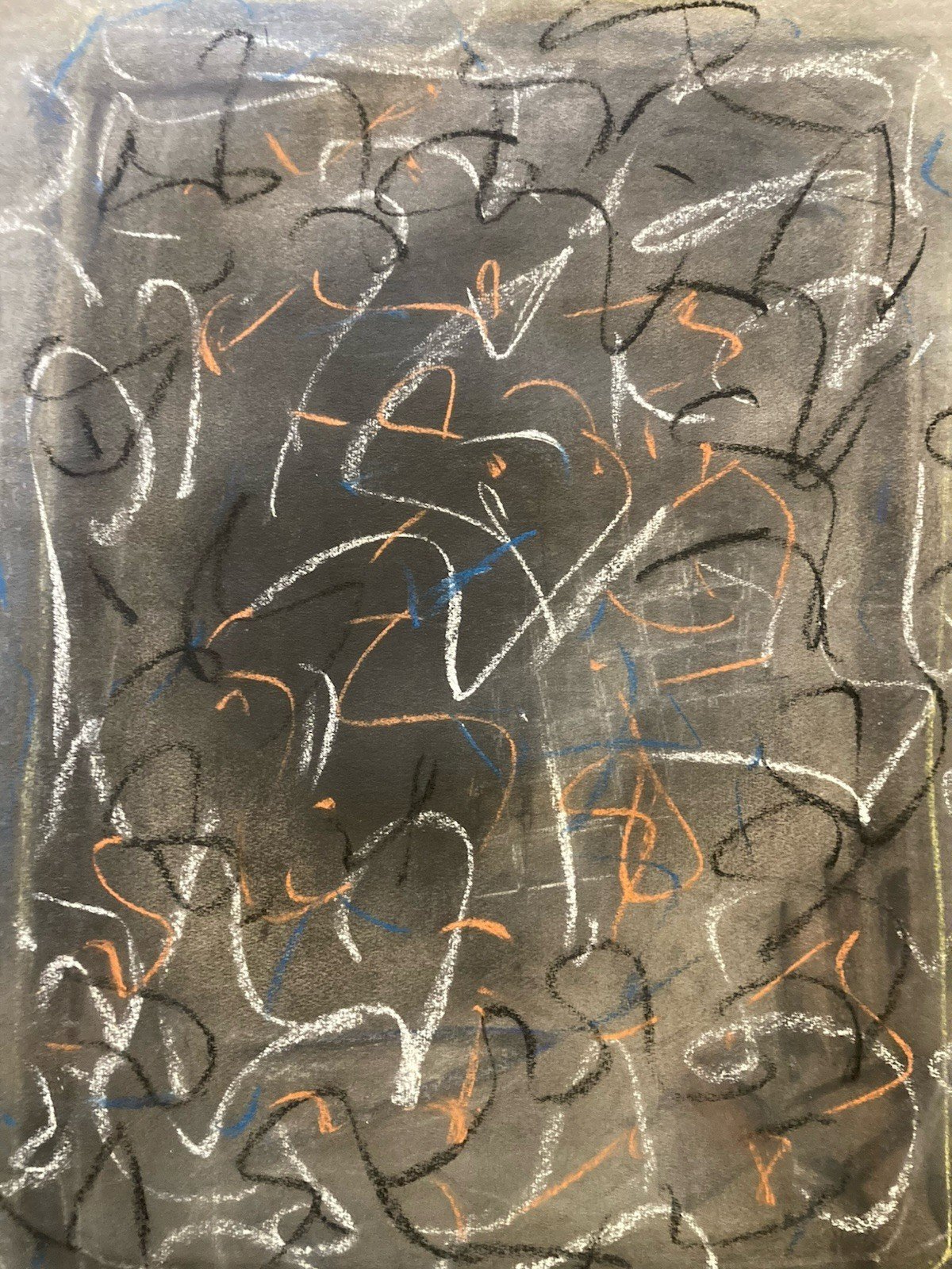 Additional Analysis: The work can be read as a visual metaphor of human interiority: the interlocked lines evoke internal tension, questioning, or emotional flow. The constraint of the internal frame (structured edge) could suggest a desire to contain this flow of energy, characteristic of Mélot’s approach. The charcoal, used with little fixative, expresses a lively fragility: each stroke seems uncertain, ready to disappear — an ephemeral dimension that aligns with the expression of the soul in transformation.
