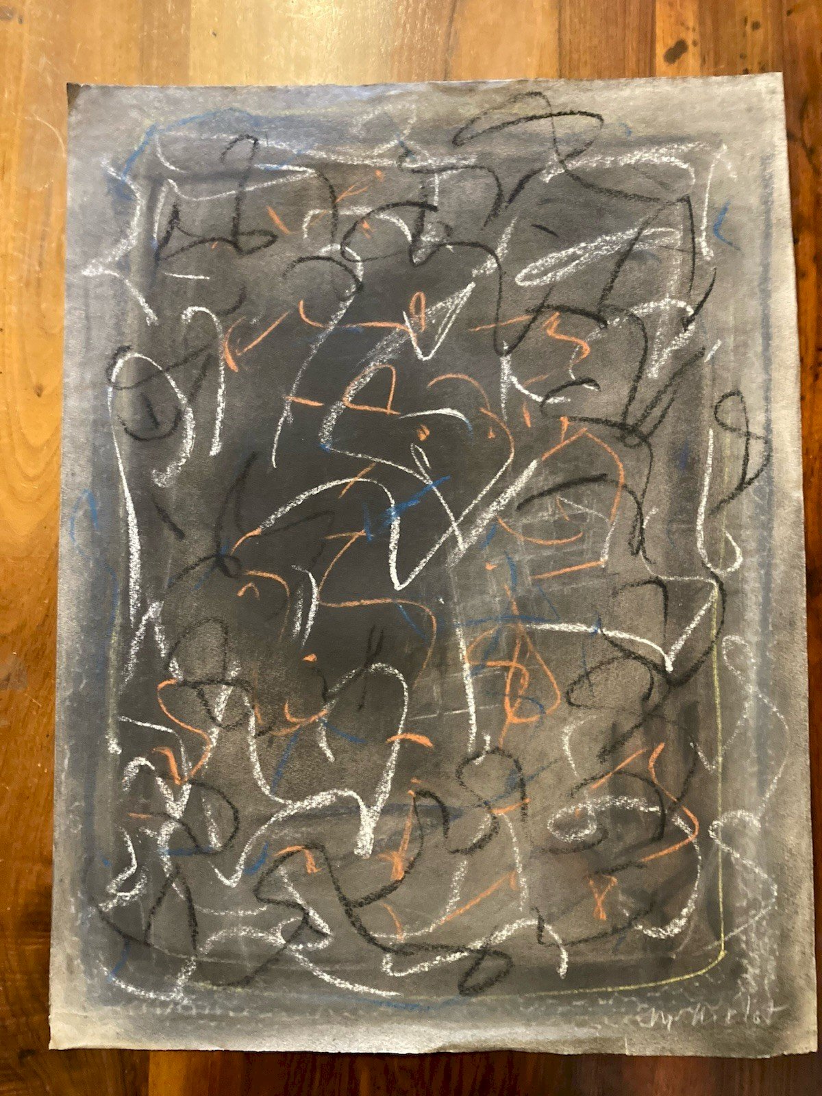 Description of the work (charcoal on paper, circa 1980 — approximately 65×50 cm) Support & Dimensions: Charcoal on paper, approximate dimensions 65 × 50 cm, signed at the bottom right — typical of Mélot’s medium-sized paper works from the 1980s. Composition & Colors: Dark background (dark brown black), characteristic of Mélot's introspective works, creating a meditative atmosphere. Dynamic gestural marks in white, gray, and possibly red or yellow, with a fluid writing style, in spirals or arabesques. Colorful elements punctuate the dominant black, creating contrast and vibration. Style & Meaning: Formal pupils: movement, rhythmic tension without explicit figurative representation. The work evokes expressive informal abstraction, where the gesture is almost choreographic. The absence of recognizable forms encourages an emotional reading — a quest for meaning, psychological depth, confrontation of darkness and light, a constant theme in Mélot's work. Signature & Period: The signature at the bottom right corresponds to his usual practices towards the end of his life: sober, discreet, focused on gesture and matter rather than on displaying identity. The 1980s period corresponds to his intense abstraction phase ("mops," "grids," broken heads…) described in his biography.