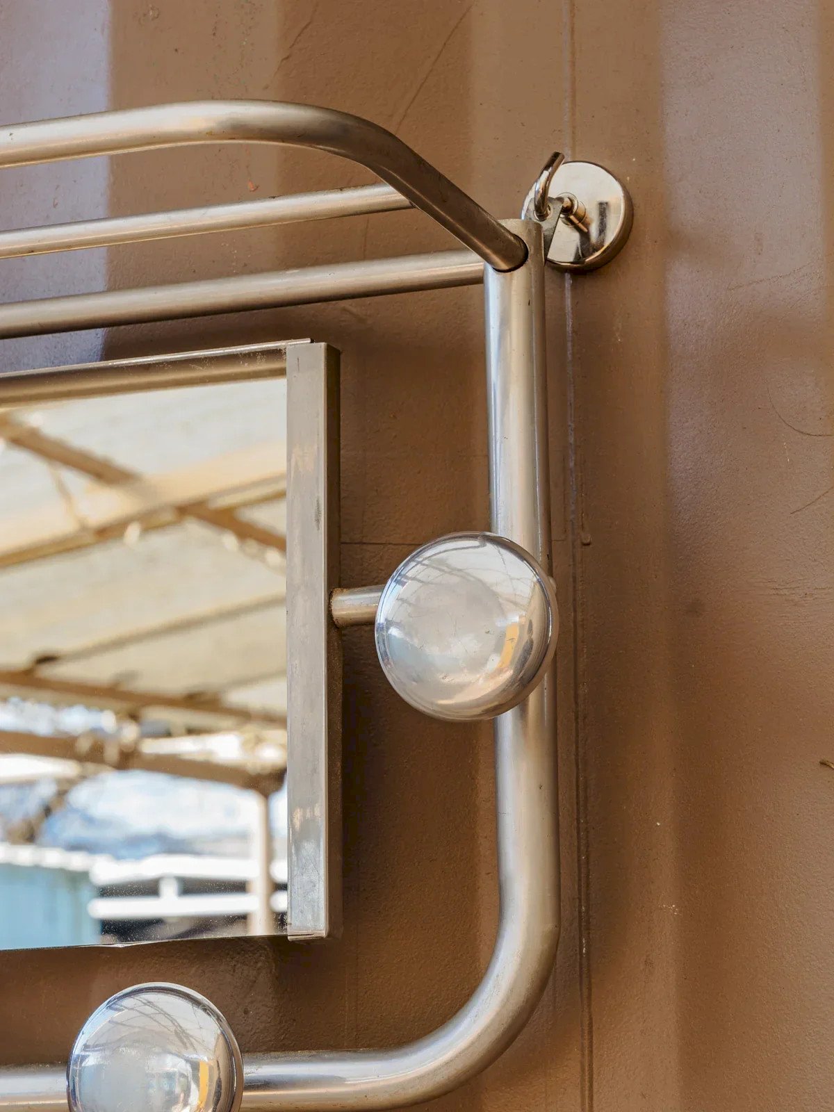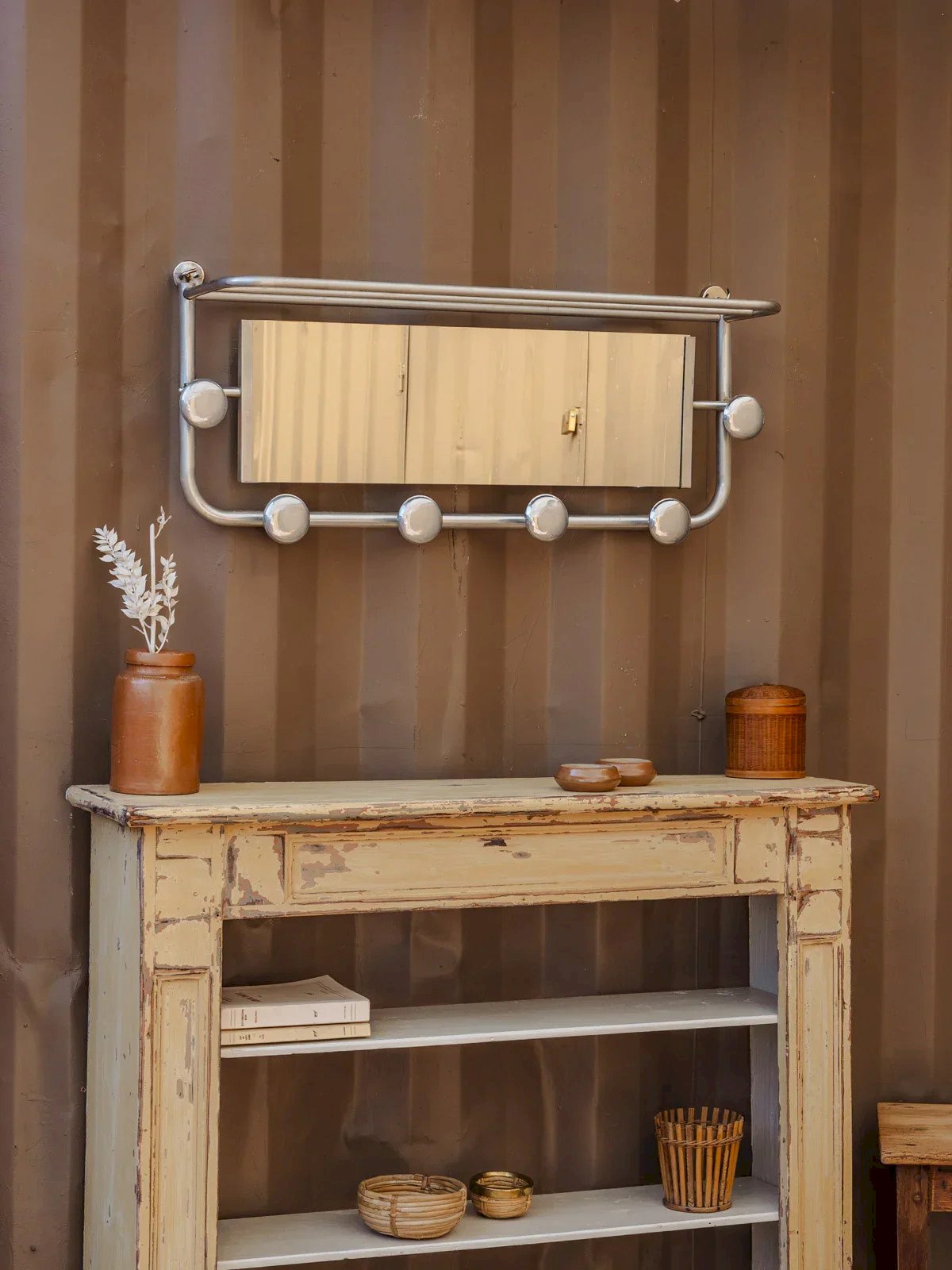 Add a vintage and bright touch to your entryway with this chrome wall-mounted coat rack, equipped with an integrated mirror and a top shelf for placing keys or small items. Its polished metal structure gives it a sleek and elegant silhouette. Its six hooks accommodate coats, bags, and hats without cluttering the space, offering functional and decorative storage. There are some traces of time present. Length: 76 cm Width: 21 cm Height: 32.5 cm A brief history of the coat rack The term "coat rack" appeared in the 18th century, although the concept dates back to Antiquity. Initially simple hooks fixed to the walls, it evolved into an elegant and functional support, often freestanding. First present in the halls of bourgeois homes, it welcomed coats and hats, quickly becoming an essential element of interior design. Today, coat racks adapt to all styles, combining practicality and aesthetics. Condition: Used: Item that has been used. Item showing some superficial signs of wear, fully operational and functioning correctly. It may be a display model or an item returned to the store after a short period of use. Possible imperfections. Brand: Debongout Type: Antique product Material: Chrome Style: Contemporary