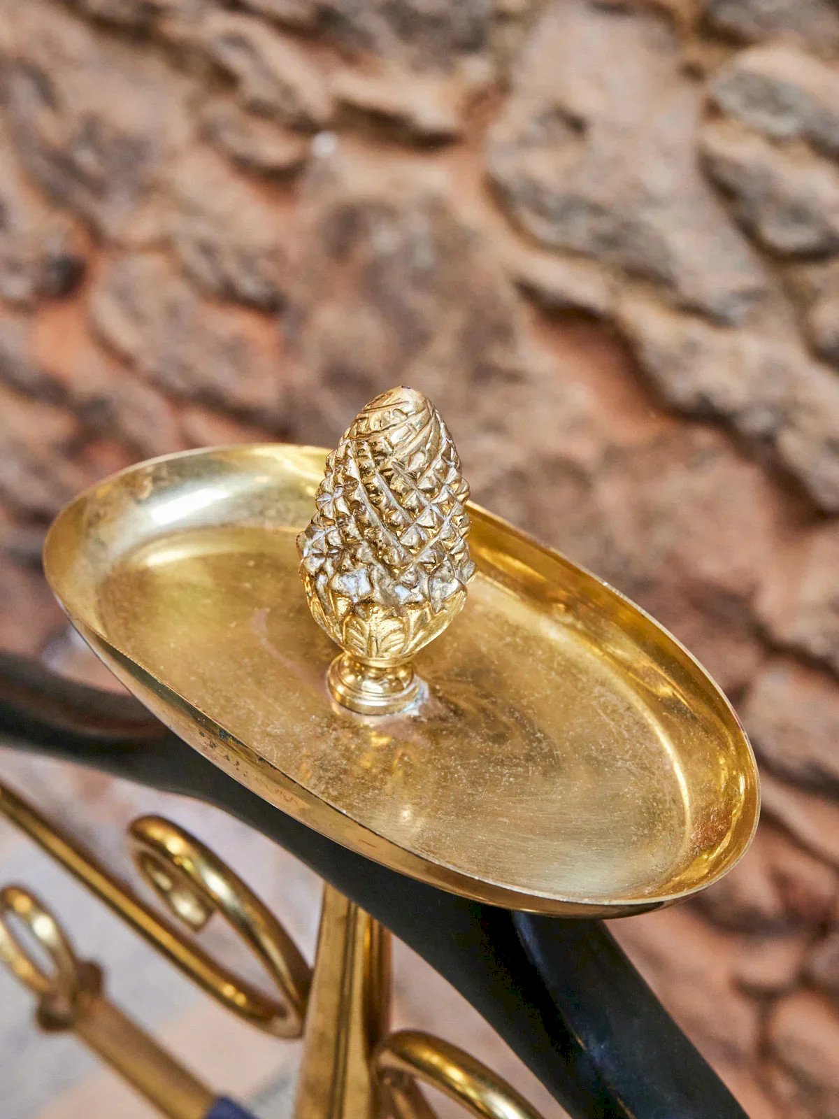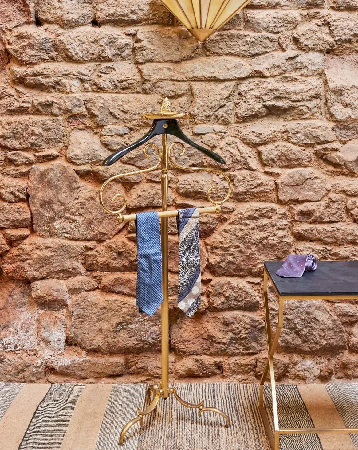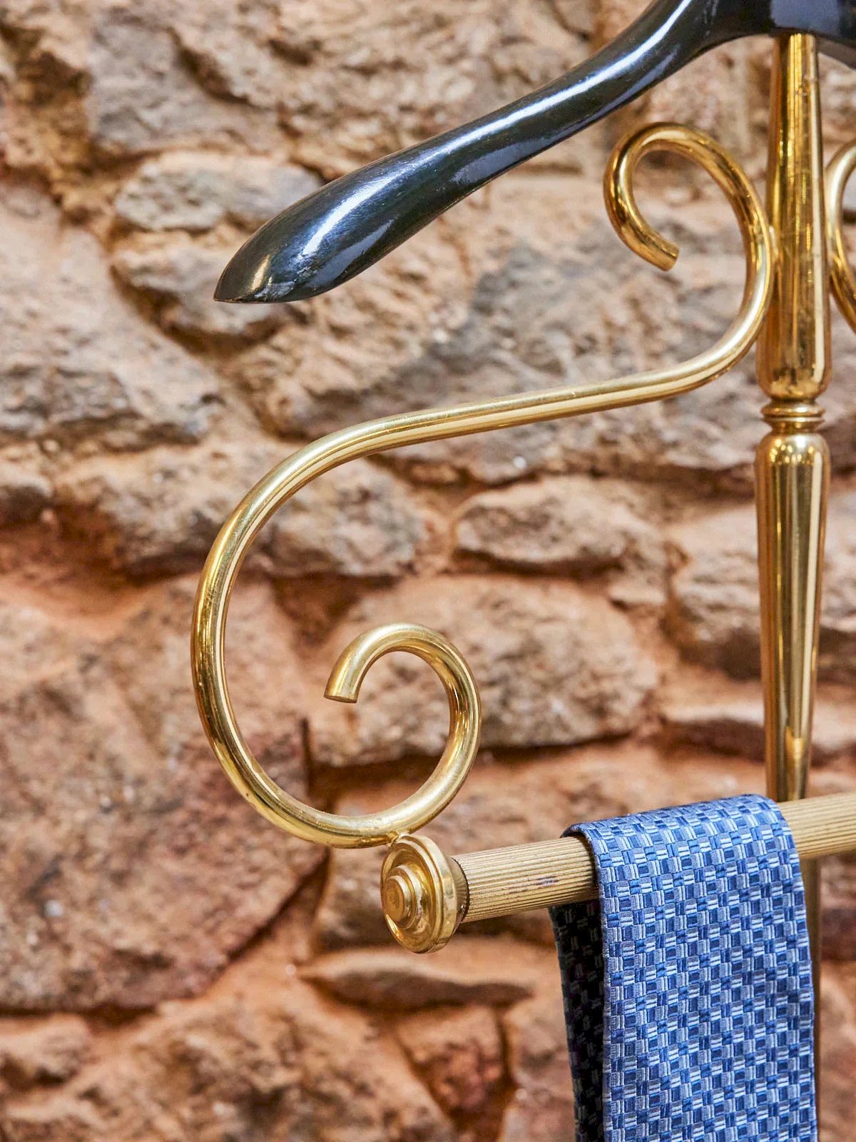 Adopt the Fratelli Reguitti valet coat rack, made in Italy from warm brass with a subtle grain, which creates a refined and minimalist silhouette. Designed to hold jackets, trousers, and accessories, it ensures neat support and organizes outfits with rigor and elegance. Its Italian craftsmanship is felt in the finesse of the finishes and the sturdiness of the materials. It establishes a sober and sophisticated atmosphere in the bedroom or dressing room. Length: 50 cm Width: 45 cm Height: 110 cm A brief history of the coat rack The term "coat rack" appeared in the 18th century, although the concept dates back to antiquity. Initially simple hooks fixed to walls, it evolved into an elegant and functional support, often freestanding. First seen in the halls of bourgeois homes, it held coats and hats, quickly becoming an essential element of interior design. Today, coat racks adapt to all styles, combining practicality and aesthetics. Condition: Used: An item that has been used. Item showing some superficial signs of wear, fully operational and functioning correctly. It may be a demonstration model or an item returned to the store after a short period of use. Possible imperfections. Brand: Debongout Type: Thrifted product Material: Brass Style: Contemporary