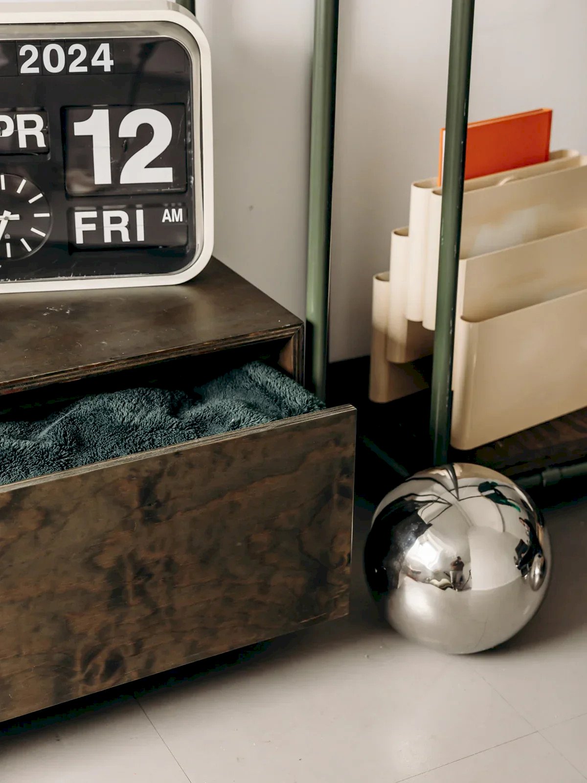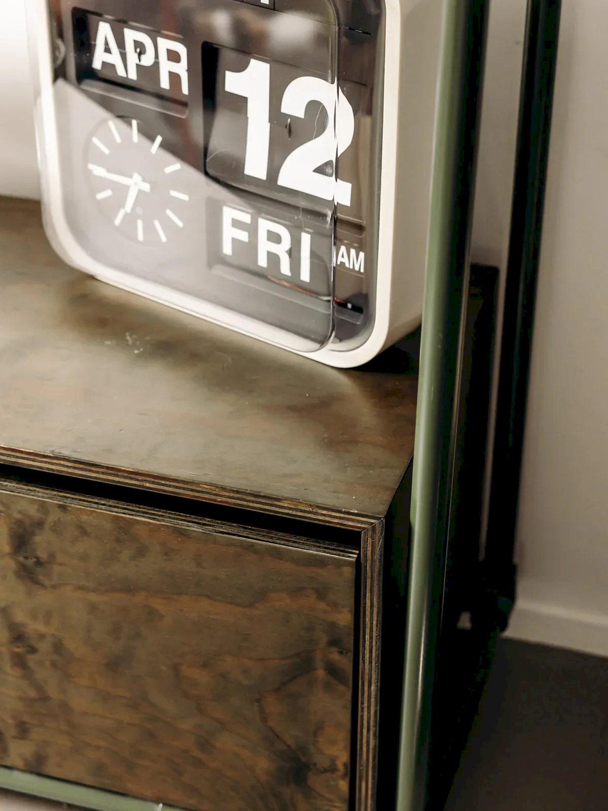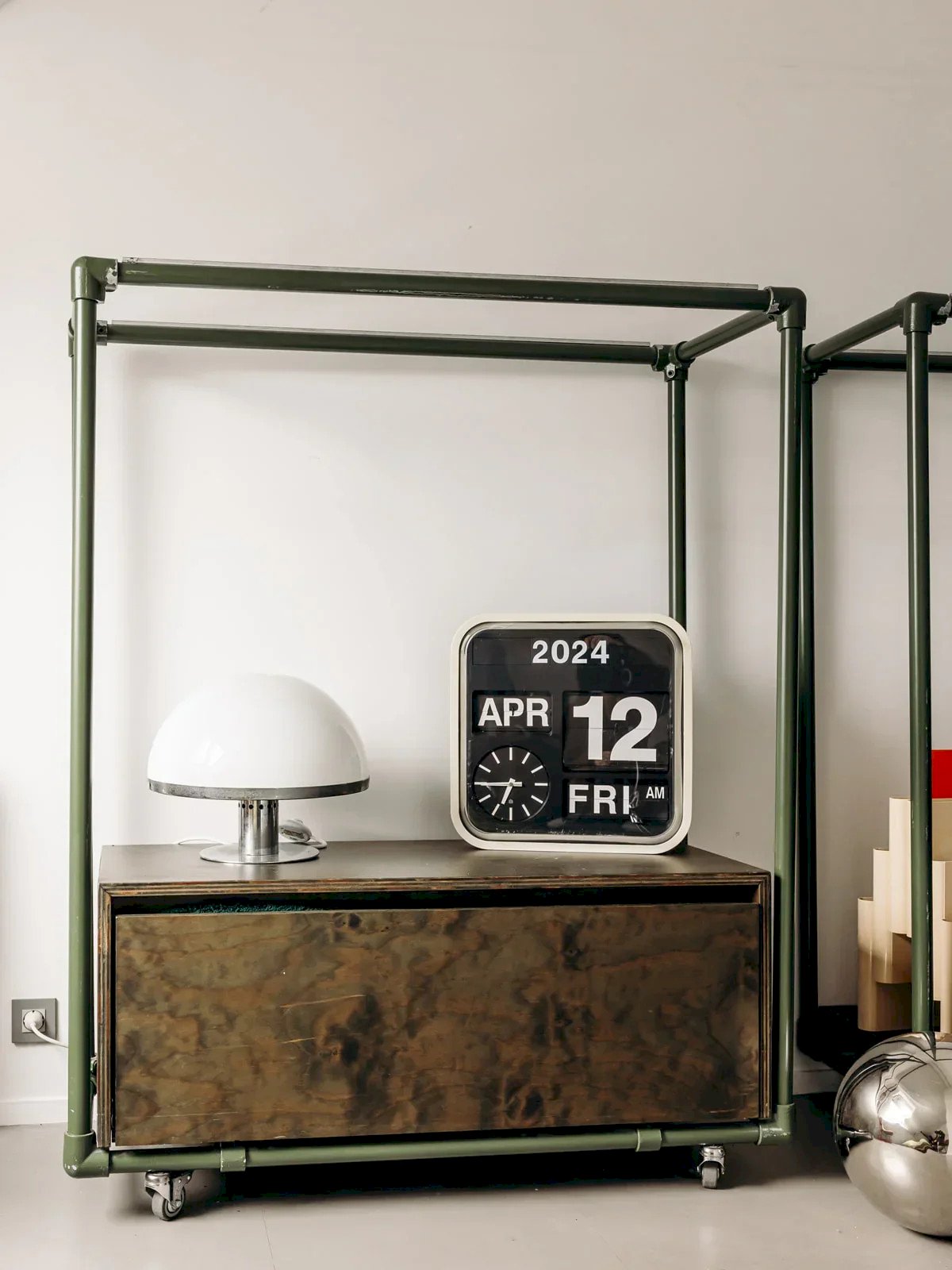 Discover this storage unit or wardrobe in an industrial style, a versatile piece from the 90s. With its khaki metal structure and textured wood, it combines durability and raw aesthetics, perfect for a bold interior. Functional and practical, this piece is equipped with a spacious chest drawer and rests on wheels, making it easy to move according to your needs. Ideal as an extra wardrobe in an entryway, a bedroom, or a dressing room, it also fits perfectly in a loft or an industrial-style space. Length: 119 cm Width: 45 cm Height: 149 cm Drawer height: 24 cm Drawer outer length: 108 cm Drawer outer width: 48 cm Condition: Used: Item has been used. Item shows some superficial signs of wear... Used: Item has been used. Item shows some superficial signs of wear, fully operational and working correctly. It may be a display model or a returned item after a short period of use with potential imperfections. Brand: Debongout Type: Curated product Material: Wood, Metal Style: Contemporary