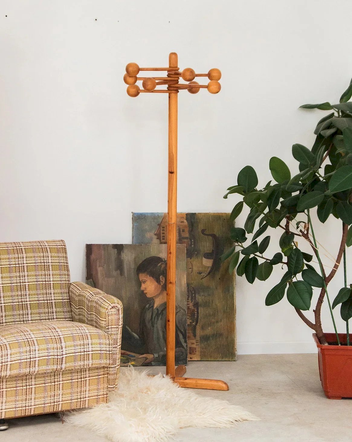 Discover our elegant light wood coat rack, a practical and aesthetic accessory for your interior. Equipped with 8 integrated and adjustable hooks, it adapts to all your desires while optimizing space. Its large cross foot ensures perfect stability, providing a reliable support for your clothes while adding a touch of style to your decor. An ideal choice for an entrance hall or a bedroom! Height: 155 cm Base diameter: 57 cm Hook diameter: 48 cm A brief history of the coat rack The term "coat rack" appeared in the 18th century, although the concept dates back to antiquity. Initially simple hooks fixed to walls, it evolved into an elegant and functional support, often free-standing. First present in the halls of bourgeois houses, it accommodated coats and hats, quickly becoming an essential element of interior design. Today, coat racks adapt to all styles, combining practicality and aesthetics. Condition: Used: Item has been used. Item shows some superficial signs of wear, fully functional and working properly. It may be a demonstration model or an item returned to the store after a short period of use. any imperfections. Brand: Debongout Type: Thrifted product Material: Wood Style: Contemporary