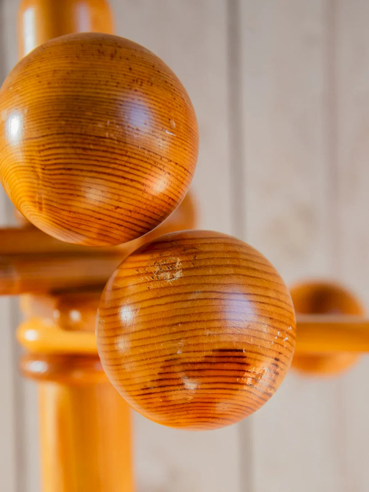Invite this 1970s wooden ellipse coat rack, with its organic and warm lines, which adds a controlled retro touch to your entryway or dressing room. Its eight heads, whose positions can be adjusted, offer practical modularity for hanging coats, hats, and scarves, while the feet ensure a stable base despite its sculptural look. Its patina reveals a beautiful material, ideal for a contemporary vintage atmosphere. Some signs of use are present. Length: 60 cm Width: 60 cm Height: 163.5 cm A little history of the coat rack The term "coat rack" appears in the 18th century, although the concept dates back to antiquity. Initially simple hooks fixed to walls, it evolved into an elegant and functional support, often freestanding. First featured in the halls of bourgeois homes, it held coats and hats, quickly becoming an essential element of interior design. Today, the coat rack adapts to all styles, combining practicality and aesthetics. Condition: Used: Item has been used. Item shows some superficial wear marks, ... Used: Item has been used. Item shows some superficial wear marks, fully operational and functioning correctly. It may be a demonstration model or an item returned to the store after a short period of use. any potential imperfections. Brand: Debongout Type: Curated product Material: Wood Style: Contemporary