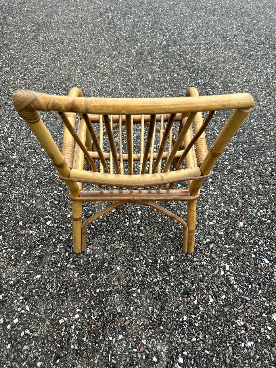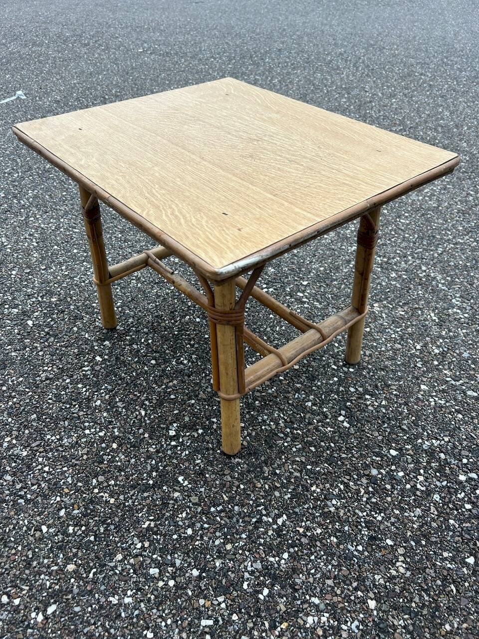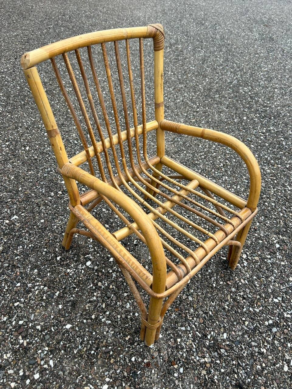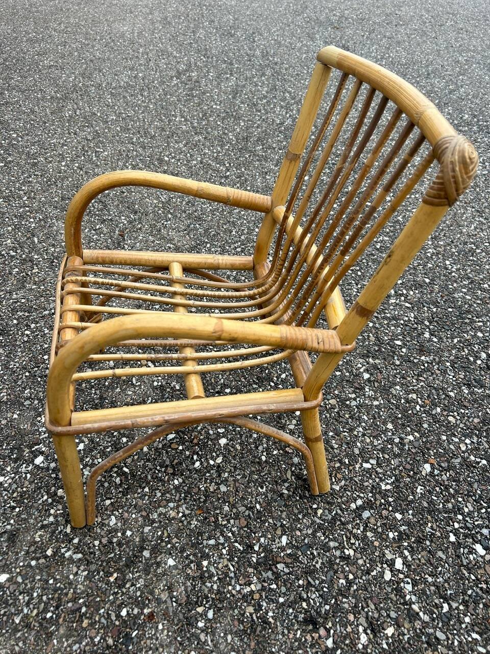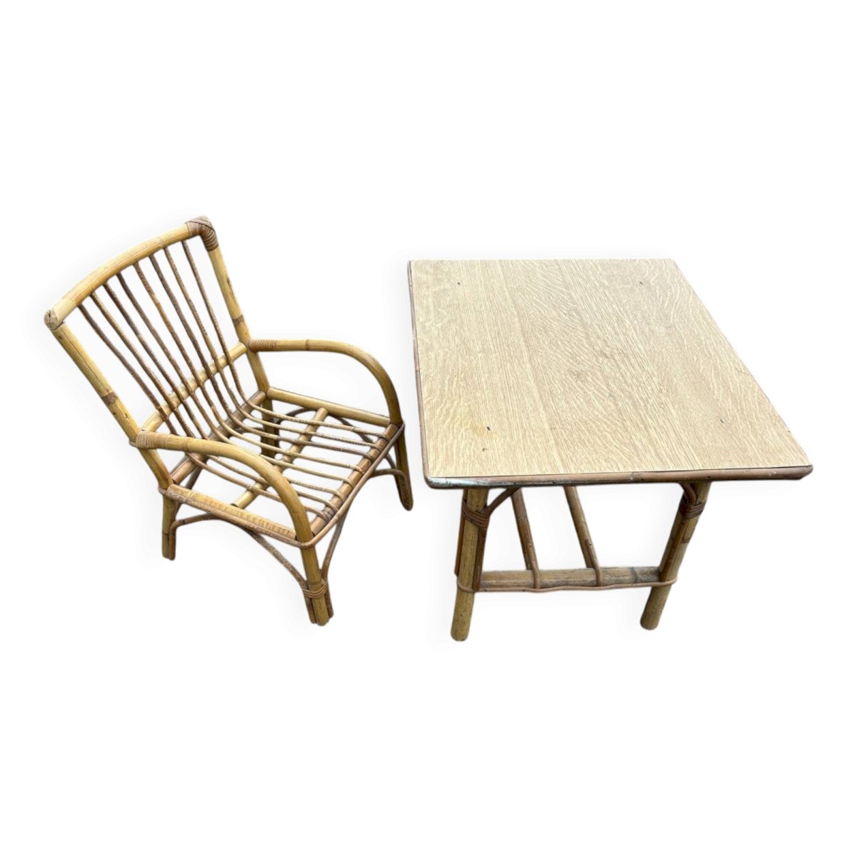 60s/70s children’s desk and chair in rattan, wooden tabletop. Chair height 47cm width 30cm depth 30cm seat height 20cm. Table 51/43cm height 40cm. L: 51 W: 43 H: 40