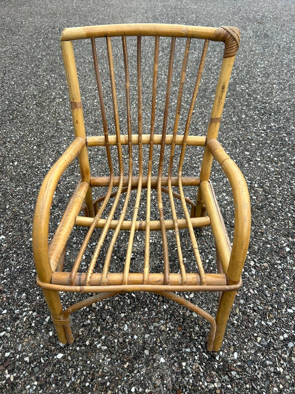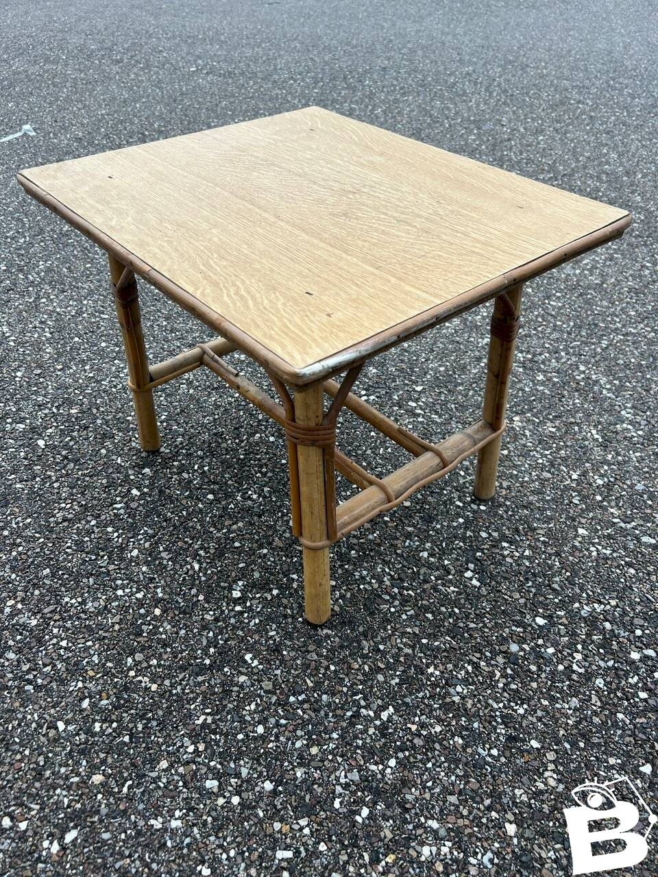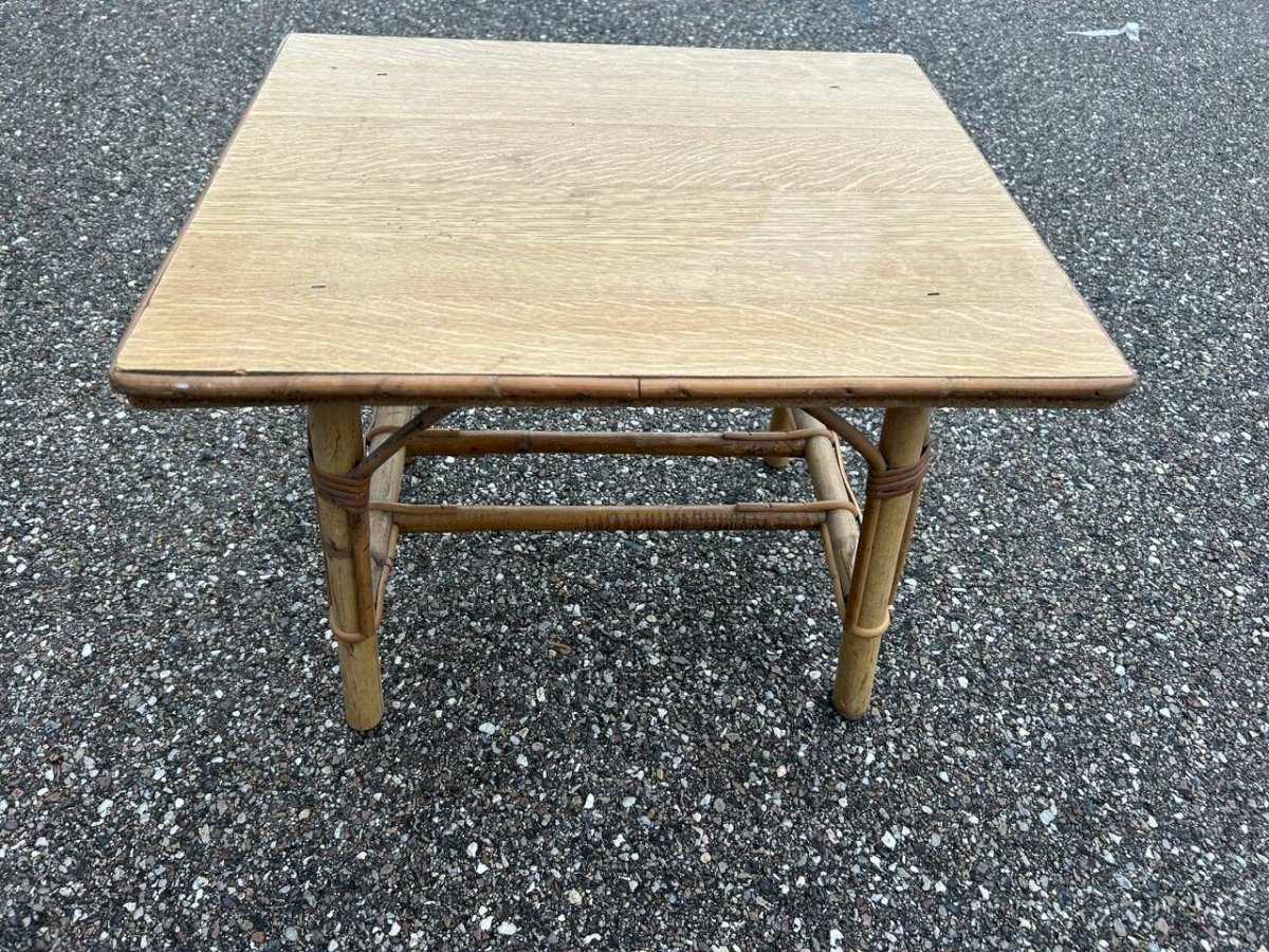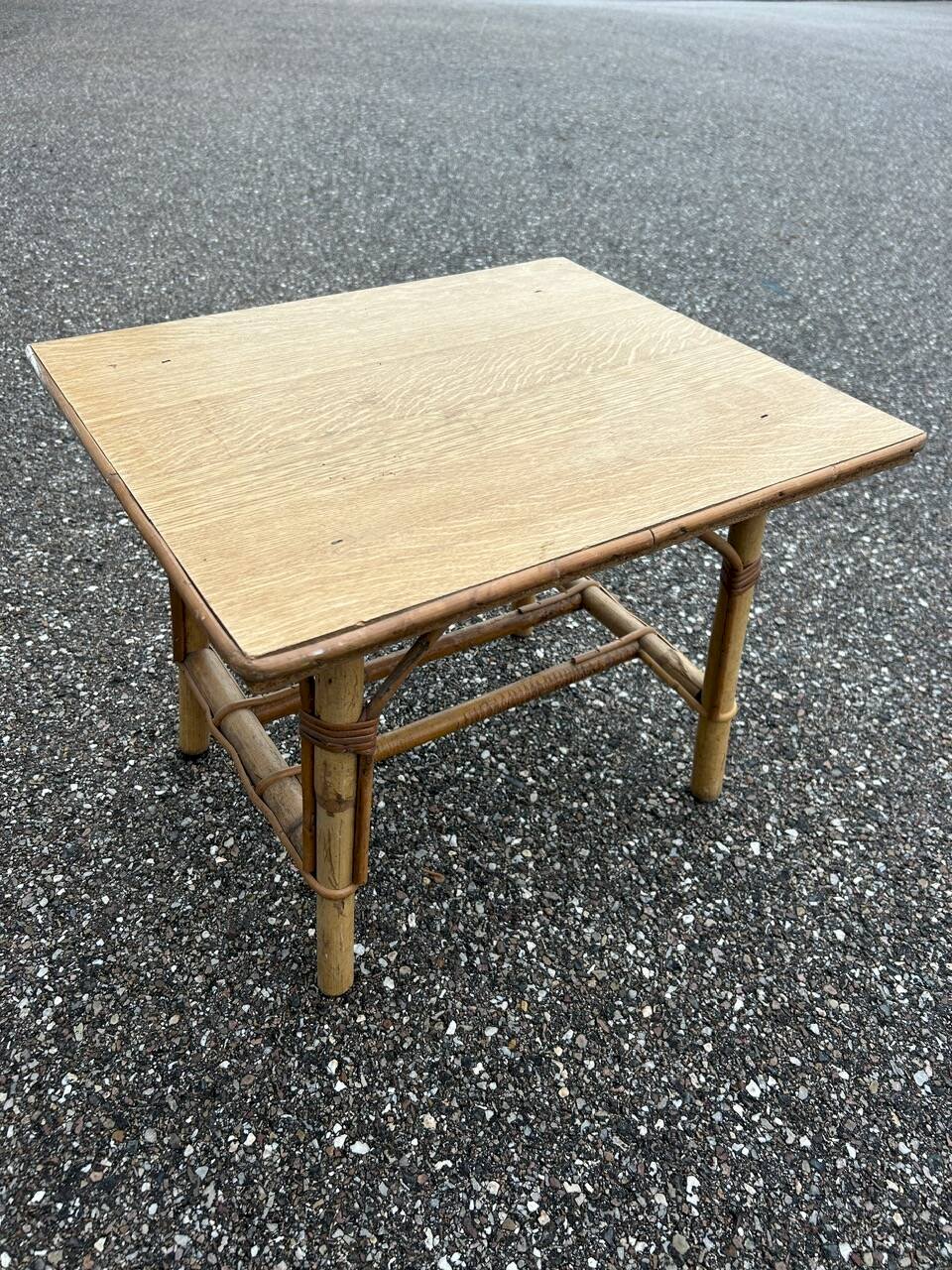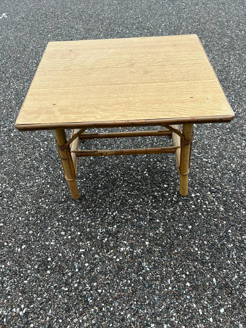 60s/70s children’s desk and chair in rattan, wooden tabletop. Chair height 47cm width 30cm depth 30cm seat height 20cm. Table 51/43cm height 40cm. L: 51 W: 43 H: 40