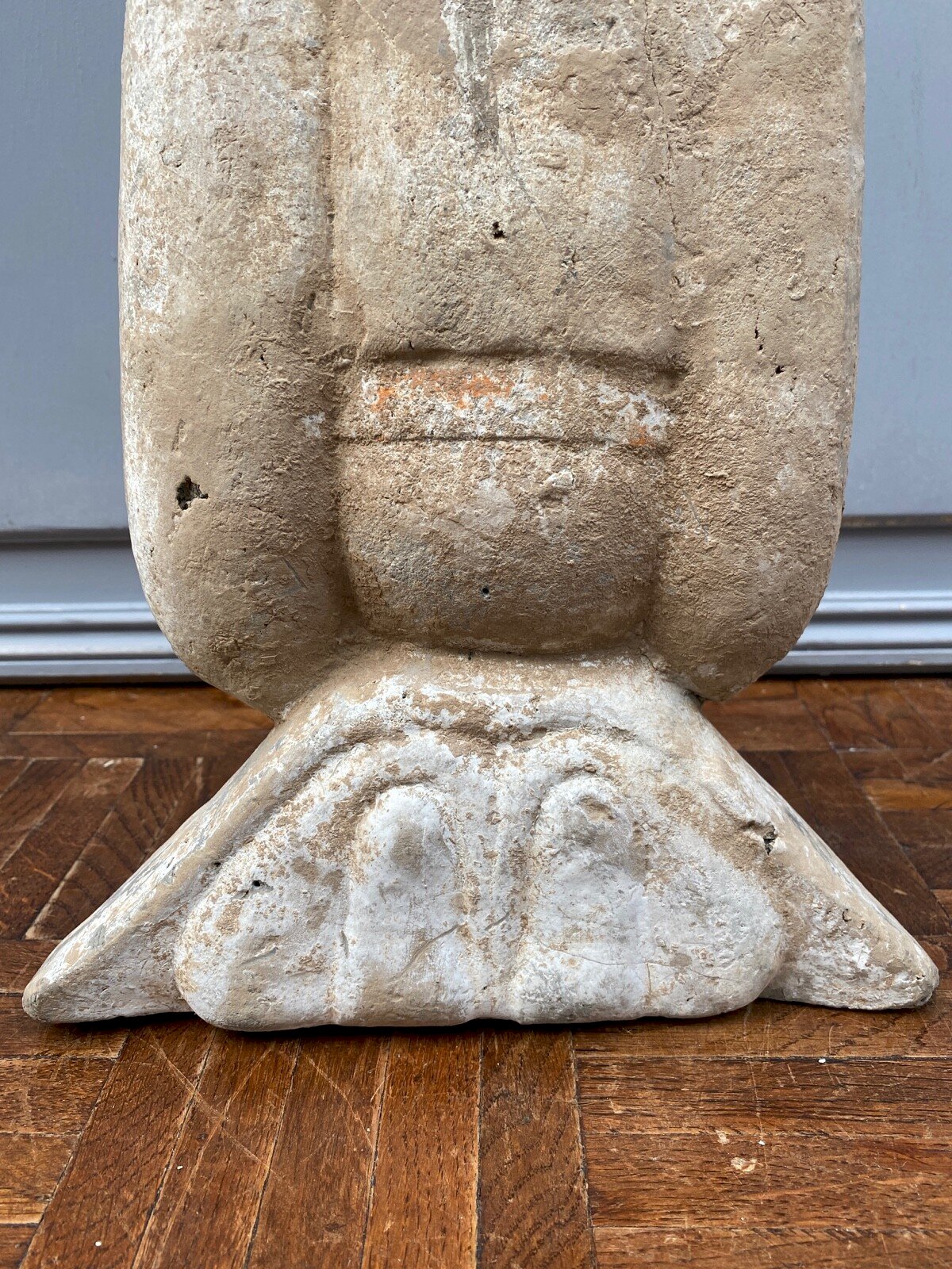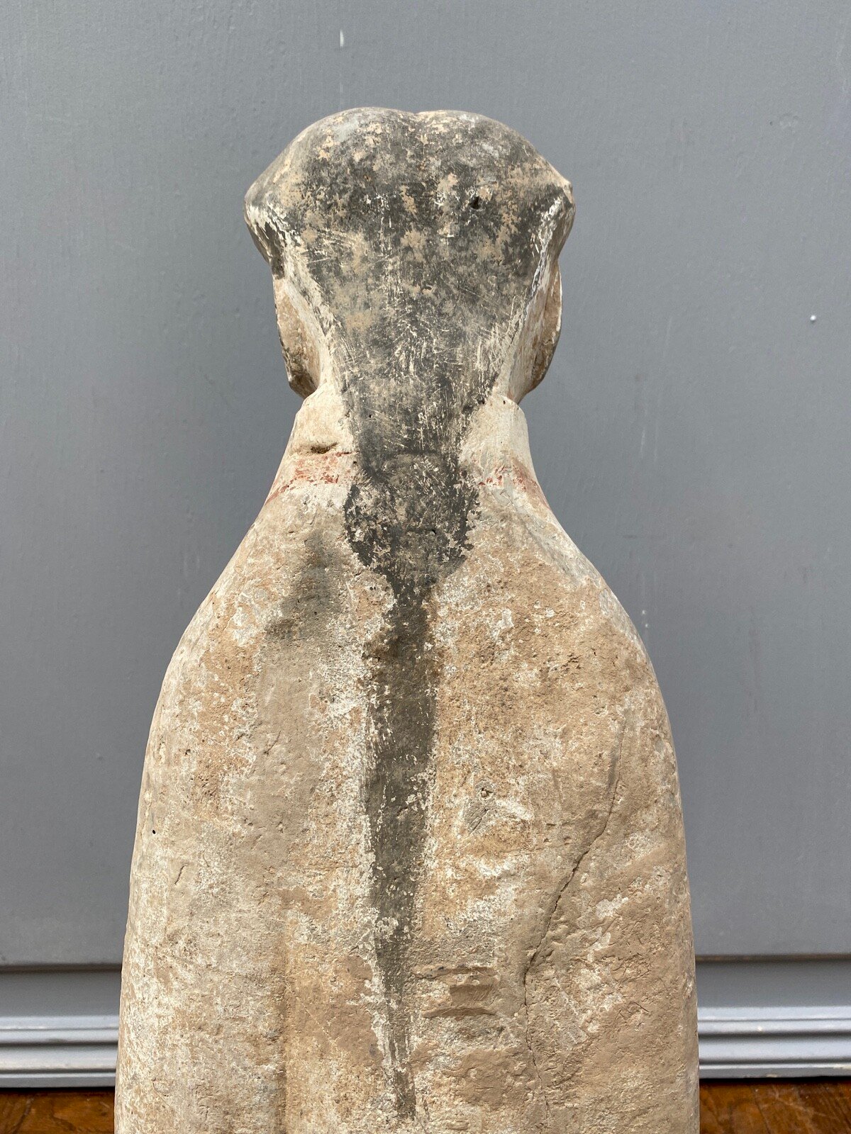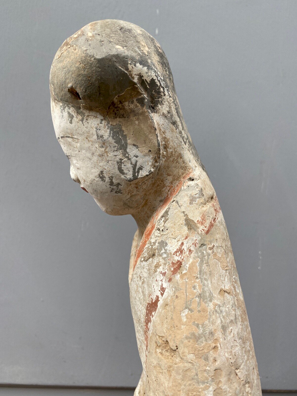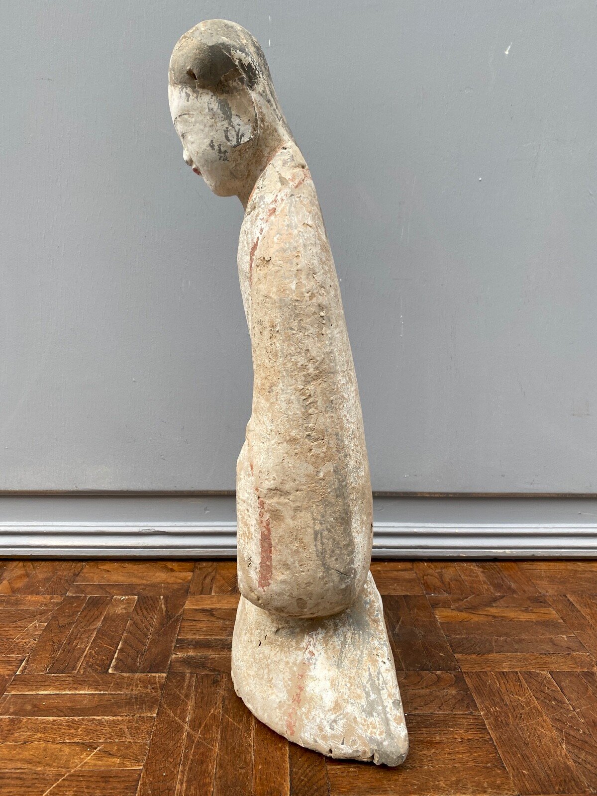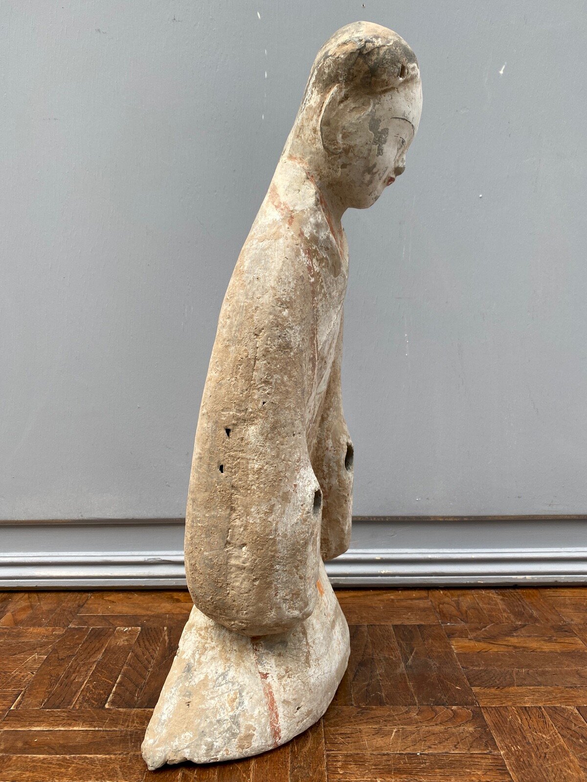 China kneeling court lady in gray terracotta M684 This is a kneeling court lady in gray terracotta, most likely from the Han dynasty. She is ancient and has her original patina. She has not undergone any restoration and is in a natural state; we conducted a basic cleaning. We note some abrasions and signs of wear on the material and decorations, a probable loss in the hands, and minor losses in various places, all of which are visible in the photos. Nevertheless, the subject remains in good condition. For the state, please refer to the detailed photos. The photos are an integral part of the description. Dimensions: Height: 48 cm Width: 25 cm Depth: 12.5 cm Weight: 3.75 kg P: 1695912 I remain at your disposal for any questions. Please feel free to contact me for any information. Authenticity: Unknown Weight: 3.75 kilograms Period: XIX and before Height: 48 cm Material: Terracotta Length: 0 Features: High relief, On a base Width: 25 cm Type: Sculpture Dimension (cm): From 31 to 50 Theme: Character Country of origin: China