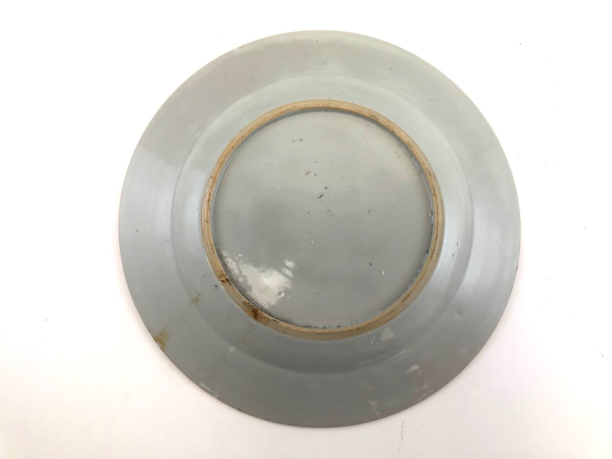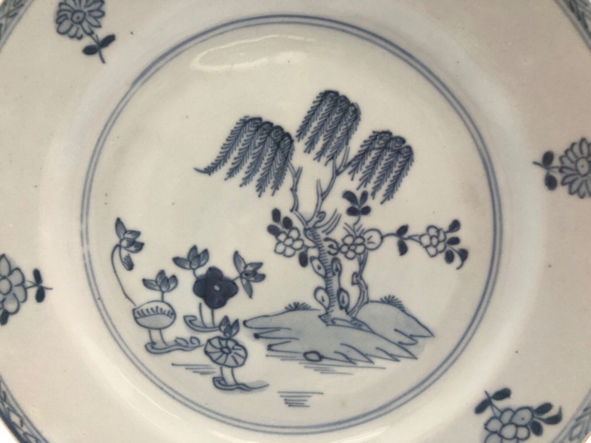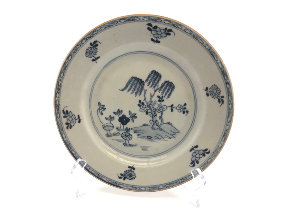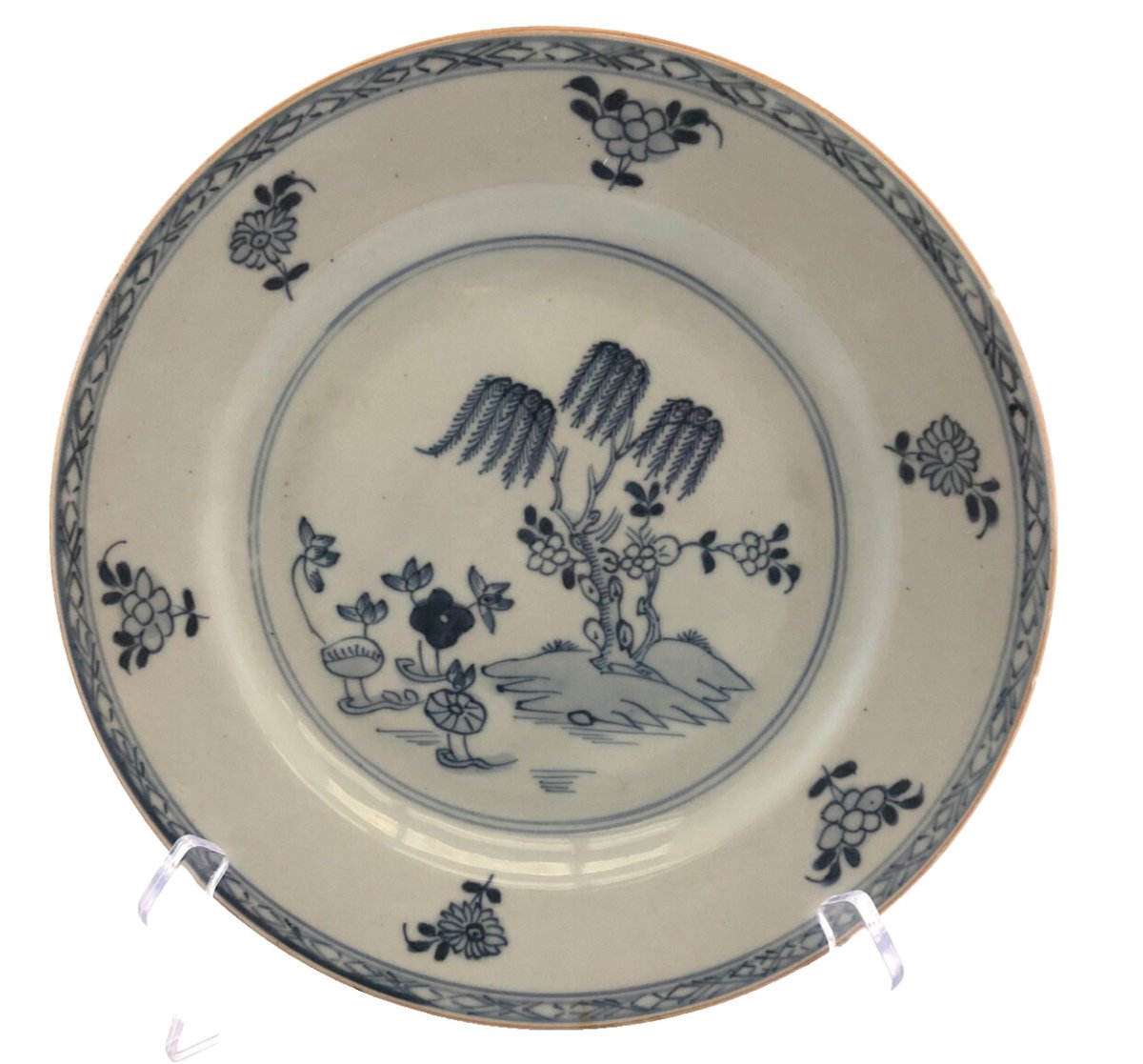 Blue painted porcelain plate with an underglaze decoration featuring willow and lotus. On the rim, a frieze of checkered patterns and floral cartouches. China, Yongzheng period (1723-1795) Diameter: 23 cm. Condition: The plate is in good condition. Type: Showcase object, Decorative Origin: China Subtype: Plate Country of origin: China Material: Porcelain Style: Qing / Ancient China Width: 23